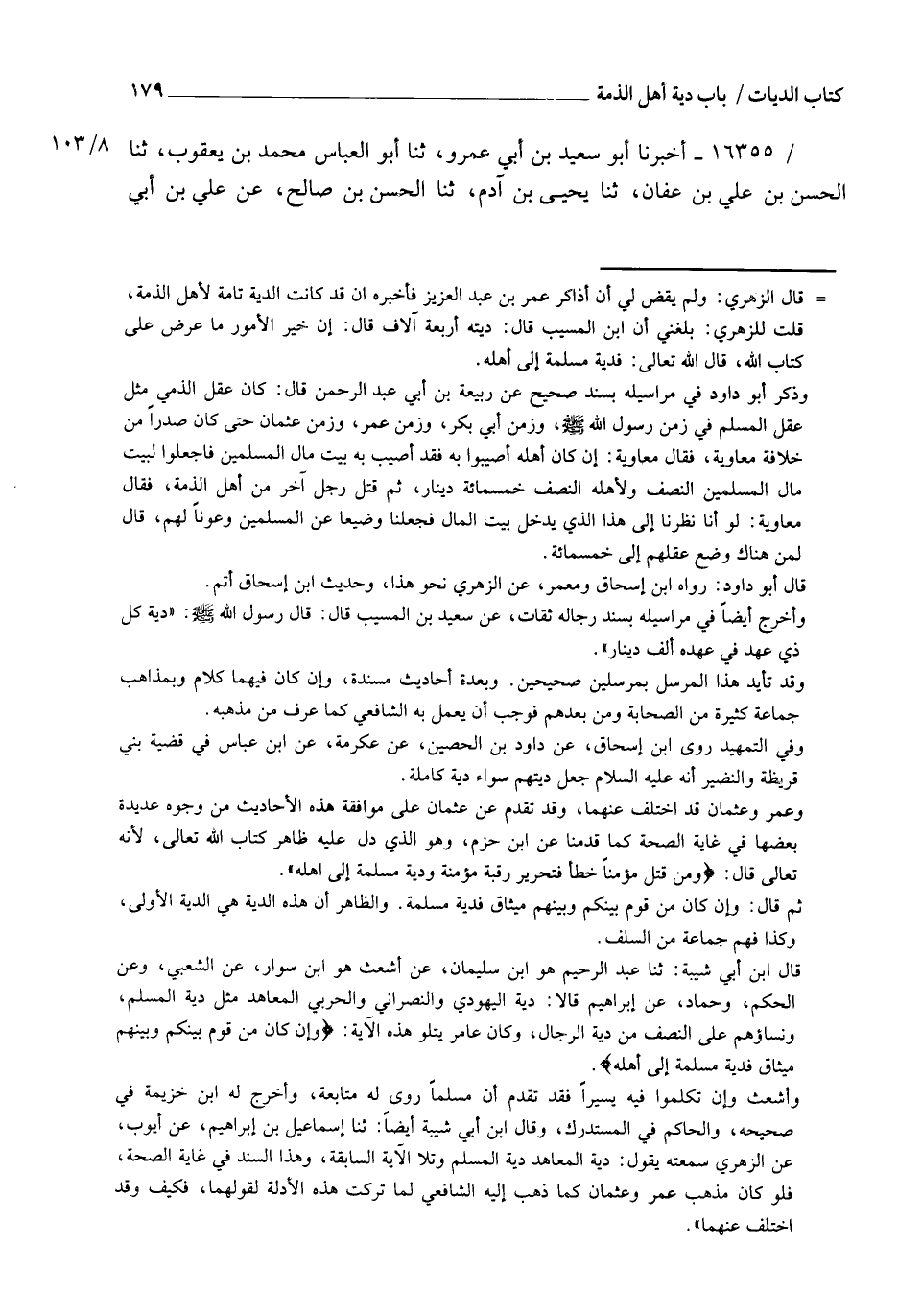 16355 - أَخْبَرَنَا أَبُو سَعِيدِ بْنُ أَبِي عَمْرٍو، ثنا أَبُو الْعَبَّاسِ مُحَمَّدُ بْنُ يَعْقُوبَ، ثنا الْحَسَنُ بْنُ عَلِيِّ بْنِ عَفَّانَ، ثنا يَحْيَى بْنُ آدَمَ، ثنا الْحَسَنُ بْنُ صَالِحٍ، عَنْ عَلِيِّ بْنِ أَبِي -[180]- طَلْحَةَ، عَنِ الْقَاسِمِ بْنِ عَبْدِ الرَّحْمَنِ، عَنْ عَبْدِ اللهِ بْنِ مَسْعُودٍ، رَضِيَ اللهُ عَنْهُ قَالَ: §مَنْ كَانَ لَهُ عَهْدٌ أَوْ ذِمَّةٌ فَدِيَتُهُ دِيَةُ الْمُسْلِمِ هَذَا مُنْقَطِعٌ وَمَوْقُوفٌ