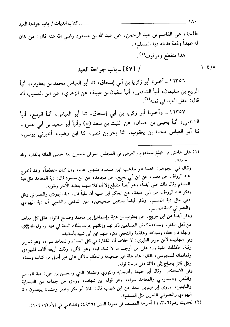 16356 - أَخْبَرَنَا أَبُو زَكَرِيَّا بْنُ أَبِي إِسْحَاقَ، ثنا أَبُو الْعَبَّاسِ مُحَمَّدُ بْنُ يَعْقُوبَ، أنبأ الرَّبِيعُ بْنُ سُلَيْمَانَ، أنبأ الشَّافِعِيُّ، أنبأ سُفْيَانُ بْنُ عُيَيْنَةَ، عَنِ الزُّهْرِيِّ، عَنِ ابْنِ الْمُسَيِّبِ، أَنَّهُ قَالَ: §عَقْلُ الْعَبْدِ فِي ثَمَنِهِ