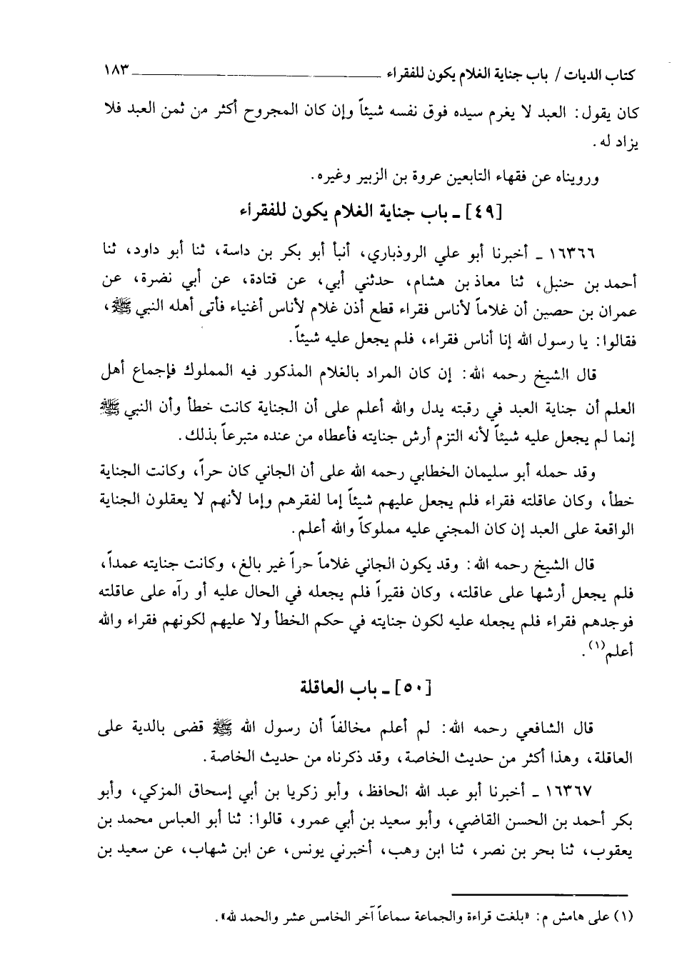16366 - أَخْبَرَنَا أَبُو عَلِيٍّ الرُّوذْبَارِيُّ، أنبأ أَبُو بَكْرِ بْنُ دَاسَةَ، ثنا أَبُو دَاوُدَ، ثنا أَحْمَدُ بْنُ حَنْبَلٍ، ثنا مُعَاذُ بْنُ هِشَامٍ، حَدَّثَنِي أَبِي، عَنْ قَتَادَةَ، عَنْ أَبِي نَضْرَةَ، عَنْ عِمْرَانَ بْنِ حُصَيْنٍ، أَنَّ §غُلَامًا لِأُنَاسٍ فُقَرَاءَ قَطَعَ أُذُنَ غُلَامٍ لِأُنَاسٍ أَغْنِيَاءَ، فَأَتَى أَهْلُهُ النَّبِيَّ صَلَّى اللهُ عَلَيْهِ وَسَلَّمَ، فَقَالُوا: يَا رَسُولَ اللهِ، إِنَّا أُنَاسٌ فُقَرَاءُ، فَلَمْ يَجْعَلْ عَلَيْهِ شَيْئًا قَالَ الشَّيْخُ رَحِمَهُ اللهُ: إِنْ كَانَ الْمُرَادُ بِالْغُلَامِ الْمَذْكُورِ فِيهِ الْمَمْلُوكَ فَإِجْمَاعُ أَهْلِ الْعِلْمِ عَلَى أَنَّ جِنَايَةَ الْعَبْدِ فِي رَقَبَتِهِ يَدُلُّ وَاللهُ أَعْلَمُ عَلَى أَنَّ الْجِنَايَةَ كَانَتْ خَطَأً، وَأَنَّ النَّبِيَّ صَلَّى اللهُ عَلَيْهِ وَسَلَّمَ إِنَّمَا لَمْ يَجْعَلْ عَلَيْهِ شَيْئًا؛ لِأَنَّهُ الْتَزَمَ أَرْشَ جِنَايَتِهِ فَأَعْطَاهُ مِنْ عِنْدِهِ مُتَبَرِّعًا بِذَلِكَ وَقَدْ حَمَلَهُ أَبُو سُلَيْمَانَ الْخَطَّابِيُّ رَحِمَهُ اللهُ عَلَى أَنَّ الْجَانِيَ كَانَ حُرًّا، وَكَانَتِ الْجِنَايَةُ خَطَأً، وَكَانَ عَاقِلَتُهُ فُقَرَاءَ، فَلَمْ يَجْعَلْ عَلَيْهِمْ شَيْئًا، إِمَّا لِفَقْرِهِمْ، وَإِمَّا لِأَنَّهُمْ لَا يَعْقِلُونَ الْجِنَايَةَ الْوَاقِعَةَ عَلَى الْعَبْدِ إِنْ كَانَ الْمَجْنِيُّ عَلَيْهِ مَمْلُوكًا وَاللهُ أَعْلَمُ قَالَ الشَّيْخُ رَحِمَهُ اللهُ: وَقَدْ يَكُونُ الْجَانِي غُلَامًا حُرًّا غَيْرَ بَالِغٍ، وَكَانَتْ جِنَايَتُهُ عَمْدًا، فَلَمْ يَجْعَلْ أَرْشَهَا عَلَى عَاقِلَتِهِ، وَكَانَ فَقِيرًا فَلَمْ يَجْعَلْهُ فِي الْحَالِ عَلَيْهِ، أَوْ رَآهُ عَلَى عَاقِلَتِهِ فَوَجَدَهُمْ فُقَرَاءَ فَلَمْ يَجْعَلْهُ عَلَيْهِ لِكَوْنِ جِنَايَتِهِ فِي حُكْمِ الْخَطَأِ، وَلَا عَلَيْهِمْ لِكَوْنِهِمْ فُقَرَاءَ، وَاللهُ أَعْلَمُ