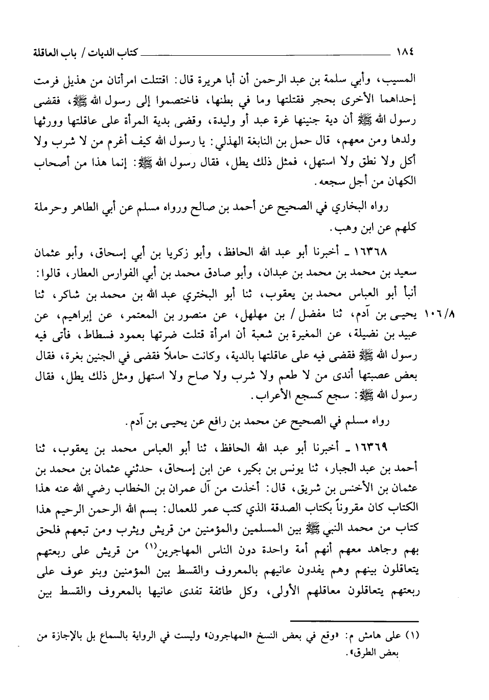 16369 - أَخْبَرَنَا أَبُو عَبْدِ اللهِ الْحَافِظُ، ثنا أَبُو الْعَبَّاسِ مُحَمَّدُ بْنُ يَعْقُوبَ، ثنا أَحْمَدُ بْنُ عَبْدِ الْجَبَّارِ، ثنا يُونُسُ بْنُ بُكَيْرٍ، عَنِ ابْنِ إِسْحَاقَ، حَدَّثَنِي عُثْمَانُ بْنُ مُحَمَّدِ بْنِ عُثْمَانَ بْنِ الْأَخْنَسِ بْنِ شَرِيقٍ، قَالَ: أَخَذْتُ مِنْ آلِ عُمَرَ بْنِ الْخَطَّابِ رَضِيَ اللهُ عَنْهُ هَذَا الْكِتَابَ، كَانَ مَقْرُونًا بِكِتَابِ الصَّدَقَةِ الَّذِي كَتَبَ عُمَرُ لِلْعُمَّالِ: " بِسْمِ اللهِ الرَّحْمَنِ الرَّحِيمِ، هَذَا كِتَابٌ مِنْ مُحَمَّدٍ النَّبِيِّ صَلَّى اللهُ عَلَيْهِ وَسَلَّمَ بَيْنَ الْمُسْلِمِينَ وَالْمُؤْمِنِينَ مِنْ قُرَيْشٍ وَيَثْرِبَ وَمَنْ تَبِعَهُمْ فَلَحِقَ بِهِمْ وَجَاهَدَ مَعَهُمْ، أَنَّهُمْ أُمَّةٌ وَاحِدَةٌ دُونَ النَّاسِ، الْمُهَاجِرِونَ مِنْ قُرَيْشٍ عَلَى رَبْعَتِهِمْ يَتَعَاقَلُونَ بَيْنَهُمْ وَهُمْ يَفِدُونَ عَانِيَهُمْ بِالْمَعْرُوفِ وَالْقِسْطِ بَيْنَ الْمُؤْمِنِينَ وَبَنُو عَوْفٍ عَلَى رَبْعَتِهِمْ يَتَعَاقَلُونَ مَعَاقِلَهُمُ الْأُولَى، وَكُلُّ طَائِفَةٍ تَفْدِي عَانِيَهَا بِالْمَعْرُوفِ وَالْقِسْطِ بَيْنَ -[185]- الْمُؤْمِنِينَ " ثُمَّ ذَكَرَ عَلَى هَذَا النَّسَقِ بَنِي الْحَارِثِ، ثُمَّ بَنِي سَاعِدَةَ، ثُمَّ بَنِي جُشَمَ، ثُمَّ بَنِي النَّجَّارِ، ثُمَّ بَنِي عَمْرِو بْنِ عَوْفٍ، ثُمَّ بَنِي النَّبِيتِ، ثُمَّ بَنِي الْأَوْسِ، ثُمَّ قَالَ: " وَإِنَّ §الْمُؤْمِنِينَ لَا يَتْرُكُونَ مُفْرَحًا مِنْهُمْ أَنْ يُعْطُوهُ بِالْمَعْرُوفِ فِي فِدَاءٍ أَوْ عَقْلٍ "