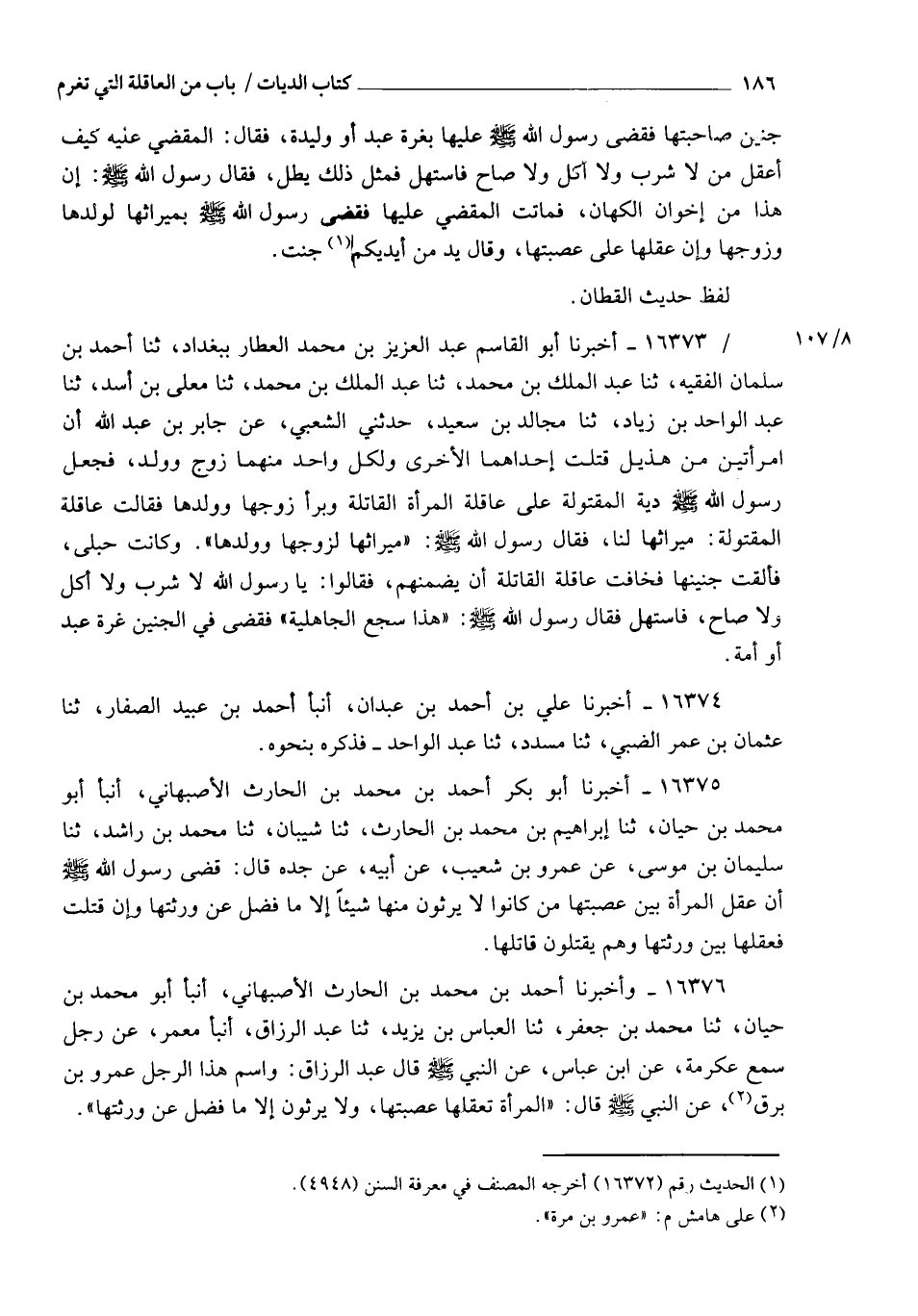16375 - أَخْبَرَنَا أَبُو بَكْرٍ أَحْمَدُ بْنُ مُحَمَّدِ بْنِ الْحَارِثِ الْأَصْبَهَانِيُّ، أنبأ أَبُو مُحَمَّدِ بْنُ حَيَّانَ، ثنا إِبْرَاهِيمُ بْنُ مُحَمَّدِ بْنِ الْحَارِثِ، ثنا شَيْبَانُ، ثنا مُحَمَّدُ بْنُ رَاشِدٍ، ثنا سُلَيْمَانُ بْنُ مُوسَى، عَنْ عَمْرِو بْنِ شُعَيْبٍ، عَنْ أَبِيهِ، عَنْ جَدِّهِ، قَالَ: قَضَى رَسُولُ اللهِ صَلَّى اللهُ عَلَيْهِ وَسَلَّمَ: أَنَّ §عَقْلَ الْمَرْأَةِ بَيْنَ عَصَبَتِهَا مَنْ كَانُوا لَا يَرِثُونَ مِنْهَا شَيْئًا إِلَّا مَا فَضَلَ عَنْ وَرَثَتِهَا، وَإِنْ قُتِلَتْ فَعَقْلُهَا بَيْنَ وَرَثَتِهَا، وَهُمْ يَقْتُلُونَ قَاتِلَهَا