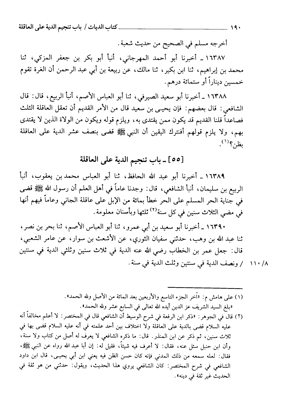 16389 - أَخْبَرَنَا أَبُو عَبْدِ اللهِ الْحَافِظُ، ثنا أَبُو الْعَبَّاسِ مُحَمَّدُ بْنُ يَعْقُوبَ، أنبأ الرَّبِيعُ بْنُ سُلَيْمَانَ، أنبأ الشَّافِعِيُّ، قَالَ: وَجَدْنَا عَامًّا فِي أَهْلِ الْعِلْمِ أَنَّ رَسُولَ اللهِ صَلَّى اللهُ عَلَيْهِ وَسَلَّمَ: قَضَى فِي §جِنَايَةِ الْحُرِّ الْمُسْلِمِ عَلَى الْحُرِّ خَطَأً بِمِائَةٍ مِنَ الْإِبِلِ عَلَى عَاقِلَةِ الْجَانِي، وَعَامًّا فِيهِمْ أَنَّهَا فِي مُضِيِّ الثَّلَاثِ سِنِينَ، فِي كُلِّ سَنَةٍ ثُلُثُهَا، وَبِأَسْنَانٍ مَعْلُومَةٍ