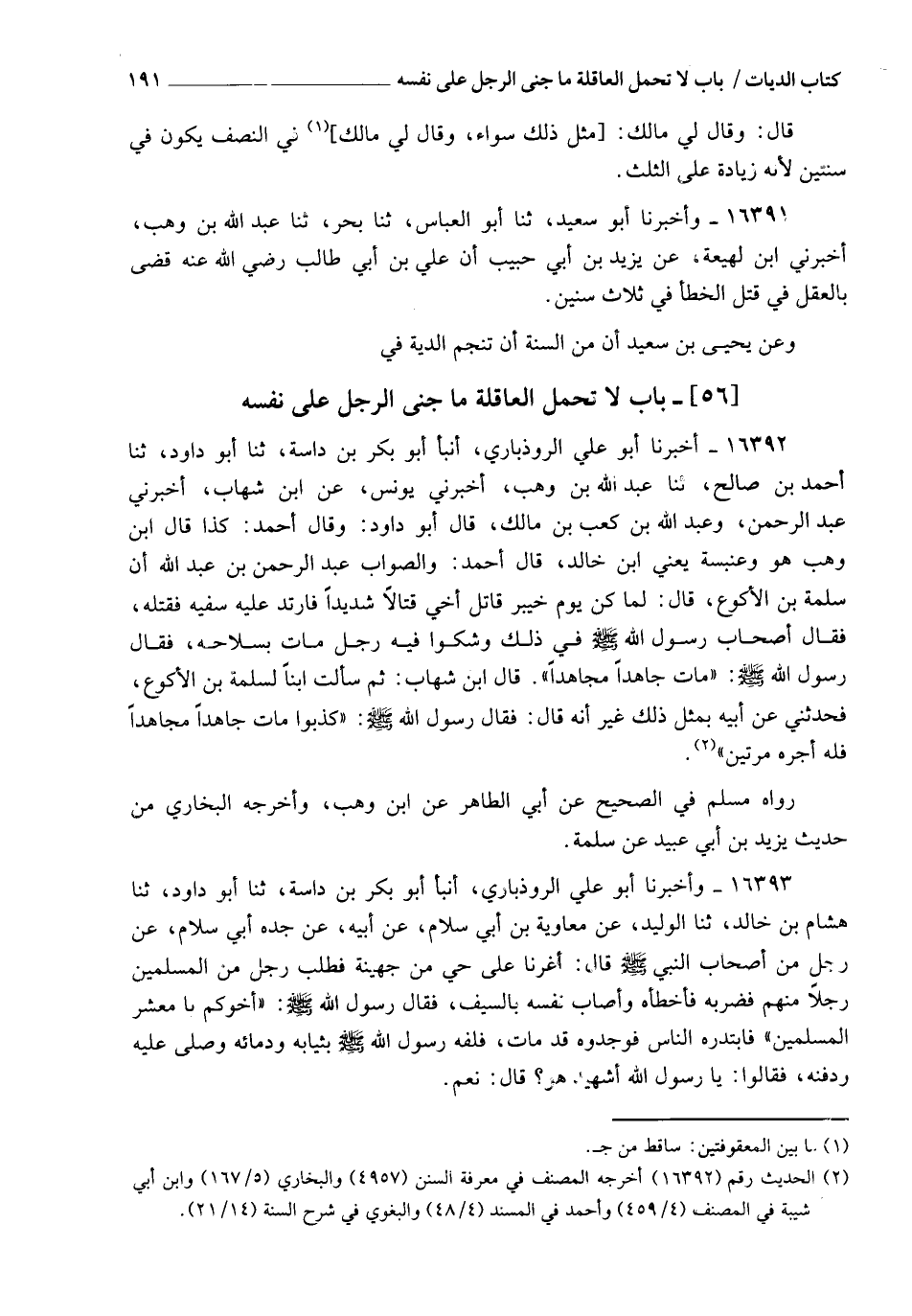 16391 - وَأَخْبَرَنَا أَبُو سَعِيدٍ، ثنا أَبُو الْعَبَّاسِ، ثنا بَحْرٌ، ثنا عَبْدُ اللهِ بْنُ وَهْبٍ، أَخْبَرَنِي ابْنُ لَهِيعَةَ، عَنْ يَزِيدَ بْنِ أَبِي حَبِيبٍ، أَنَّ عَلِيَّ بْنَ أَبِي طَالِبٍ، رَضِيَ اللهُ عَنْهُ، §قَضَى بِالْعَقْلِ فِي قَتْلِ الْخَطَأِ فِي ثَلَاثِ سِنِينَ وَعَنْ يَحْيَى بْنِ سَعِيدٍ، أَنَّ مِنَ السُّنَّةِ أَنْ تُنَجَّمَ الدِّيَةُ فِي ثَلَاثِ سِنِينَ