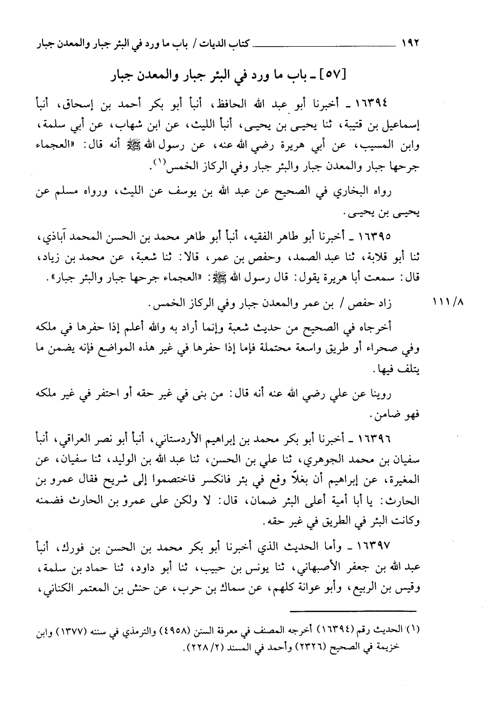 16395 - أَخْبَرَنَا أَبُو طَاهِرٍ الْفَقِيهُ، أنبأ أَبُو طَاهِرٍ مُحَمَّدُ بْنُ الْحَسَنِ الْمُحَمَّدَآبَاذِيُّ، ثنا أَبُو قِلَابَةَ، ثنا عَبْدُ الصَّمَدِ، وَحَفْصُ بْنُ عُمَرَ، قَالَا: ثنا شُعْبَةُ، عَنْ مُحَمَّدِ بْنِ زِيَادٍ، قَالَ: سَمِعْتُ أَبَا هُرَيْرَةَ، يَقُولُ: قَالَ رَسُولُ اللهِ صَلَّى اللهُ عَلَيْهِ وَسَلَّمَ: §" الْعَجْمَاءُ جَرْحُهَا جُبَارٌ، وَالْبِئْرُ جُبَارٌ " زَادَ حَفْصُ بْنُ عُمَرَ: " وَالْمَعْدِنُ جُبَارٌ، وَفِي الرِّكَازِ الْخُمُسُ " أَخْرَجَاهُ فِي الصَّحِيحِ مِنْ حَدِيثِ شُعْبَةَ، وَإِنَّمَا أَرَادَ بِهِ، وَاللهُ أَعْلَمُ، إِذَا حَفَرَهَا فِي مِلْكِهِ وَفِي صَحْرَاءَ أَوْ طَرِيقٍ وَاسِعَةٍ مُحْتَمَلَةٍ، فَأَمَّا إِذَا حَفَرَهَا فِي غَيْرِ هَذِهِ الْمَوَاضِعِ فَإِنَّهُ يَضْمَنُ مَا يَتْلَفُ فِيهَا رُوِّينَا عَنْ عَلِيٍّ رَضِيَ اللهُ عَنْهُ، أَنَّهُ قَالَ: مَنْ بَنَى فِي غَيْرِ حَقِّهِ، أَوِ احْتَفَرَ فِي غَيْرِ مِلْكِهِ فَهُوَ ضَامِنٌ