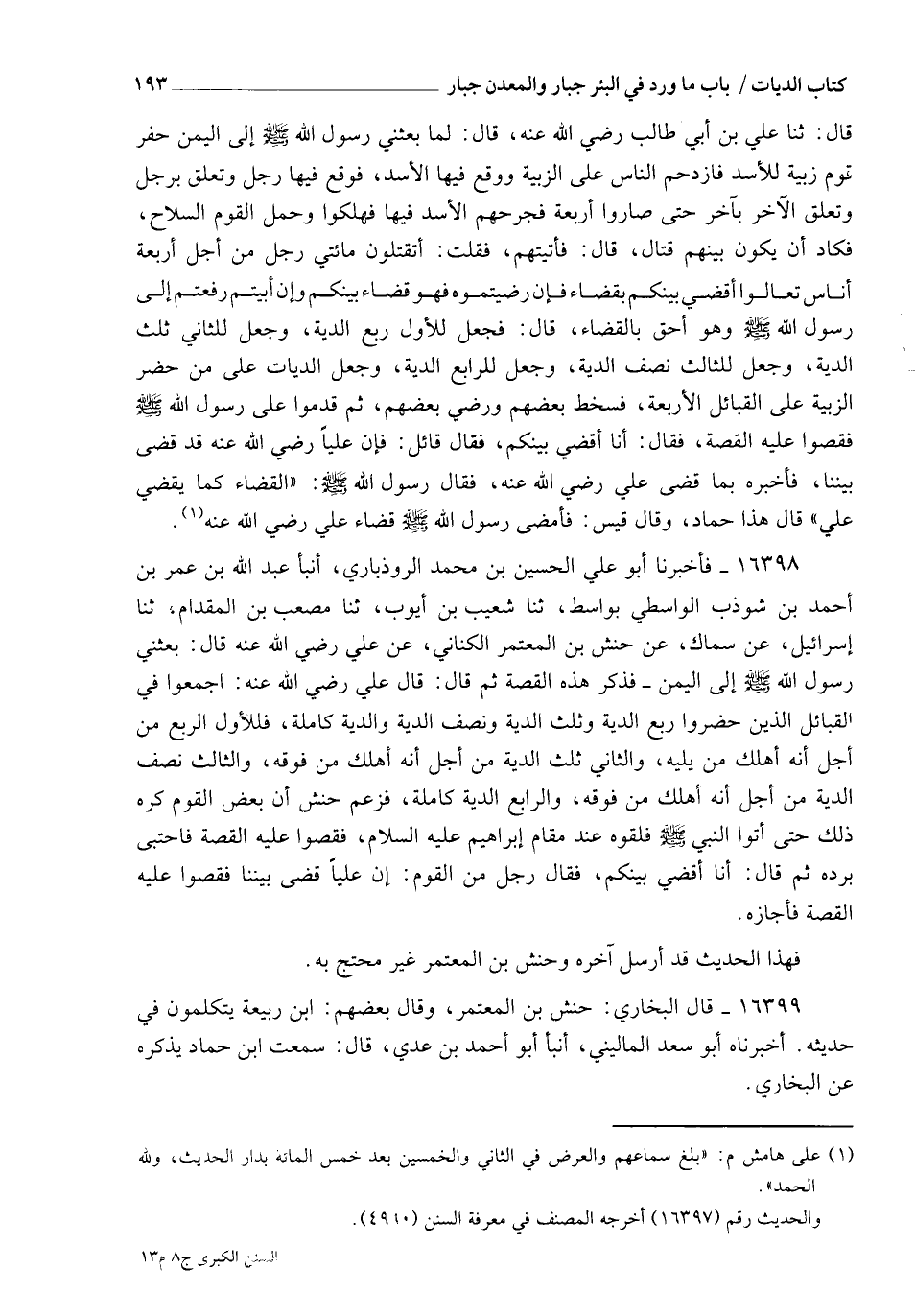 16398 - فَأَخْبَرَنَا أَبُو عَلِيٍّ الْحُسَيْنُ بْنُ مُحَمَّدٍ الرُّوذْبَارِيُّ، أنبأ عَبْدُ اللهِ بْنُ عُمَرَ بْنِ أَحْمَدَ بْنِ شَوْذَبٍ الْوَاسِطِيُّ، بِوَاسِطٍ، ثنا شُعَيْبُ بْنُ أَيُّوبَ، ثنا مُصْعَبُ بْنُ الْمِقْدَامِ، ثنا إِسْرَائِيلُ، عَنْ سِمَاكٍ، عَنْ حَنَشِ بْنِ الْمُعْتَمِرِ الْكِنَانِيِّ، عَنْ عَلِيٍّ، رَضِيَ اللهُ عَنْهُ، قَالَ: بَعَثَنِي رَسُولُ اللهِ صَلَّى اللهُ عَلَيْهِ وَسَلَّمَ إِلَى الْيَمَنِ، فَذَكَرَ هَذِهِ الْقِصَّةَ، ثُمَّ قَالَ: قَالَ عَلِيٌّ رَضِيَ اللهُ عَنْهُ: §اجْمَعُوا فِي الْقَبَائِلِ الَّذِينَ حَضَرُوا رُبُعَ الدِّيَةِ، وَثُلُثَ الدِّيَةِ، وَنِصْفَ الدِّيَةِ، وَالدِّيَةَ كَامِلَةً، فَلِلْأَوَّلِ الرُّبُعُ مِنْ أَجْلِ أَنَّهُ أَهْلَكَ مَنْ يَلِيهِ، وَالثَّانِي ثُلُثُ الدِّيَةِ مِنْ أَجْلِ أَنَّهُ أَهْلَكَ مَنْ فَوْقَهُ، وَالثَّالِثُ نِصْفُ الدِّيَةِ مِنْ أَجْلِ أَنَّهُ أَهْلَكَ مَنْ فَوْقَهُ، وَالرَّابِعُ الدِّيَةُ كَامِلَةً فَزَعَمَ حَنَشٌ أَنَّ بَعْضَ الْقَوْمِ كَرِهَ ذَلِكَ، حَتَّى أَتَوَا النَّبِيَّ صَلَّى اللهُ عَلَيْهِ وَسَلَّمَ: فَلَقُوهُ عِنْدَ مَقَامِ إِبْرَاهِيمَ عَلَيْهِ السَّلَامُ، فَقَصُّوا عَلَيْهِ الْقِصَّةَ فَاحْتَبَى بُرْدَهُ، ثُمَّ قَالَ: " أَنَا أَقْضِي بَيْنَكُمْ " فَقَالَ رَجُلٌ مِنَ الْقَوْمِ: إِنَّ عَلِيًّا قَضَى بَيْنَنَا، فَقَصُّوا عَلَيْهِ الْقِصَّةَ فَأَجَازَهُ فَهَذَا الْحَدِيثُ قَدْ أُرْسِلَ آخِرُهُ، وَحَنَشُ بْنُ الْمُعْتَمِرِ غَيْرُ مُحْتَجٍّ بِهِ