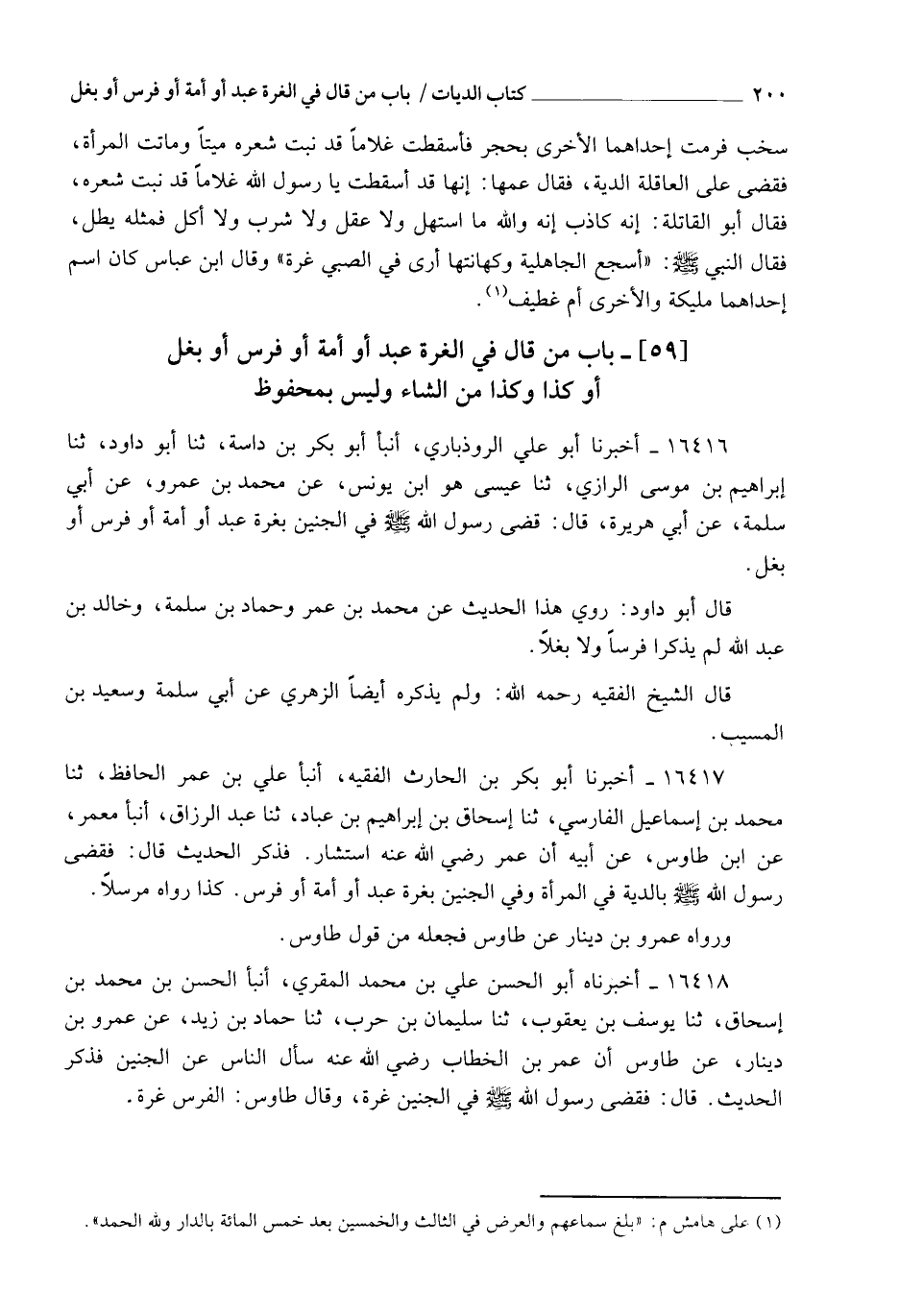 16418 - أَخْبَرْنَاهُ أَبُو الْحَسَنِ عَلِيُّ بْنُ مُحَمَّدٍ الْمُقْرِئُ، أنبأ الْحَسَنُ بْنُ مُحَمَّدِ بْنِ إِسْحَاقَ، ثنا يُوسُفُ بْنُ يَعْقُوبَ، ثنا سُلَيْمَانُ بْنُ حَرْبٍ، ثنا حَمَّادُ بْنُ زَيْدٍ، عَنْ عَمْرِو بْنِ دِينَارٍ، عَنْ طَاوُسٍ، أَنَّ عُمَرَ بْنَ الْخَطَّابِ، رَضِيَ اللهُ عَنْهُ، سَأَلَ النَّاسَ عَنِ الْجَنِينِ، فَذَكَرَ الْحَدِيثَ، قَالَ: فَقَضَى رَسُولُ اللهِ صَلَّى اللهُ عَلَيْهِ وَسَلَّمَ §فِي الْجَنِينِ غُرَّةً وَقَالَ طَاوُسٌ: الْفَرَسُ غُرَّةٌ