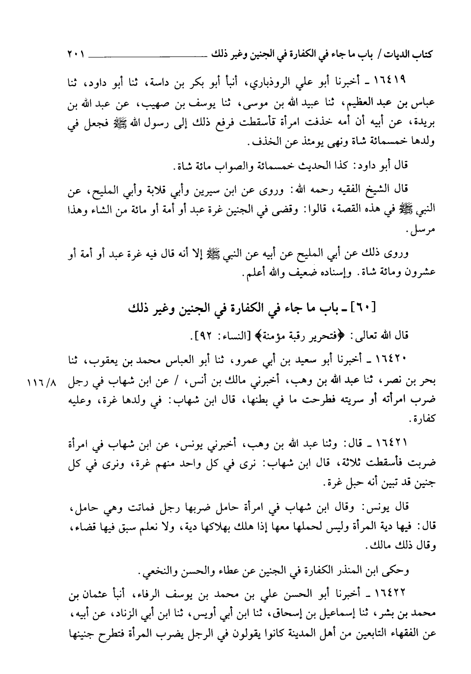 16420 - أَخْبَرَنَا أَبُو سَعِيدِ بْنُ أَبِي عَمْرٍو، ثنا أَبُو الْعَبَّاسِ مُحَمَّدُ بْنُ يَعْقُوبَ، ثنا بَحْرُ بْنُ نَصْرٍ، ثنا عَبْدُ اللهِ بْنُ وَهْبٍ، أَخْبَرَنِي مَالِكُ بْنُ أَنَسٍ، عَنِ ابْنِ شِهَابٍ، فِي §رَجُلٍ ضَرَبَ امْرَأَتَهُ أَوْ سُرِّيَّتَهُ، فَطَرَحَتْ مَا فِي بَطْنِهَا، قَالَ ابْنُ شِهَابٍ: فِي وَلَدِهَا غُرَّةٌ، وَعَلَيْهِ كَفَّارَةٌ،