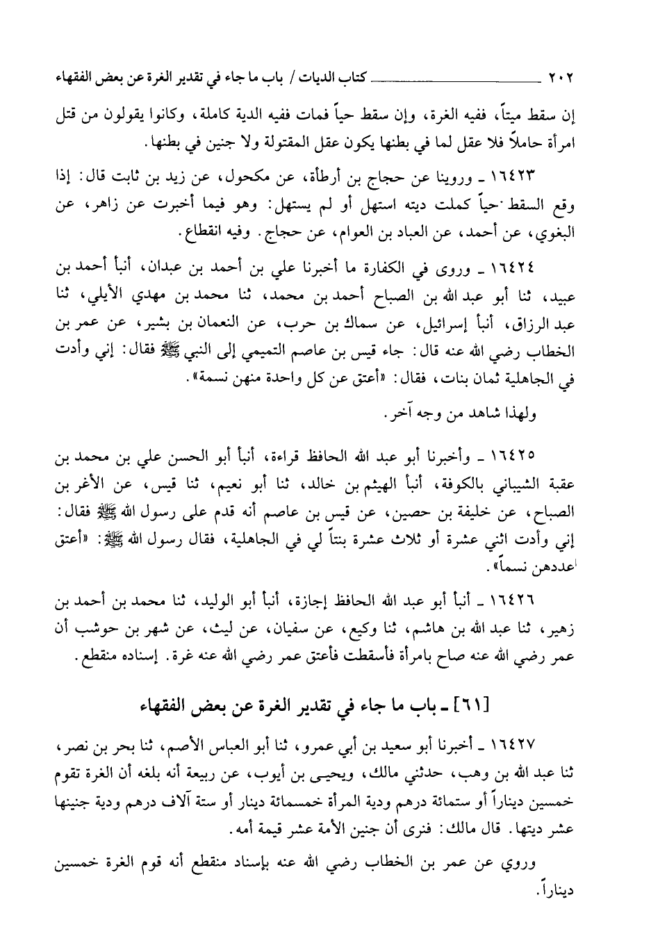 16426 - أنبأني أَبُو عَبْدِ اللهِ الْحَافِظُ، إِجَازَةً، أنبأ أَبُو الْوَلِيدِ، ثنا مُحَمَّدُ بْنُ أَحْمَدَ بْنِ زُهَيْرٍ، ثنا عَبْدُ اللهِ بْنُ هَاشِمٍ، ثنا وَكِيعٌ، عَنْ سُفْيَانَ، عَنْ لَيْثٍ، عَنْ شَهْرِ بْنِ حَوْشَبٍ، أَنَّ عُمَرَ، رَضِيَ اللهُ عَنْهُ، §صَاحَ بِامْرَأَةٍ فَأَسْقَطَتْ، فَأَعْتَقَ عُمَرُ رَضِيَ اللهُ عَنْهُ غُرَّةً إِسْنَادُهُ مُنْقَطِعٌ