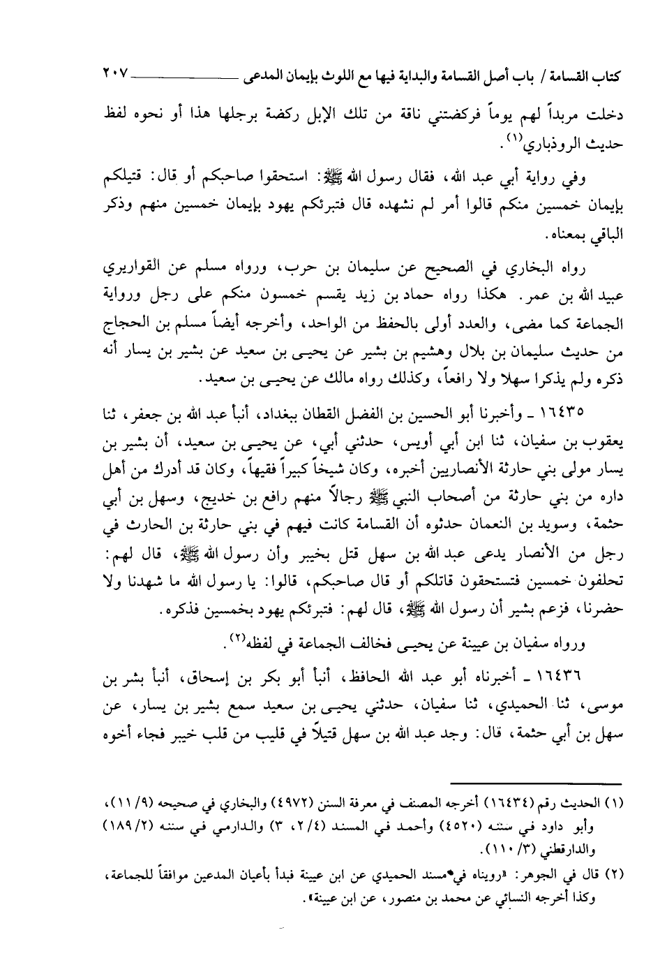 16436 - أَخْبَرَنَاهُ أَبُو عَبْدِ اللهِ الْحَافِظُ، أنبأ أَبُو بَكْرِ بْنُ إِسْحَاقَ، أنبأ بِشْرُ بْنُ مُوسَى، ثنا الْحُمَيْدِيُّ، ثنا سُفْيَانُ، حَدَّثَنِي يَحْيَى بْنُ سَعِيدٍ، سَمِعَ بَشِيرَ بْنَ يَسَارٍ، عَنْ سَهْلِ بْنِ أَبِي حَثْمَةَ، قَالَ: وُجِدَ عَبْدُ اللهِ بْنُ سَهْلٍ قَتِيلًا فِي قَلِيبٍ مِنْ قُلُبِ خَيْبَرَ، فَجَاءَ أَخُوهُ -[208]- عَبْدُ الرَّحْمَنِ بْنُ سَهْلٍ وَعَمَّاهُ حُوَيِّصَةُ، وَمُحَيِّصَةُ، فَذَهَبَ عَبْدُ الرَّحْمَنِ يَتَكَلَّمُ عِنْدَ النَّبِيِّ صَلَّى اللهُ عَلَيْهِ وَسَلَّمَ، فَقَالَ النَّبِيُّ صَلَّى اللهُ عَلَيْهِ وَسَلَّمَ: " الْكُبْرَ الْكُبْرَ " فَتَكَلَّمَ أَحَدُ عَمَّيْهِ الْكَبِيرُ مِنْهُمَا، إِمَّا حُوَيِّصَةُ، وَإِمَّا مُحَيِّصَةُ، فَقَالَ: يَا رَسُولَ اللهِ إِنَّا وَجَدْنَا عَبْدَ اللهِ، قَتِيلًا فِي قَلِيبٍ مِنْ قُلُبِ خَيْبَرَ، فَذَكَرَ يَهُودَ وَعَدَاوَتِهُمْ وَشَرَّهُمْ، قَالَ: §" أَفَتُبْرِئُكُمْ يَهُودُ بِخَمْسِينَ يَمِينًا يَحْلِفُونَ أَنَّهُمْ لَمْ يَقْتُلُوهُ؟ " قَالُوا: وَكَيْفَ نَرْضَى بِأَيْمَانِهِمْ وَهُمْ مُشْرِكُونَ؟ قَالَ: " فَيُقْسِمُ مِنْكُمْ خَمْسُونَ أَنَّهُمْ قَتَلُوهُ؟ " قَالُوا: وَكَيْفَ نُقْسِمُ عَلَى مَا لَمْ نَرَهُ؟ قَالَ: فَوَدَاهُ رَسُولُ اللهِ صَلَّى اللهُ عَلَيْهِ وَسَلَّمَ مِنْ عِنْدِهِ رَوَاهُ مُسْلِمٌ، عَنْ عَمْرِو بْنِ مُحَمَّدٍ النَّاقِدِ، عَنْ سُفْيَانَ، إِلَّا أَنَّهُ لَمْ يَسُقْ مَتْنَهُ، وَأَحَالَ بِهِ عَلَى رِوَايَةِ الْجَمَاعَةِ،