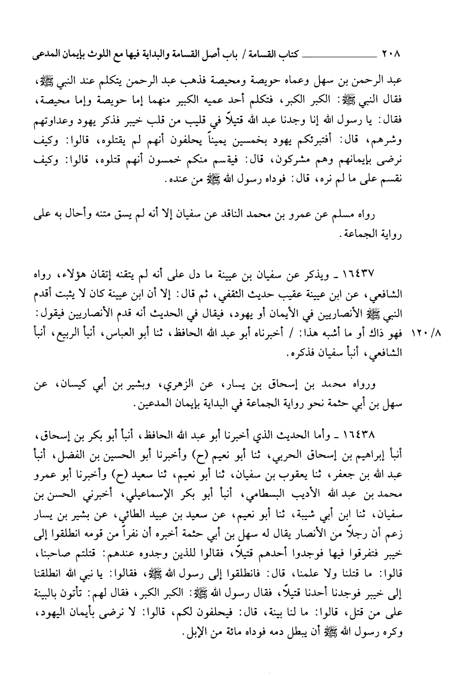 16438 - وَأَمَّا الْحَدِيثُ الَّذِي أَخْبَرَنَا أَبُو عَبْدِ اللهِ الْحَافِظُ، أنبأ أَبُو بَكْرِ بْنُ إِسْحَاقَ، أنبأ إِبْرَاهِيمُ بْنُ إِسْحَاقَ الْحَرْبِيُّ، ثنا أَبُو نُعَيْمٍ، ح وَأَخْبَرَنَا أَبُو الْحُسَيْنِ بْنُ الْفَضْلِ، أنبأ عَبْدُ اللهِ بْنُ جَعْفَرٍ، ثنا يَعْقُوبُ بْنُ سُفْيَانَ، ثنا أَبُو نُعَيْمٍ، ثنا سَعِيدٌ، ح وَأَخْبَرَنَا أَبُو عَمْرٍو مُحَمَّدُ بْنُ عَبْدِ اللهِ الْأَدِيبُ الْبِسْطَامِيُّ، أنبأ أَبُو بَكْرٍ الْإِسْمَاعِيلِيُّ، أَخْبَرَنِي الْحَسَنُ بْنُ سُفْيَانَ، ثنا ابْنُ أَبِي شَيْبَةَ، ثنا أَبُو نُعَيْمٍ، عَنْ سَعِيدِ بْنِ عُبَيْدٍ الطَّائِيِّ، عَنْ بَشِيرِ بْنِ يَسَارٍ، زَعَمَ أَنَّ رَجُلًا، مِنَ الْأَنْصَارِ يُقَالُ لَهُ: سَهْلُ بْنُ أَبِي حَثْمَةَ، أَخْبَرَهُ أَنَّ نَفَرًا مِنْ قَوْمِهِ انْطَلَقُوا إِلَى خَيْبَرَ فَتَفَرَّقُوا فِيهَا، فَوَجَدُوا أَحَدَهُمْ قَتِيلًا، فَقَالُوا لِلَّذِينَ وَجَدُوهُ عِنْدَهُمْ: قَتَلْتُمْ صَاحِبَنَا؟ قَالُوا: مَا قَتَلْنَا وَلَا عَلِمْنَا، قَالَ: فَانْطَلَقُوا إِلَى رَسُولِ اللهِ صَلَّى اللهُ عَلَيْهِ وَسَلَّمَ فَقَالُوا: يَا نَبِيَّ اللهِ انْطَلَقْنَا إِلَى خَيْبَرَ فَوَجَدْنَا أَحَدَنَا قَتِيلًا، فَقَالَ رَسُولُ اللهِ صَلَّى اللهُ عَلَيْهِ وَسَلَّمَ: " الْكُبْرَ الْكُبْرَ" فَقَالَ لَهُمْ: " §تَأْتُونَ بِالْبَيِّنَةِ عَلَى مَنْ قَتَلَ؟ " قَالُوا: مَا لَنَا بَيِّنَةٌ، قَالَ: " فَيَحْلِفُونَ لَكُمْ؟ " قَالُوا: لَا نَرْضَى بِأَيْمَانِ الْيَهُودِ وَكَرِهَ رَسُولُ اللهِ صَلَّى اللهُ عَلَيْهِ وَسَلَّمَ: أَنْ يُبْطِلَ دَمَهُ فَوَدَاهُ مِائَةً مِنَ الْإِبِلِ -[209]- لَفْظُ حَدِيثِ الْقَطَّانِ، وَفِي رِوَايَةِ غَيْرِهِ: فَوَدَاهُ بِمِائَةٍ مِنْ إِبِلِ الصَّدَقَةِ رَوَاهُ الْبُخَارِيُّ فِي الصَّحِيحِ، عَنْ أَبِي نُعَيْمٍ، وَأَخْرَجَهُ مُسْلِمٌ، مِنْ حَدِيثِ ابْنِ نُمَيْرٍ، عَنْ سَعِيدٍ، دُونَ سِيَاقَةِ مَتْنِهِ، وَإِنَّمَا لَمْ يَسُقْ مَتْنَهُ لِمُخَالَفَتِهِ رِوَايَةَ يَحْيَى بْنِ سَعِيدٍ، قَالَ مُسْلِمُ بْنُ الْحَجَّاجِ فِي جُمْلَةِ مَا قَالَ فِي هَذِهِ الرِّوَايَةِ: وَغَيْرُ مُشْكِلٍ عَلَى مَنْ عَقَلَ التَّمْيِيزَ مِنَ الْحُفَّاظِ أَنَّ يَحْيَى بْنَ سَعِيدٍ أَحْفَظُ مِنْ سَعِيدِ بْنِ عُبَيْدٍ وَأَرْفَعُ مِنْهُ شَأْنًا فِي طَرِيقِ الْعِلْمِ وَأَسْبَابِهِ، فَهُوَ أَوْلَى بِالْحِفْظِ مِنْهُ قَالَ الشَّيْخُ: وَإِنْ صَحَّتْ رِوَايَةُ سَعِيدٍ، فَهِيَ لَا تُخَالِفُ رِوَايَةَ يَحْيَى بْنِ سَعِيدٍ عَنْ بَشِيرِ بْنِ يَسَارٍ، لِأَنَّهُ قَدْ يُرِيدُ بِالْبَيِّنَةِ الْأَيْمَانَ مَعَ اللَّوْثِ كَمَا فَسَّرَهُ يَحْيَى بْنُ سَعِيدٍ، وَقَدْ يُطَالِبُهُمْ بِالْبَيِّنَةِ كَمَا فِي هَذِهِ الرِّوَايَةِ، ثُمَّ يَعْرِضُ عَلَيْهِمُ الْأَيْمَانَ مَعَ وُجُودِ اللَّوْثِ كَمَا فِي رِوَايَةِ يَحْيَى بْنِ سَعِيدٍ، ثُمَّ يَرُدُّهَا عَلَى الْمُدَّعَى عَلَيْهِمْ عِنْدَ نُكُولِ الْمُدَّعِينَ كَمَا فِي الرِّوَايَتَيْنِ