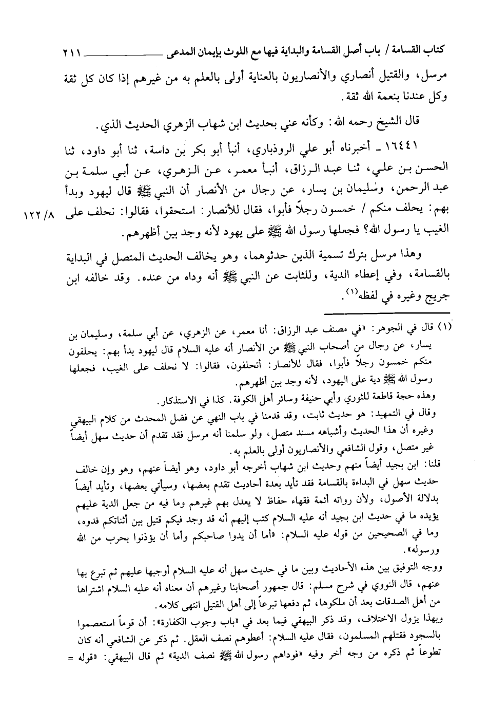 16441 - أَخْبَرَنَاهُ أَبُو عَلِيٍّ الرُّوذْبَارِيُّ، أنبأ أَبُو بَكْرِ بْنُ دَاسَةَ، ثنا أَبُو دَاوُدَ، ثنا الْحَسَنُ بْنُ عَلِيٍّ، ثنا عَبْدُ الرَّزَّاقِ، أنبأ مَعْمَرٌ، عَنِ الزُّهْرِيِّ، عَنْ أَبِي سَلَمَةَ بْنِ عَبْدِ الرَّحْمَنِ، وَسُلَيْمَانَ بْنِ يَسَارٍ، عَنْ رِجَالٍ، مِنَ الْأَنْصَارِ، أَنَّ النَّبِيَّ صَلَّى اللهُ عَلَيْهِ وَسَلَّمَ قَالَ لِيَهُودَ وَبَدَأَ بِهِمْ: " §يَحْلِفُ مِنْكُمْ خَمْسُونَ رَجُلًا؟ " فَأَبَوْا، فَقَالَ لِلْأَنْصَارِ: " اسْتَحِقُّوا " فَقَالُوا: نَحْلِفُ عَلَى الْغَيْبِ يَا رَسُولَ اللهِ؟ فَجَعَلَهَا رَسُولُ اللهِ صَلَّى اللهُ عَلَيْهِ وَسَلَّمَ عَلَى يَهُودَ، لِأَنَّهُ وُجِدَ بَيْنَ أَظْهُرِهِمْ وَهَذَا مُرْسَلٌ بِتَرْكِ تَسْمِيَةِ الَّذِينَ حَدَّثُوهُمَا، وَهُوَ يُخَالِفُ الْحَدِيثَ الْمُتَّصِلَ فِي الْبِدَايَةِ بِالْقَسَامَةِ، وَفِي إِعْطَاءِ الدِّيَةِ، وَالثَّابِتُ عَنِ النَّبِيِّ صَلَّى اللهُ عَلَيْهِ وَسَلَّمَ أَنَّهُ وَدَاهُ مِنْ عِنْدِهِ وَقَدْ خَالَفَهُ ابْنُ جُرَيْجٍ وَغَيْرُهُ فِي لَفْظِهِ