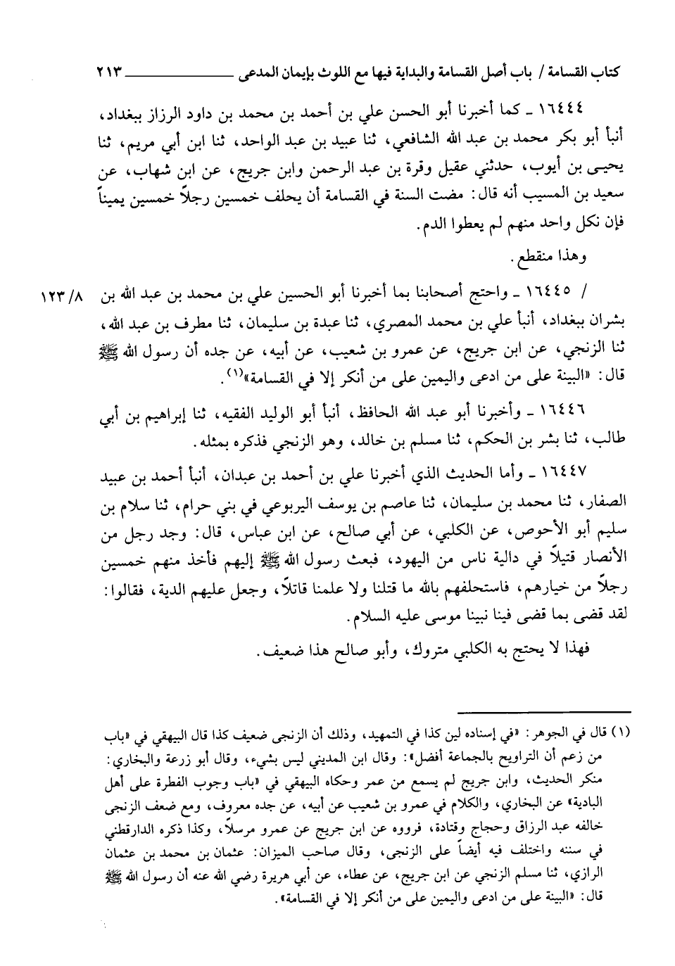 16447 - وَأَمَّا الْحَدِيثُ الَّذِي أَخْبَرَنَا عَلِيُّ بْنُ أَحْمَدَ بْنِ عَبْدَانَ، أنبأ أَحْمَدُ بْنُ عُبَيْدٍ الصَّفَّارُ، ثنا مُحَمَّدُ بْنُ سُلَيْمَانَ، ثنا عَاصِمُ بْنُ يُوسُفَ الْيَرْبُوعِيُّ، فِي بَنِي حَرَامٍ، ثنا سَلَّامُ بْنُ سُلَيْمٍ أَبُو الْأَحْوَصِ، عَنِ الْكَلْبِيِّ، عَنْ أَبِي صَالِحٍ، عَنِ ابْنِ عَبَّاسٍ، قَالَ: وُجِدَ رَجُلٌ مِنَ الْأَنْصَارِ قَتِيلًا فِي دَالِيَةِ نَاسٍ مَعَ الْيَهُودِ، فَبَعَثَ رَسُولُ اللهِ صَلَّى اللهُ عَلَيْهِ وَسَلَّمَ إِلَيْهِمْ: §فَأَخَذَ مِنْهُمْ خَمْسِينَ رَجُلًا مِنْ خِيَارِهِمْ فَاسْتَحْلَفَهُمْ بِاللهِ: مَا قَتَلْنَا وَلَا عَلِمْنَا قَاتِلًا، وَجَعَلَ عَلَيْهِمُ الدِّيَةَ، فَقَالُوا: لَقَدْ قَضَى بِمَا قَضَى فِينَا نَبِيُّنَا مُوسَى عَلَيْهِ السَّلَامُ فَهَذَا لَا يُحْتَجُّ بِهِ، الْكَلْبِيُّ مَتْرُوكٌ، وَأَبُو صَالِحٍ هَذَا ضَعِيفٌ