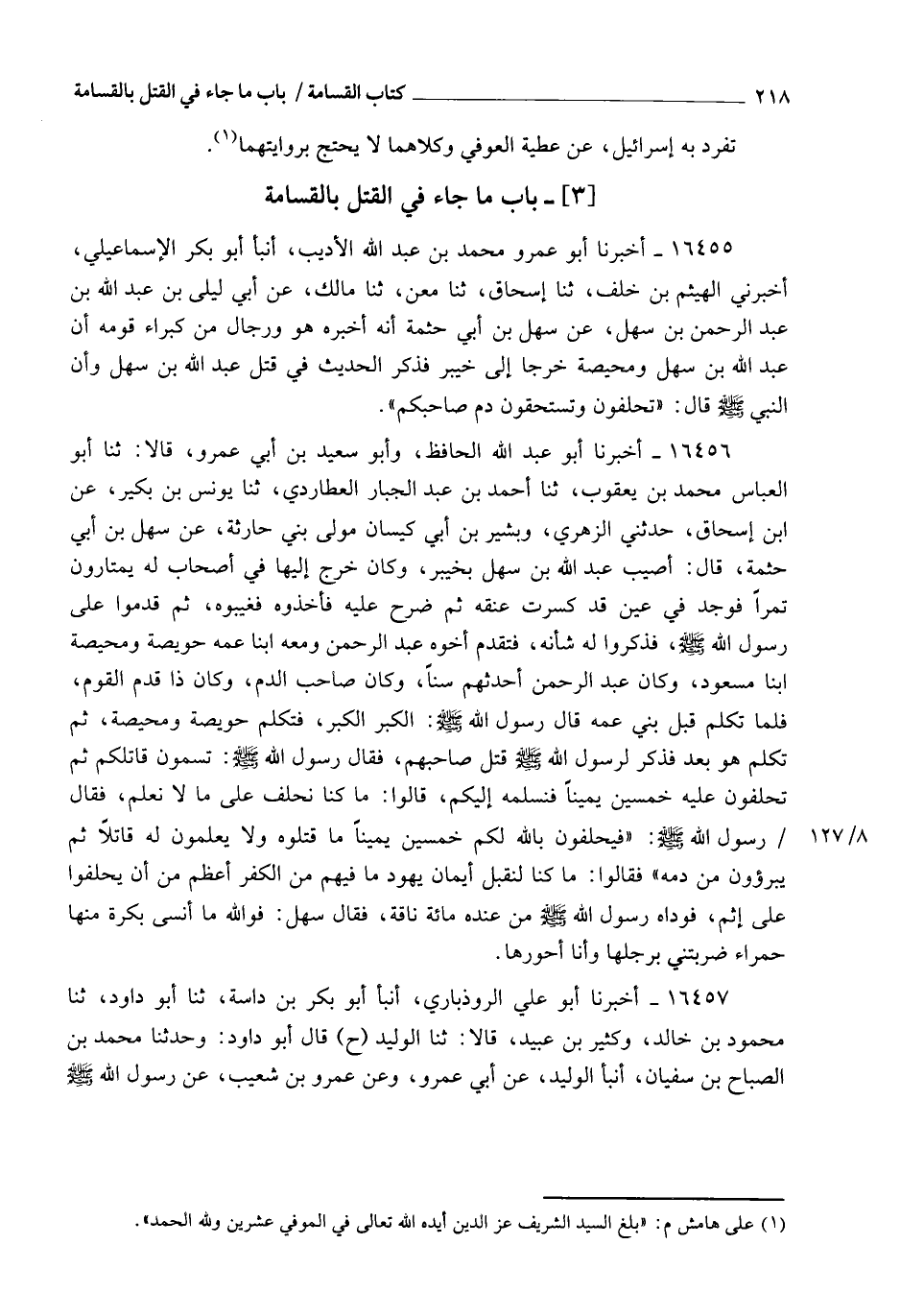 16456 - أَخْبَرَنَا أَبُو عَبْدِ اللهِ الْحَافِظُ، وَأَبُو سَعِيدِ بْنُ أَبِي عَمْرٍو، قَالَا: ثنا أَبُو الْعَبَّاسِ مُحَمَّدُ بْنُ يَعْقُوبَ، ثنا أَحْمَدُ بْنُ عَبْدِ الْجَبَّارِ الْعُطَارِدِيُّ، ثنا يُونُسُ بْنُ بُكَيْرٍ، عَنِ ابْنِ إِسْحَاقَ، حَدَّثَنِي الزُّهْرِيُّ، وَبَشِيرُ بْنُ أَبِي كَيْسَانَ، مَوْلَى بَنِي حَارِثَةَ، عَنْ سَهْلِ بْنِ أَبِي حَثْمَةَ، قَالَ: أُصِيبَ عَبْدُ اللهِ بْنُ سَهْلٍ بِخَيْبَرَ، وَكَانَ خَرَجَ إِلَيْهَا فِي أَصْحَابٍ لَهُ يَمْتَارُونَ تَمْرًا فَوُجِدَ فِي عَيْنٍ قَدْ كُسِرَتْ عُنُقُهُ ثُمَّ ضُرِحَ عَلَيْهِ، فَأَخَذُوهُ فَغَيَّبُوهُ، ثُمَّ قَدِمُوا عَلَى رَسُولِ اللهِ صَلَّى اللهُ عَلَيْهِ وَسَلَّمَ فَذَكَرُوا لَهُ شَأْنَهُ، فَتَقَدَّمَ أَخُوهُ عَبْدُ الرَّحْمَنِ وَمَعَهُ ابْنَا عَمِّهِ حُوَيِّصَةُ، وَمُحَيِّصَةُ ابْنَا مَسْعُودٍ، وَكَانَ عَبْدُ الرَّحْمَنِ أَحْدَثَهُمْ سِنًّا، وَكَانَ صَاحِبَ الدَّمِ وَكَانَ ذَا قَدَمِ الْقَوْمِ، فَلَمَّا تَكَلَّمَ قَبْلَ بَنِي عَمِّهِ قَالَ رَسُولُ اللهِ صَلَّى اللهُ عَلَيْهِ وَسَلَّمَ: " الْكِبَرَ الْكِبَرَ " فَتَكَلَّمَ حُوَيِّصَةُ، وَمُحَيِّصَةُ ثُمَّ تَكَلَّمَ هُوَ بَعْدُ، فَذَكَرَ لِرَسُولِ اللهِ صَلَّى اللهُ عَلَيْهِ وَسَلَّمَ قَتْلَ صَاحِبِهِمْ، فَقَالَ رَسُولُ اللهِ صَلَّى اللهُ عَلَيْهِ وَسَلَّمَ: §" تُسَمُّونَ قَاتِلَكُمْ ثُمَّ تَحْلِفُونَ عَلَيْهِ خَمْسِينَ يَمِينًا فَنُسْلِمُهُ إِلَيْكُمْ؟ " قَالُوا: مَا كُنَّا نَحْلِفُ عَلَى مَا لَا نَعْلَمُ فَقَالَ رَسُولُ اللهِ صَلَّى اللهُ عَلَيْهِ وَسَلَّمَ: " فَيَحْلِفُونَ بِاللهِ لَكُمْ خَمْسِينَ يَمِينًا مَا قَتَلُوهُ وَلَا يَعْلَمُونَ لَهُ قَاتِلًا، ثُمَّ يَبْرَءُونَ مِنْ دَمِهِ؟ " فَقَالُوا: مَا كُنَّا لِنَقْبَلَ أَيْمَانَ يَهُودَ، مَا فِيهِمْ مِنَ الْكُفْرِ أَعْظَمُ مِنْ أَنْ يَحْلِفُوا عَلَى إِثْمٍ فَوَدَاهُ رَسُولُ اللهِ صَلَّى اللهُ عَلَيْهِ وَسَلَّمَ مِنْ عِنْدِهِ مِائَةَ نَاقَةٍ فَقَالَ سَهْلٌ: فَوَاللهِ مَا أَنْسَى بَكْرَةً مِنْهَا حَمْرَاءَ ضَرَبَتْنِي بِرِجْلِهَا وَأَنَا أَحُورُهَا