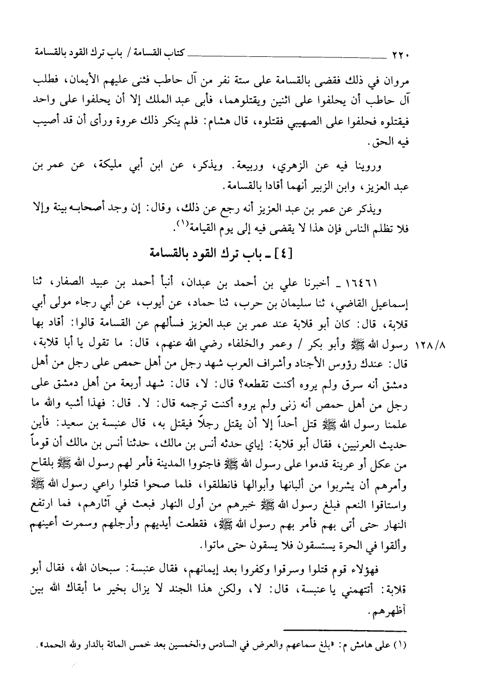 16461 - أَخْبَرَنَا عَلِيُّ بْنُ أَحْمَدَ بْنِ عَبْدَانَ، أنبأ أَحْمَدُ بْنُ عُبَيْدٍ الصَّفَّارُ، ثنا إِسْمَاعِيلُ الْقَاضِي، ثنا سُلَيْمَانُ بْنُ حَرْبٍ، ثنا حَمَّادٌ، عَنْ أَيُّوبَ، عَنْ أَبِي رَجَاءٍ، مَوْلَى أَبِي قِلَابَةَ، قَالَ: كَانَ أَبُو قِلَابَةَ عِنْدَ عُمَرَ بْنِ عَبْدِ الْعَزِيزِ فَسَأَلَهُمْ عَنِ الْقَسَامَةِ، قَالُوا: أَقَادَ بِهَا رَسُولُ اللهِ صَلَّى اللهُ عَلَيْهِ وَسَلَّمَ وَأَبُو بَكْرٍ، وَعُمَرُ وَالْخُلَفَاءُ رَضِيَ اللهُ عَنْهُمْ قَالَ: مَا تَقُولُ يَا أَبَا قِلَابَةَ؟ قَالَ: عِنْدَكَ رُءُوسُ الْأَجْنَادِ وَأَشْرَافُ الْعَرَبِ، شَهِدَ رَجُلٌ مِنْ أَهْلِ حِمْصٍ عَلَى رَجُلٍ مِنْ أَهْلِ دِمَشْقَ أَنَّهُ سَرَقَ وَلَمْ يَرَوْهُ أَكُنْتَ تَقْطَعُهُ؟ قَالَ: لَا، قَالَ: شَهِدَ أَرْبَعَةٌ مِنْ أَهْلِ دِمَشْقَ عَلَى رَجُلٍ مِنْ أَهْلِ حِمْصٍ أَنَّهُ زَنَى وَلَمْ يَرَوْهُ أَكُنْتَ تَرْجُمُهُ؟ قَالَ: لَا، قَالَ: فَهَذَا أَشْبَهُ، وَاللهِ مَا عَلِمْنَا رَسُولَ اللهِ صَلَّى اللهُ عَلَيْهِ وَسَلَّمَ قَتَلَ أَحَدًا، إِلَّا أَنْ يَقْتُلَ رَجُلًا فَيُقْتَلَ بِهِ، قَالَ عَنْبَسَةُ بْنُ سَعِيدٍ: فَأَيْنَ حَدِيثُ الْعُرَنِيِّينَ؟ فَقَالَ أَبُو قِلَابَةَ: إِيَّايَ حَدَّثَهُ أَنَسُ بْنُ مَالِكٍ، حَدَّثَنَا أَنَسُ بْنُ مَالِكٍ أَنَّ قَوْمًا مِنْ عُكْلٍ أَوْ عُرَيْنَةَ قَدِمُوا عَلَى رَسُولِ اللهِ صَلَّى اللهُ عَلَيْهِ وَسَلَّمَ: فَاجْتَوَوَا الْمَدِينَةَ، فَأَمَرَ لَهُمْ رَسُولُ اللهِ صَلَّى اللهُ عَلَيْهِ وَسَلَّمَ بِلِقَاحٍ، وَأَمَرَهُمْ أَنْ يَشْرَبُوا مِنْ أَلْبَانِهَا وَأَبْوَالِهَا، فَانْطَلَقُوا فَلَمَّا صَحُّوا قَتَلُوا رَاعِيَ رَسُولِ اللهِ صَلَّى اللهُ عَلَيْهِ وَسَلَّمَ وَاسْتَاقُوا النَّعَمَ، فَبَلَغَ رَسُولَ اللهِ صَلَّى اللهُ عَلَيْهِ وَسَلَّمَ خَبَرُهُمْ مِنْ أَوَّلِ النَّهَارِ، فَبَعَثَ فِي آثَارِهِمْ فَمَا ارْتَفَعَ النَّهَارُ حَتَّى أُتِيَ بِهِمْ §فَأَمَرَ بِهِمْ رَسُولُ اللهِ صَلَّى اللهُ عَلَيْهِ وَسَلَّمَ فَقُطِعَتْ أَيْدِيهِمْ وَأَرْجُلُهُمْ، وَسُمِرَتْ أَعْيُنُهُمْ، وَأُلْقُوا فِي الْحَرَّةِ يَسْتَسْقُونَ فَلَا يُسْقَوْنَ حَتَّى مَاتُوا فَهَؤُلَاءِ قَوْمٌ قَتَلُوا وَسَرَقُوا وَكَفَرُوا بَعْدَ إِيمَانَهِمْ فَقَالَ عَنْبَسَةُ: سُبْحَانَ اللهِ فَقَالَ أَبُو قِلَابَةَ: أَتَتَّهِمُنِي يَا عَنْبَسَةُ؟ قَالَ: لَا، وَلَكِنَّ هَذَا الْجُنْدَ لَا يَزَالُ بِخَيْرٍ مَا أَبْقَاكَ اللهُ بَيْنَ أَظْهُرِهِمْ -[221]- رَوَاهُ الْبُخَارِيُّ فِي الصَّحِيحِ، عَنْ سُلَيْمَانَ بْنِ حَرْبٍ، وَرَوَاهُ مُسْلِمٌ، عَنْ هَارُونَ الْحَمَّالِ، عَنْ سُلَيْمَانَ بْنِ حَرْبٍ مُخْتَصَرًا