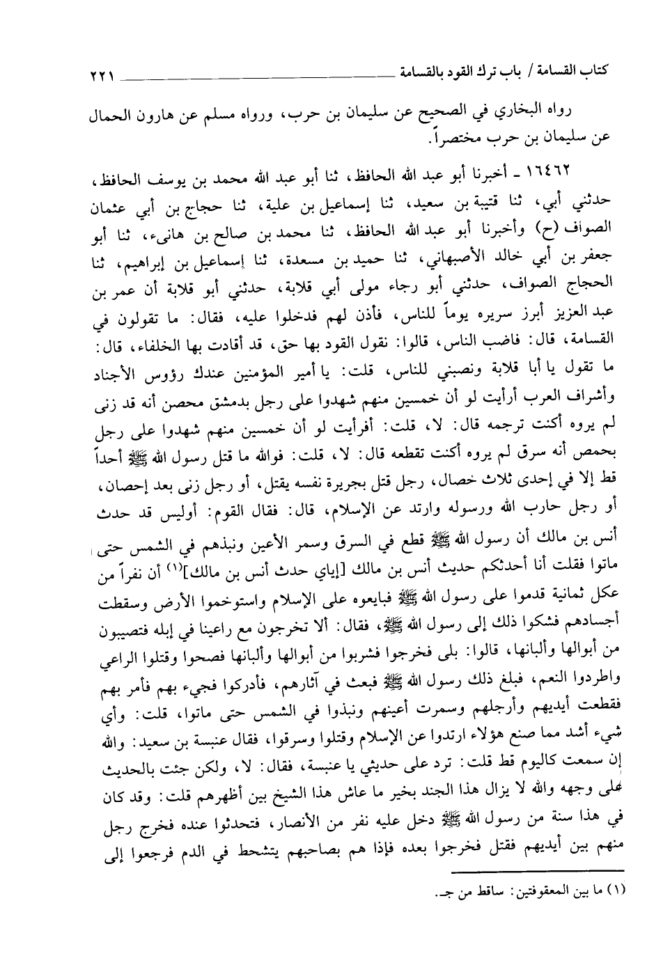 16462 - أَخْبَرَنَا أَبُو عَبْدِ اللهِ الْحَافِظُ، ثنا أَبُو عَبْدِ اللهِ مُحَمَّدُ بْنُ يُوسُفَ الْحَافِظُ، حَدَّثَنِي أَبِي، ثنا قُتَيْبَةُ بْنُ سَعِيدٍ، ثنا إِسْمَاعِيلُ ابْنُ عُلَيَّةَ، ثنا حَجَّاجُ بْنُ أَبِي عُثْمَانَ الصَّوَّافُ، ح وَأَخْبَرَنَا أَبُو عَبْدِ اللهِ الْحَافِظُ، ثنا مُحَمَّدُ بْنُ صَالِحِ بْنِ هَانِئٍ، ثنا أَبُو جَعْفَرِ بْنُ أَبِي خَالِدٍ الْأَصْبَهَانِيُّ، ثنا حُمَيْدُ بْنُ مَسْعَدَةَ، ثنا إِسْمَاعِيلُ بْنُ إِبْرَاهِيمَ، ثنا الْحَجَّاجُ الصَّوَّافُ، حَدَّثَنِي أَبُو رَجَاءٍ، مَوْلَى أَبِي قِلَابَةَ، حَدَّثَنِي أَبُو قِلَابَةَ، أَنَّ عُمَرَ بْنَ عَبْدِ الْعَزِيزِ، أَبْرَزَ سَرِيرَهُ يَوْمًا لِلنَّاسِ فَأَذِنَ لَهُمْ فَدَخَلُوا عَلَيْهِ، فَقَالَ: مَا تَقُولُونَ فِي الْقَسَامَةِ؟ قَالَ: فَأَضَبَّ النَّاسُ، قَالُوا: نَقُولُ: الْقَوَدُ بِهَا حَقٌّ، قَدْ أَقَادَتْ بِهَا الْخُلَفَاءُ، قَالَ: مَا تَقُولُ يَا أَبَا قِلَابَةَ؟ وَنَصَبَنِي لِلنَّاسِ، قُلْتُ: يَا أَمِيرَ الْمُؤْمِنِينَ عِنْدَكَ رُءُوسُ الْأَجْنَادِ وَأَشْرَافُ الْعَرَبِ، أَرَأَيْتَ لَوْ أَنَّ خَمْسِينَ مِنْهُمْ شَهِدُوا عَلَى رَجُلٍ بِدِمَشْقَ مُحْصَنٍ أَنَّهُ قَدْ زَنَى لَمْ يَرَوْهُ، أَكُنْتَ تَرْجُمُهُ؟ قَالَ: لَا، قُلْتُ: أفَرَأَيْتَ لَوْ أَنَّ خَمْسِينَ مِنْهُمْ شَهِدُوا عَلَى رَجُلٍ بِحِمْصَ أَنَّهُ سَرَقَ لَمْ يَرَوْهُ، أَكُنْتَ تَقْطَعُهُ؟ قَالَ: لَا، قُلْتُ: فَوَاللهِ مَا قَتَلَ رَسُولُ اللهِ صَلَّى اللهُ عَلَيْهِ وَسَلَّمَ أَحَدًا قَطُّ، إِلَّا فِي إِحْدَى ثَلَاثِ خِصَالٍ: رَجُلٌ قَتَلَ بِجَرِيرَةِ نَفْسِهِ يُقْتَلُ، أَوْ رَجُلٌ زَنَى بَعْدَ إِحْصَانٍ، أَوْ رَجُلٌ حَارَبَ اللهَ وَرَسُولَهُ وَارْتَدَّ عَنِ الْإِسْلَامِ، قَالَ: فَقَالَ الْقَوْمُ: أَوَلَيْسَ قَدْ حَدَّثَ أَنَسُ بْنُ مَالِكٍ أَنَّ رَسُولَ اللهِ صَلَّى اللهُ عَلَيْهِ وَسَلَّمَ قَطَعَ فِي السَّرَقِ وَسَمَرَ الْأَعْيُنَ وَنَبَذَهُمْ فِي الشَّمْسِ حَتَّى مَاتُوا؟ فَقُلْتُ: أَنَا أُحَدِّثُكُمْ حَدِيثَ أَنَسِ بْنِ مَالِكٍ، إِيَّايَ حَدَّثَ أَنَسُ بْنُ مَالِكٍ أَنَّ نَفَرًا مِنْ عُكْلٍ ثَمَانِيَةً قَدِمُوا عَلَى رَسُولِ اللهِ صَلَّى اللهُ عَلَيْهِ وَسَلَّمَ: فَبَايَعُوهُ عَلَى الْإِسْلَامِ، وَاسْتَوْخَمُوا الْأَرْضَ وَسَقَمَتْ أَجْسَادُهُمْ فَشَكَوْا ذَلِكَ إِلَى رَسُولِ اللهِ صَلَّى اللهُ عَلَيْهِ وَسَلَّمَ، فَقَالَ: §" أَلَا تَخْرُجُونَ مَعَ رَاعِينَا فِي إِبِلِهِ فَتُصِيبُونَ مِنْ أَبْوَالِهَا وَأَلْبَانِهَا؟ قَالُوا: بَلَى، فَخَرَجُوا فَشَرِبُوا مِنْ أَبْوَالِهَا وَأَلْبَانِهَا فَصَحُّوا وَقَتَلُوا الرَّاعِيَ وَاطَّرَدُوا النَّعَمَ، فَبَلَغَ ذَلِكَ رَسُولَ اللهِ صَلَّى اللهُ عَلَيْهِ وَسَلَّمَ فَبَعَثَ فِي آثَارِهِمْ فَأُدْرِكُوا فَجِيءَ بِهِمْ، فَأَمَرَ بِهِمْ فَقُطِعَتْ أَيْدِيهِمْ وَأَرْجُلُهُمْ، وَسُمِرَتْ أَعْيُنُهُمْ، وَنُبِذُوا فِي الشَّمْسِ حَتَّى مَاتُوا قُلْتُ: وَأِيُّ شَيْءٍ أَشَدُّ مِمَّا صَنَعَ هَؤُلَاءِ: ارْتَدُّوا عَنِ الْإِسْلَامِ، وَقَتَلُوا، وَسَرَقُوا فَقَالَ عَنْبَسَةُ بْنُ سَعِيدٍ: وَاللهِ، إِنْ سَمِعْتُ كَالْيَوْمِ قَطُّ، قُلْتُ: تَرُدُّ عَلَيَّ حَدِيثِي يَا عَنْبَسَةُ؟ فَقَالَ: لَا، وَلَكِنْ جِئْتَ بِالْحَدِيثِ عَلَى وَجْهِهِ، وَاللهِ لَا يَزَالُ هَذَا الْجُنْدُ بِخَيْرٍ مَا عَاشَ هَذَا الشَّيْخُ بَيْنَ أَظْهُرِهِمْ قُلْتُ: وَقَدْ كَانَ فِي هَذَا سُنَّةٌ مِنْ رَسُولِ اللهِ صَلَّى اللهُ عَلَيْهِ وَسَلَّمَ، دَخَلَ عَلَيْهِ نَفَرٌ مِنَ الْأَنْصَارِ فَتَحَدَّثُوا عِنْدَهُ، فَخَرَجَ رَجُلٌ مِنْهُمْ بَيْنَ أَيْدِيهِمْ فَقُتِلَ، فَخَرَجُوا بَعْدَهُ فَإِذَا هُمْ بِصَاحِبِهِمْ يَتَشَحَّط