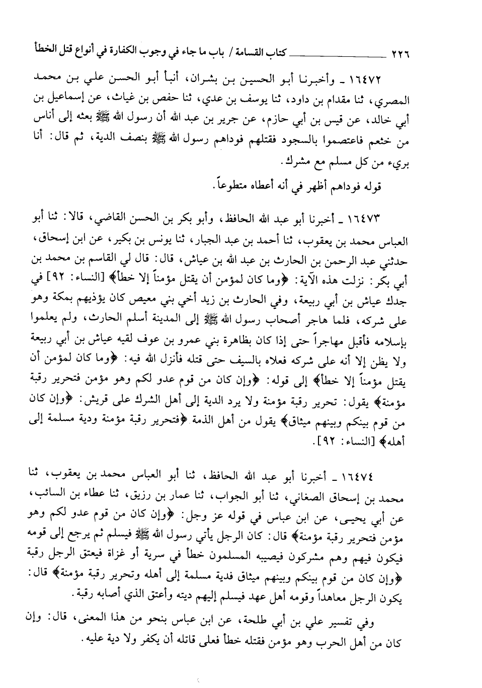 16473 - أَخْبَرَنَا أَبُو عَبْدِ اللهِ الْحَافِظُ، وَأَبُو بَكْرِ بْنُ الْحَسَنِ الْقَاضِي، قَالَا: ثنا أَبُو الْعَبَّاسِ مُحَمَّدُ بْنُ يَعْقُوبَ، ثنا أَحْمَدُ بْنُ عَبْدِ الْجَبَّارِ، ثنا يُونُسُ بْنُ بُكَيْرٍ، عَنِ ابْنِ إِسْحَاقَ، حَدَّثَنِي عَبْدُ الرَّحْمَنِ بْنُ الْحَارِثِ بْنِ عَبْدِ اللهِ بْنِ عَيَّاشٍ، قَالَ: قَالَ لِيَ الْقَاسِمُ بْنُ مُحَمَّدِ بْنِ أَبِي بَكْرٍ: نَزَلَتْ هَذِهِ الْآيَةُ {§وَمَا كَانَ لِمُؤْمِنٍ أَنْ يَقْتُلَ مُؤْمِنًا إِلَّا خَطَأً} فِي جَدِّكَ عَيَّاشِ بْنِ أَبِي رَبِيعَةَ، وَفِي الْحَارِثِ بْنِ زَيْدٍ أَخِي بَنِي مَعِيصٍ، كَانَ يُؤْذِيهِمْ بِمَكَّةَ وَهُوَ عَلَى شِرْكِهِ، فَلَمَّا هَاجَرَ أَصْحَابُ رَسُولِ اللهِ صَلَّى اللهُ عَلَيْهِ وَسَلَّمَ إِلَى الْمَدِينَةِ أَسْلَمَ الْحَارِثُ وَلَمْ يَعْلَمُوا بِإِسْلَامِهِ، فَأَقْبَلَ مُهَاجِرًا حَتَّى إِذَا كَانَ بِظَاهِرَةِ بَنِي عَمْرِو بْنِ عَوْفٍ لَقِيَهُ عَيَّاشُ بْنُ أَبِي رَبِيعَةَ، وَلَا يَظُنُّ إِلَّا أَنَّهُ عَلَى شِرْكِهِ، فَعَلَاهُ بِالسَّيْفِ حَتَّى قَتَلَهُ، فَأَنْزَلَ اللهُ فِيهِ {وَمَا كَانَ لِمُؤْمِنٍ أَنْ يَقْتُلَ مُؤْمِنًا إِلَّا خَطَأً} إِلَى قَوْلِهِ: {فَإِنْ كَانَ مِنْ قَوْمٍ عَدُوٍّ لَكُمْ وَهُوَ مُؤْمِنٌ فَتَحْرِيرُ رَقَبَةٍ مُؤْمِنَةٍ} [النساء: 92] يَقُولُ: تَحْرِيرُ رَقَبَةٍ مُؤْمِنَةٍ وَلَا يَرُدُّ الدِّيَةِ إِلَى أَهْلِ الشِّرْكِ عَلَى قُرَيْشٍ، {وَإِنْ كَانَ مِنْ قَوْمٍ بَيْنَكُمْ وَبَيْنَهُمْ مِيثَاقٌ} [النساء: 92] يَقُولُ: مِنْ أَهْلِ الذِّمَّةِ {فَتَحْرِيرُ رَقَبَةٍ مُؤْمِنَةٍ وَدِيَةٌ مُسَلَّمَةٌ إِلَى أَهْلِهِ} [النساء: 92]