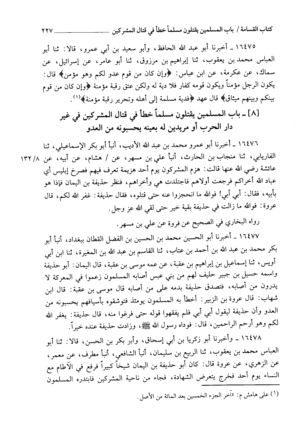 16477 - أَخْبَرَنَا أَبُو الْحُسَيْنِ مُحَمَّدُ بْنُ الْحُسَيْنِ بْنِ الْفَضْلِ الْقَطَّانُ، بِبَغْدَادَ، أنبأ أَبُو بَكْرٍ مُحَمَّدُ بْنُ عَبْدِ اللهِ بْنِ أَحْمَدَ بْنِ عَتَّابٍ، ثنا الْقَاسِمُ بْنُ عَبْدِ اللهِ بْنِ الْمُغِيرَةِ، ثنا ابْنُ أَبِي أُوَيْسٍ، ثنا إِسْمَاعِيلُ بْنُ إِبْرَاهِيمَ بْنِ عُقْبَةَ، عَنْ عَمِّهِ مُوسَى بْنِ عُقْبَةَ، قَالَ: الْيَمَانُ أَبُو حُذَيْفَةَ، وَاسْمُهُ حُسَيْلُ بْنُ جُبَيْرٍ حَلِيفٌ لَهُمْ مِنْ بَنِي عَبْسٍ، أَصَابَهُ الْمُسْلِمُونَ زَعَمُوا فِي الْمَعْرَكَةِ لَا يَدْرُونَ مَنْ أَصَابَهُ، فَتَصَدَّقَ حُذَيْفَةُ بِدَمِهِ عَلَى مَنْ أَصَابَهُ قَالَ مُوسَى بْنُ عُقْبَةَ: قَالَ ابْنُ شِهَابٍ: قَالَ عُرْوَةُ بْنُ الزُّبَيْرِ: §أَخْطَأَ بِهِ الْمُسْلِمُونَ يَوْمَئِذٍ فَتَوَشَّقُوهُ بِأَسْيَافِهِمْ يَحْسَبُونَهُ مِنَ الْعَدُوِّ، وَإِنَّ حُذَيْفَةَ لَيَقُولُ: أَبِي أَبِي، فَلَمْ يَفْقَهُوا قَوْلَهُ حَتَّى فَرَغُوا مِنْهُ، قَالَ حُذَيْفَةُ: يَغْفِرُ اللهُ لَكُمْ، وَهُوَ أَرْحَمُ الرَّاحِمِينَ، قَالَ: فَوَدَاهُ رَسُولُ اللهِ صَلَّى اللهُ عَلَيْهِ وَسَلَّمَ، وَزَادَتْ حُذَيْفَةَ عِنْدَهُ خَيْرًا