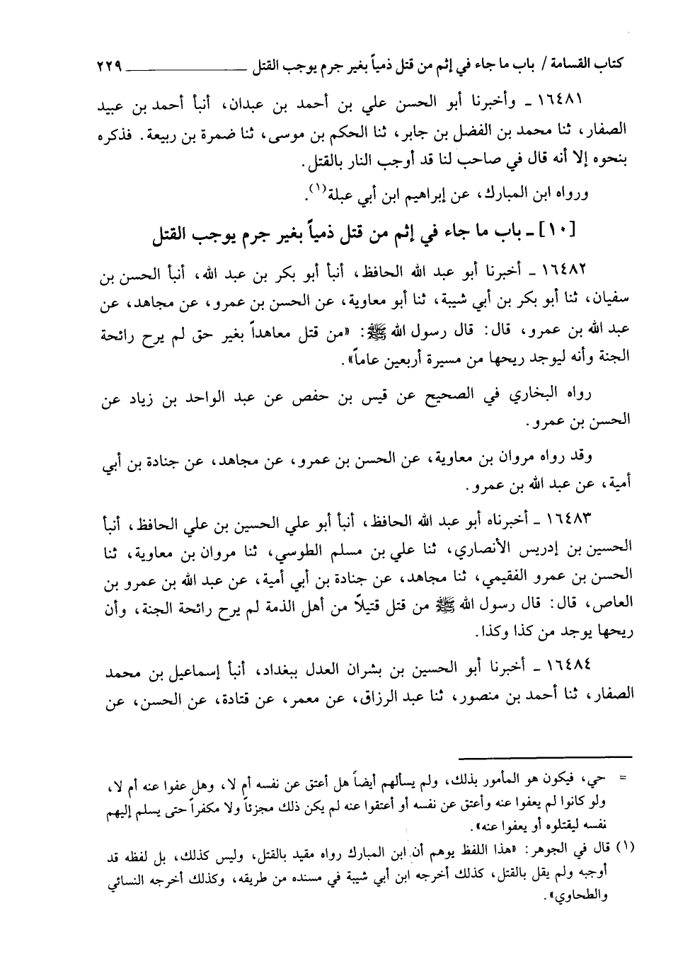 16482 - أَخْبَرَنَا أَبُو عَبْدِ اللهِ الْحَافِظُ، أنبأ أَبُو بَكْرِ بْنُ عَبْدِ اللهِ، أنبأ الْحَسَنُ بْنُ سُفْيَانَ، ثنا أَبُو بَكْرِ بْنُ أَبِي شَيْبَةَ، ثنا أَبُو مُعَاوِيَةَ، عَنِ الْحَسَنِ بْنِ عَمْرٍو، عَنْ مُجَاهِدٍ، عَنْ عَبْدِ اللهِ بْنِ عَمْرٍو، قَالَ: قَالَ رَسُولُ اللهِ صَلَّى اللهُ عَلَيْهِ وَسَلَّمَ: " §مَنْ قَتَلَ مُعَاهِدًا بِغَيْرِ حَقٍّ لَمْ يَرَحْ رَائِحَةَ الْجَنَّةِ، وَإِنَّهُ لَيُوجَدُ رِيحُهَا مِنْ مَسِيرَةِ أَرْبَعِينَ عَامًا " رَوَاهُ الْبُخَارِيُّ فِي الصَّحِيحِ، عَنْ قَيْسِ بْنِ حَفْصٍ، عَنْ عَبْدِ الْوَاحِدِ بْنِ زِيَادٍ، عَنِ الْحَسَنِ بْنِ عَمْرٍو وَقَدْ رَوَاهُ مَرْوَانُ بْنُ مُعَاوِيَةَ، عَنِ الْحَسَنِ بْنِ عَمْرٍو، عَنْ مُجَاهِدٍ، عَنْ جُنَادَةَ بْنِ أَبِي أُمَيَّةَ، عَنْ عَبْدِ اللهِ بْنِ عَمْرٍو