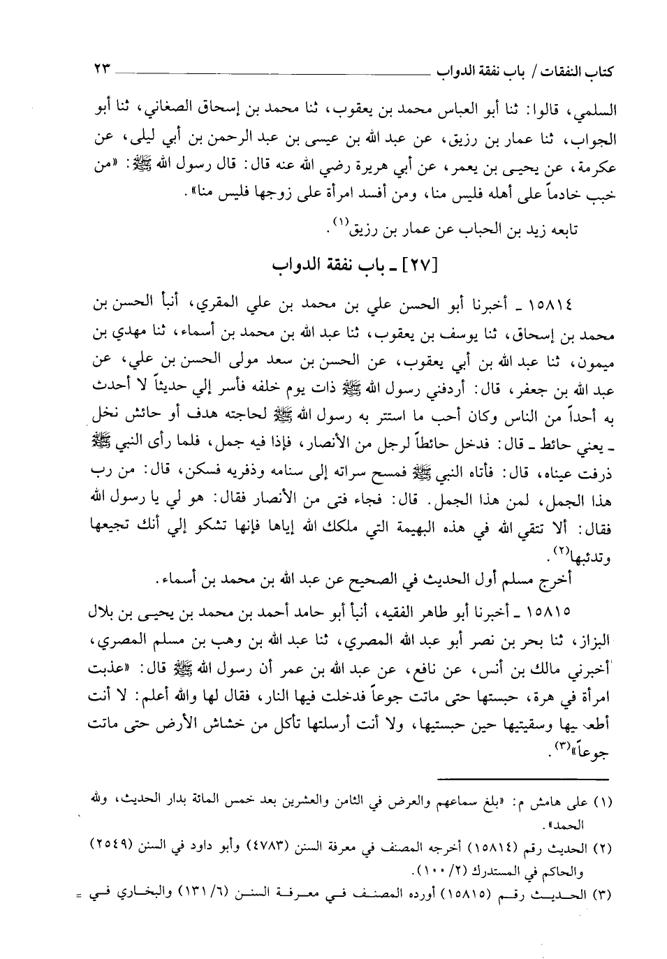 15815 - أَخْبَرَنَا أَبُو طَاهِرٍ الْفَقِيهُ، أنبأ أَبُو حَامِدٍ أَحْمَدُ بْنُ مُحَمَّدِ بْنِ يَحْيَى بْنِ بِلَالٍ الْبَزَّازُ، ثنا بَحْرُ بْنُ نَصْرٍ أَبُو عَبْدِ اللهِ الْمِصْرِيُّ، ثنا عَبْدُ اللهِ بْنُ وَهْبِ بْنِ مُسْلِمٍ الْمِصْرِيُّ، أَخْبَرَنِي مَالِكُ بْنُ أَنَسٍ، عَنْ نَافِعٍ، عَنْ عَبْدِ اللهِ بْنِ عُمَرَ، أَنَّ رَسُولَ اللهِ صَلَّى اللهُ عَلَيْهِ وَسَلَّمَ قَالَ: " §عُذِّبَتِ امْرَأَةٌ فِي هِرَّةٍ حَبَسَتْهَا حَتَّى مَاتَتْ جُوعًا، فَدَخَلْتُ فِيهَا النَّارَ، فَقَالَ لَهَا وَاللهُ أَعْلَمُ: لَا أَنْتِ أَطْعَمْتِيهَا وَسَقَيْتِيهَا حِينَ حَبَسْتِيهَا، وَلَا أَنْتِ أَرْسَلْتِيهَا تَأْكُلُ مِنْ خَشَاشِ الْأَرْضِ حَتَّى مَاتَتْ جُوعًا -[24]-