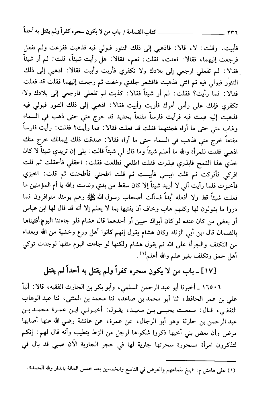 16506 - أَخْبَرَنَا أَبُو عَبْدِ الرَّحْمَنِ السُّلَمِيُّ، وَأَبُو بَكْرِ بْنُ الْحَارِثِ الْفَقِيهُ، قَالَا: أَنْبَأَ عَلِيُّ بْنُ عُمَرَ الْحَافِظُ، ثَنَا أَبُو مُحَمَّدِ بْنُ صَاعِدٍ، ثَنَا مُحَمَّدُ بْنُ الْمُثَنَّى، ثَنَا عَبْدُ الْوَهَّابِ الثَّقَفِيُّ، قَالَ: سَمِعْتُ يَحْيَى بْنَ سَعِيدٍ، يَقُولُ: أَخْبَرَنِي ابْنُ عَمْرَةَ مُحَمَّدُ بْنُ عَبْدِ الرَّحْمَنِ بْنِ حَارِثَةَ وَهُوَ أَبُو الرِّجَالِ، عَنْ عَمْرَةَ، عَنْ عَائِشَةَ، رَضِيَ اللهُ عَنْهَا , أَصَابَهَا مَرَضٌ وَأَنَّ بَعْضَ بَنِي أَخِيهَا ذَكَرُوا شَكْوَاهَا لِرَجُلٍ مِنَ الزُّطِّ يَتَطَيَّبُ , وَأَنَّهُ قَالَ لَهُمْ: إِنَّكُمْ لَتَذْكُرُونَ امْرَأَةً مَسْحُورَةً سَحَرَتْهَا جَارِيَةٌ لَهَا فِي حِجْرِ الْجَارِيَةِ الْآنَ صَبِيُّ قَدْ بَالَ فِي -[237]- حِجْرِهَا , فَذَكَرُوا ذَلِكَ لِعَائِشَةَ رَضِيَ الله عَنْهَا فَقَالَتْ: ادْعُوا لِي فُلَانَةً , لَجَارِيَةٍ لَهَا، قَالُوا: فِي حِجْرِهَا فُلَانٌ , لِصَبِيٍّ لَهُمْ , قَدْ بَالَ فِي حِجْرِهَا , فَقَالَتْ: إِيْتُونِي بِهَا , فَأُتِيَتْ بِهَا فَقَالَتْ: سَحَرْتِنِي؟ قَالَتْ: نَعَمْ، قَالَتْ: لِمَهْ؟ قَالَتْ: أَرَدْتُ أَنْ أُعْتَقَ , وَكَانَتْ عَائِشَةُ رَضِيَ اللهُ عَنْهَا أَعْتَقَتْهَا عَنْ دُبُرٍ مِنْهَا , فَقَالَتْ: إِنَّ §لِلَّهِ عَلِيَّ أَنْ لَا تُعْتَقِي أَبَدًا , انْظُرُوا أَسْوَأَ الْعَرَبِ مَلَكَةً فَبِيعُوهَا مِنْهُمْ , وَاشْتَرَتْ بِثَمَنِهَا جَارِيَةً فَأَعْتَقَتْهَا
