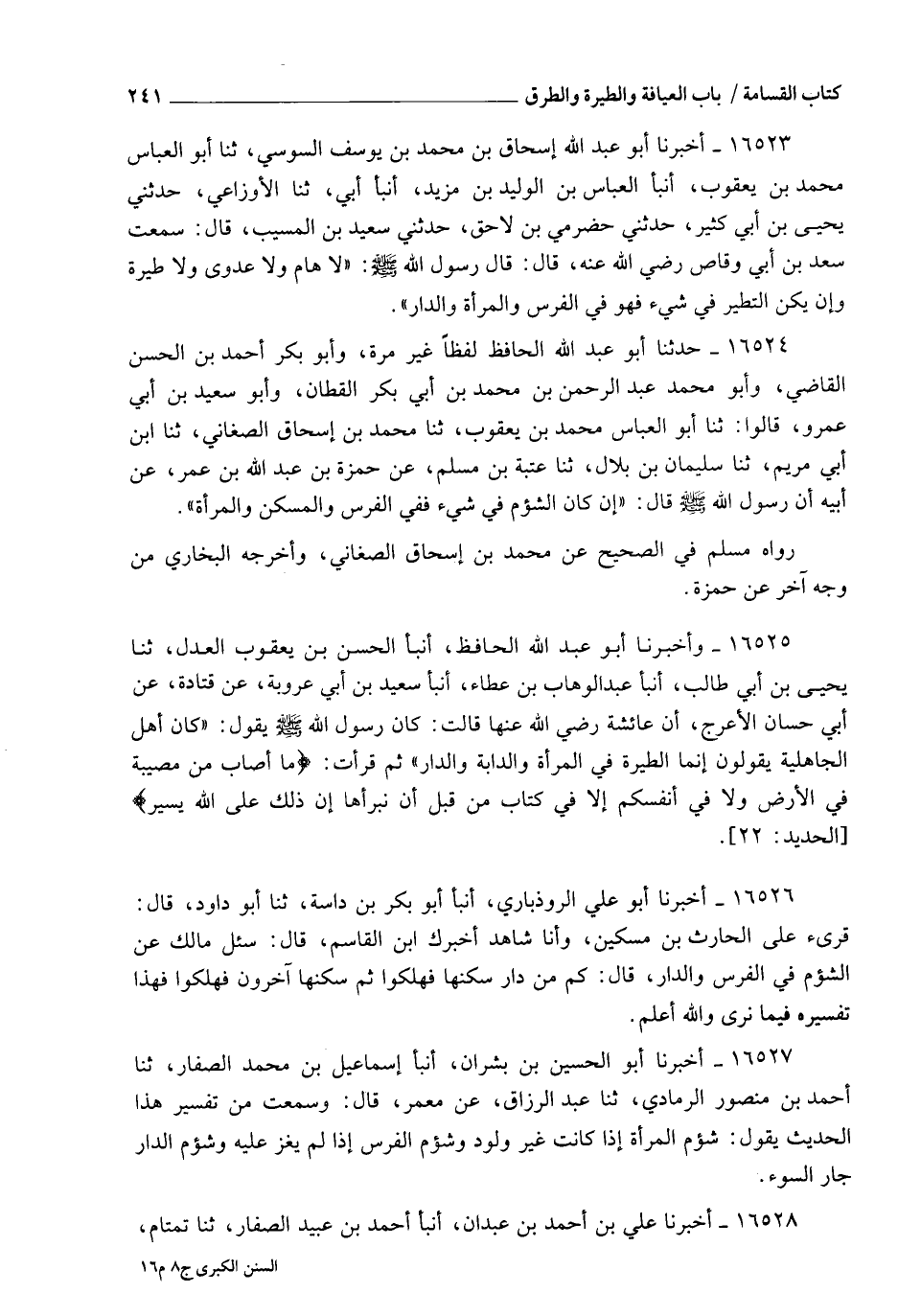 16524 - حَدَّثَنَا أَبُو عَبْدِ اللهِ الْحَافِظُ، لَفْظًا غَيْرَ مَرَّةٍ , وَأَبُو بَكْرٍ أَحْمَدُ بْنُ الْحَسَنِ الْقَاضِي , وَأَبُو مُحَمَّدِ بْنُ عَبْدِ الرَّحْمَنِ بْنِ مُحَمَّدِ بْنِ أَبِي بَكْرٍ الْقَطَّانُ , وَأَبُو سَعِيدِ بْنُ أَبِي عَمْرٍو، قَالُوا: ثَنَا أَبُو الْعَبَّاسِ مُحَمَّدُ بْنُ يَعْقُوبَ، ثَنَا مُحَمَّدُ بْنُ إِسْحَاقَ الصَّغَانِيُّ، ثَنَا ابْنُ أَبِي مَرْيَمَ، ثَنَا سُلَيْمَانُ بْنُ بِلَالٍ، ثَنَا عُتْبَةُ بْنُ مُسْلِمٍ، عَنْ حَمْزَةَ بْنِ عَبْدِ اللهِ بْنِ عُمَرَ، عَنْ أَبِيهِ، أَنَّ رَسُولَ اللهِ صَلَّى اللهُ عَلَيْهِ وَسَلَّمَ قَالَ: §" إِنْ كَانَ الشُّؤْمُ فِي شَيْءٍ فَفِي الْفَرَسِ وَالْمَسْكَنِ وَالْمَرْأَةِ " رَوَاهُ مُسْلِمٌ فِي الصَّحِيحِ عَنْ مُحَمَّدِ بْنِ إِسْحَاقَ الصَّغَانِيِّ , وَأَخْرَجَهُ الْبُخَارِيُّ مِنْ وَجْهٍ آخَرَ عَنْ حَمْزَةَ