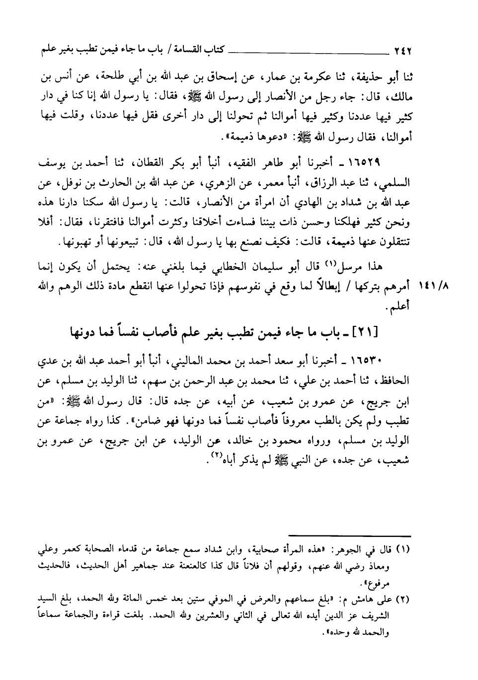 16530 - أَخْبَرَنَا أَبُو سَعْدٍ أَحْمَدُ بْنُ مُحَمَّدٍ الْمَالِينِيُّ، أَنْبَأَ أَبُو أَحْمَدَ عَبْدُ اللهِ بْنُ عَدِيٍّ الْحَافِظُ، ثَنَا أَحْمَدُ بْنُ عَلِيٍّ، ثَنَا مُحَمَّدُ بْنُ عَبْدِ الرَّحْمَنِ بْنِ سَهْمٍ، ثَنَا الْوَلِيدُ بْنُ مُسْلِمٍ، عَنِ ابْنِ جُرَيْجٍ، عَنْ عَمْرِو بْنِ شُعَيْبٍ، عَنْ أَبِيهِ، عَنْ جَدِّهِ، قَالَ: قَالَ رَسُولُ اللهِ صَلَّى اللهُ عَلَيْهِ وَسَلَّمَ: §" مَنْ تَطَبَّبَ وَلَمْ يَكُنْ بِالطِّبِّ مَعْرُوفًا فَأَصَابَ نَفْسًا فَمَا دُونَهَا فَهُوََ ضَامِنٌ ". كَذَا رَوَاهُ جَمَاعَةٌ عَنِ الْوَلِيدِ بْنِ مُسْلِمٍ , وَرَوَاهُ مَحْمُودُ بْنُ خَالِدٍ، عَنِ الْوَلِيدِ، عَنِ ابْنِ جُرَيْجٍ، عَنْ عَمْرِو بْنِ شُعَيْبٍ، عَنْ جَدِّهِ، عَنِ النَّبِيِّ صَلَّى اللهُ عَلَيْهِ وَسَلَّمَ , لَمْ يَذْكُرْ أَبَاهُ