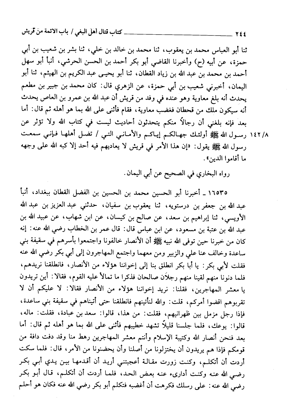16535 - أَخْبَرَنَا أَبُو الْحُسَيْنِ مُحَمَّدُ بْنُ الْحُسَيْنِ بْنِ الْفَضْلِ الْقَطَّانُ، بِبَغْدَادَ , أَنْبَأَ عَبْدُ اللهِ بْنُ جَعْفَرِ بْنِ دَرَسْتَوَيْهِ، ثَنَا يَعْقُوبُ بْنُ سُفْيَانَ، حَدَّثَنِي عَبْدُ الْعَزِيزِ بْنُ عَبْدِ اللهِ الْأُوَيْسِيُّ، ثَنَا إِبْرَاهِيمُ بْنُ سَعْدٍ، عَنْ صَالِحِ بْنِ كَيْسَانَ، عَنِ ابْنِ شِهَابٍ، عَنْ عُبَيْدِ اللهِ بْنِ عَبْدِ اللهِ بْنِ عُتْبَةَ بْنِ مَسْعُودٍ، عَنِ ابْنِ عَبَّاسٍ، قَالَ: قَالَ عُمَرُ بْنُ الْخَطَّابِ رَضِيَ اللهُ عَنْهُ: إِنَّهُ كَانَ مِنْ خَبَرِنَا §حِينَ تَوَفَّى اللهُ نَبِيَّهُ صَلَّى اللهُ عَلَيْهِ وَسَلَّمَ , أَنَّ الْأَنْصَارَ خَالَفُونَا وَاجْتَمَعُوا بِأَسْرِهِمْ فِي سَقِيفَةِ بَنِي سَاعِدَةَ , وَخَالَفَ عَنَّا عَلِيٌّ وَالزُّبَيْرُ وَمَن مَعَهُمَا , وَاجْتَمَعَ الْمُهَاجِرُونَ إِلَى أَبِي بَكْرٍ رَضِيَ اللهُ عَنْهُ , فَقُلْتُ لِأَبِي بَكْرٍ: يَا أَبَا بَكْرٍ انْطَلِقْ بِنَا إِلَى إِخْوَانِنَا هَؤُلَاءِ مِنَ الْأَنْصَارِ , فَانْطَلَقْنَا نُرِيدُهُمْ , فَلَمَّا دَنَوْنَا مِنْهُمْ لَقِيَنَا مِنْهُمْ رَجُلَانِ صَالِحَانِ , فَذَكَرَا مَا تَمَالَأَ عَلَيْهِ الْقَوْمُ , فَقَالَا: أَيْنَ تُرِيدُونَ يَا مَعْشَرَ الْمُهَاجِرِينَ؟ فَقُلْنَا: نُرِيدُ إِخْوَانَنَا هَؤُلَاءِ مِنَ الْأَنْصَارِ , فَقَالَا: لَا عَلَيْكُمْ أَنْ لَا تَقْرَبُوهُمُ , اقْضُوا أَمَرَكُمْ , فقُلْتُ: وَاللهِ لَنَأْتِيَنَّهُمْ , فَانْطَلَقْنَا حَتَّى أَتَيْنَاهُمْ فِي سَقِيفَةِ بَنِي سَاعِدَةَ , فَإِذَا رَجُلٌ مُزَمَّلٌ بَيْنَ ظَهْرَانَيْهِمْ , فَقُلْتُ: مَنْ هَذَا؟ قَالُوا: سَعْدُ بْنُ عُبَادَةَ , فَقُلْتُ: مَا لَهُ؟ قَالُوا: يُوعَكُ. فَلَمَّا جَلَسْنَا قَلِيلًا تَشَهَّدَ خَطِيبُهُمْ , فَأَثْنَى عَلَى اللهِ بِمَا هُوَ أَهْلُهُ , ثُمَّ قَالَ: أَمَّا بَعْدُ , فَنَحْنُ أَنْصَارُ اللهِ وَكَتِيبَةُ الْإِسْلَامِ , وَأَنْتُمْ مَعْشَرَ الْمُهَاجِرِينَ رَهْطٌ مِنَّا , وَقَدْ دَفَّتْ دَافَّةٌ مِنْ قَوْمِكُمْ فَإِذَا هُمْ يُرِيدُونَ أَنْ يَخْتَزِلُونَا مِنْ أَصْلِنَا , وَأَن يَحْضُنُونَا مِنَ الْأَمْرِ. قَالَ: فَلَمَّا سَكَتَ أَرَدْتُ أَنْ أَتَكَلَّمَ , وَكُنْتُ زَوَّرْتُ مَقَالَةً أَعْجَبَتْنِي أُرِيدُ أَنْ أُقَدِّمَهَا بَيْنَ يَدَيْ أَبِي بَكْرٍ رَضِيَ اللهُ عَنْهُ , وَكُنْتُ أُدَارِئُ عَنْهُ بَعْضَ الْحَدِّ , فَلَمَّا أَرَدْتُ أَنْ أَتَكَلَّمَ قَالَ أَبُو بَكْرٍ رَضِيَ اللهُ عَنْهُ: عَلَى رِسْلِكَ , فَكَرِهْتُ أَنْ أُغْضِبَهُ , فَتَكَلَّمَ أَبُو بَكْرٍ رَضِيَ اللهُ عَنْهُ , فَكَانَ هُوَ أَحْلَمَ -[245]- مِنِّي وَأَوْقَرَ , وَاللهِ مَا تَرَكَ مِنْ كَلِمَةٍ أَعْجَبَتْنِي فِي تَزْوِيرِي إِلَّا قَالَ فِي بَدِيهَتِهِ مِثْلَهَا أَوْ أَفْضَلَ مِنْهَا حَتَّى سَكَتَ , قَالَ: مَا ذَكَرْتُمْ مِنْ خَيْرٍ فَأَنْتُمْ لَهُ أَهْلٌ , وَلَنْ نَعْرِفَ هَذَا الْأَمْرَ إِلَّا لِهَذَا الْحَيِّ مِنْ قُرَيْشٍ , هُمْ أَوْسَطُ الْعَرَبِ نَسَبًا وَدَارًا وَقَدْرًا , وَقَدْ رَضِيتُ لَكُمْ أَحَدَ هَذَيْنِ الرَّجُلَيْنِ فَبَايِعُوا أَيَّهُمَا شِئْتُمْ , وَأَخَذَ بِيَدِي وَبِيَدِ أَبِي عُبَيْدَةَ بْنِ الْجَرَّاحِ , وَهُوَ جَالِسٌ بَيْنَنَا , فَلَمْ أَكْرَهْ مِمَّا قَالَ غَيْرَهَا , كَانَ وَاللهِ أَنْ أُقَدَّمَ فَتُضْرَبَ عُنُقِي لَا يُقَرِّبُنِي ذَلِكَ مِنْ إِثْمٍ أَحَبَّ إِلَيَّ مِنْ أَنْ أَتَأَمَّرَ عَلَى قَوْمٍ فِيهِمْ أَبُو بَكْرٍ رَضِيَ اللهُ عَنْهُ , اللهُمَّ إِلَّا أَنْ تُسَوِّلَ لِي نَفْسِي عِنْدَ الْمَوْتِ شَيْئًا لَا أَجِدُهُ الْآنَ، فَقَالَ قَائِلُ الْأَنْصَارِ: أَنَا جُذَيْلُهَا الْمُحَكَّكُ , وَعُذَيْقُهَا الْمُرَجَّبُ , مِنَّا أَمِيرٌ وَمِنْكُمْ أَمِيرٌ يَا مَعْشَرَ قُرَيْشٍ. وَكَثُر