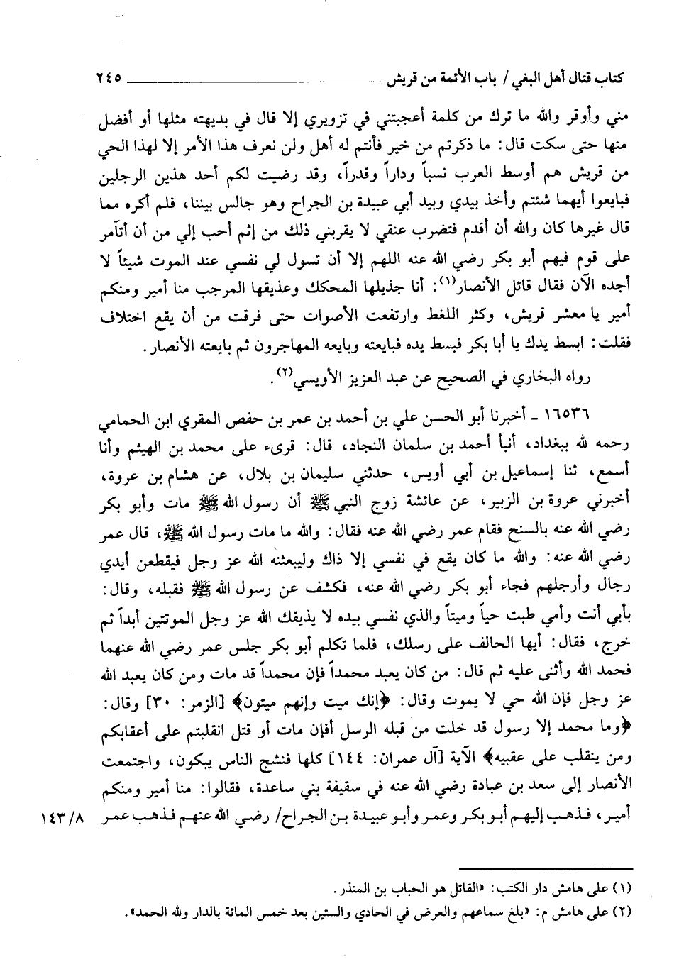 16536 - أَخْبَرَنَا أَبُو الْحَسَنِ عَلِيُّ بْنُ أَحْمَدَ بْنِ عُمَرَ بْنِ حَفْصٍ الْمُقْرِيُّ ابْنُ الْحَمَّامِيِّ، رَحِمَهُ اللهُ بِبَغْدَادَ , أَنْبَأَ أَحْمَدُ بْنُ سَلْمَانَ النَّجَّادُ، قَالَ: قُرِئَ عَلَى مُحَمَّدِ بْنِ الْهَيْثَمِ , وَأَنَا أَسْمَعُ، ثَنَا إِسْمَاعِيلُ بْنُ أَبِي أُوَيْسٍ، حَدَّثَنِي سُلَيْمَانُ بْنُ بِلَالٍ، عَنْ هِشَامِ بْنِ عُرْوَةَ، أَخْبَرَنِي عُرْوَةُ بْنُ الزُّبَيْرِ، عَنْ عَائِشَةَ، زَوْجِ النَّبِيِّ صَلَّى اللهُ عَلَيْهِ وَسَلَّمَ , أَنَّ رَسُولَ اللهِ صَلَّى اللهُ عَلَيْهِ وَسَلَّمَ مَاتَ وَأَبُو بَكْرٍ رَضِيَ اللهُ عَنْهُ بِالسُّنْحِ , فَقَامَ عُمَرُ رَضِيَ اللهُ عَنْهُ فَقَالَ: وَاللهِ مَا مَاتَ رَسُولُ اللهِ صَلَّى اللهُ عَلَيْهِ وَسَلَّمَ، قَالَ عُمَرُ رَضِيَ اللهُ عَنْهُ: وَاللهِ مَا كَانَ يَقَعُ فِي نَفْسِي إِلَّا ذَاكَ , وَلَيَبْعَثَنَّهُ اللهُ عَزَّ وَجَلَّ فَيَقْطَعَنَّ أَيْدِيَ رِجَالٍ وَأَرْجُلَهُمْ , فَجَاءَ أَبُو بَكْرٍ رَضِيَ اللهُ عَنْهُ فَكَشَفَ عَنْ رَسُولِ اللهِ صَلَّى اللهُ عَلَيْهِ وَسَلَّمَ فَقَبَّلَهُ وَقَالَ: بِأَبِي أَنْتَ وَأُمِّي طِبْتَ حَيًّا وَمَيِّتًا , وَالَّذِي نَفْسِي بِيَدِهِ لَا يُذِيقُكَ اللهُ عَزَّ وَجَلَّ الْمَوْتَتَيْنِ أَبَدًا , ثُمَّ خَرَجَ فَقَالَ: أَيُّهَا الْحَالِفُ عَلَى رِسْلِكَ , فَلَمَّا تَكَلَّمَ أَبُو بَكْرٍ جَلَسَ عُمَرُ رَضِيَ اللهُ عَنْهُمَا , فَحَمِدَ اللهَ وَأَثْنَى عَلَيْهِ ثُمَّ قَالَ: §مَنْ كَانَ يَعْبُدُ مُحَمَّدًا فَإِنَّ مُحَمَّدًا قَدْ مَاتَ , وَمَن كَانَ يَعْبُدُ اللهَ عَزَّ وَجَلَّ فَإِنَّ اللهَ حَيُّ لَا يَمُوتُ , وَقَالَ: {إِنَّكَ مَيِّتٌ وَإِنَّهُمْ مَيِّتُونَ} [الزمر: 30] , وَقَالَ: {وَمَا مُحَمَّدٌ إِلَّا رَسُولٌ قَدْ خَلَتْ مِنْ قَبْلِهِ الرُّسُلُ , أَفَإِنْ مَاتَ أَوْ قُتِلَ انْقَلَبْتُمْ عَلَى أَعْقَابِكُمْ , وَمَنْ يَنْقَلِبْ عَلَى عَقِبَيْهِ} [آل عمران: 144] الْآيَةَ كُلَّهَا , فَنَشَجَ النَّاسُ يَبْكُونَ , وَاجْتَمَعَتِ الْأَنْصَارُ إِلَى سَعْدِ بْنِ عُبَادَةَ رَضِيَ اللهُ عَنْهُ فِي سَقِيفَةِ بَنِي سَاعِدَةَ فَقَالُوا: مِنَّا أَمِيرٌ وَمِنْكُمْ أَمِيرٌ , فَذَهَبَ إِلَيْهِمْ أَبُو بَكْرٍ وَعُمَرُ وَأَبُو عُبَيْدَةَ بْنُ الْجَرَّاحِ رَضِيَ اللهُ عَنْهُمْ , فَذَهَبَ عُمَرُ -[246]- يَتَكَلَّمُ فَأَسْكَتَهُ أَبُو بَكْرٍ رَضِيَ اللهُ عَنْهُ , فَكَانَ عُمَرُ رَضِيَ اللهُ عَنْهُ يَقُولُ: وَاللهِ مَا أَرَدْتُ بِذَاكَ إِلَّا أَنِّي قَدْ هَيَّأْتُ كَلَامًا قَدْ أَعْجَبَنِي خَشِيتُ أَنْ لَا يَبْلُغَهُ أَبُو بَكْرٍ رَضِيَ اللهُ عَنْهُ , فَتَكَلَّمَ وَأَبْلَغَ فَقَالَ فِي كَلَامِهِ: نَحْنُ الْأُمَرَاءُ , وَأَنْتُمُ الْوُزَرَاءُ، قَالَ الْحُبَابُ بْنُ الْمُنْذِرِ: لَا وَاللهِ لَا نَفْعَلُ أَبَدًا , مِنَّا أَمِيرٌ وَمِنْكُمْ أَمِيرٌ، فَقَالَ أَبُو بَكْرٍ رَضِيَ اللهُ عَنْهُ: لَا , وَلَكِنَّا الْأُمَرَاءُ وَأَنْتُمُ الْوُزَرَاءُ , هُمْ أَوْسَطُ الْعَرَبِ دَارًا وَأَعْرَبُهُمْ أَحْسَابًا , فَبَايِعُوا عُمَرَ بْنَ الْخَطَّابِ أَوْ أَبَا عُبَيْدَةَ بْنَ الْجَرَّاحِ رَضِيَ اللهُ عَنْهُمَا، فَقَالَ عُمَرُ: بَلْ نُبَايِعُكَ , أَنْتَ خَيْرُنَا وَسَيِّدُنَا وَأَحَبُّ إِلَى رَسُولِ اللهِ صَلَّى اللهُ عَلَيْهِ وَسَلَّمَ , وَأَخَذَ عُمَرُ بِيَدِهِ فَبَايَعَهُ وَبَايَعَهُ النَّاسُ، فَقَالَ قَائِلٌ: قَتَلْتُمْ سَعْدَ بْنَ عُبَادَةَ، فَقَالَ عُمَرُ: قَتَلَهُ اللهُ رَوَاهُ الْبُخَارِيُّ فِي الصَّحِيحِ، عَنْ إِسْمَاعِيلَ بْنِ أَبِي أُوَيْسٍ