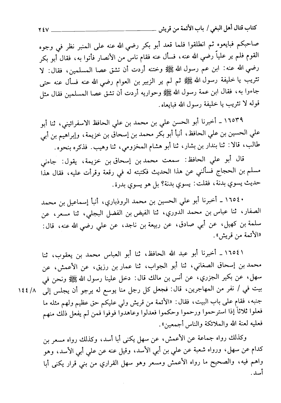 16540 - أَخْبَرَنَا أَبُو عَلِيٍّ الْحُسَيْنُ بْنُ مُحَمَّدٍ الرُّوذْبَارِيُّ، أَنْبَأَ إِسْمَاعِيلُ بْنُ مُحَمَّدٍ الصَّفَّارُ، ثَنَا عَبَّاسُ بْنُ مُحَمَّدٍ الدُّورِيُّ، ثَنَا الْفَيْضُ بْنُ الْفَضْلِ الْبَجَلِيُّ، ثَنَا مِسْعَرٌ، عَنْ سَلَمَةَ بْنِ كُهَيْلٍ، عَنْ أَبِي صَادِقٍ، عَنْ رَبِيعَةَ بْنِ نَاجِذٍ، عَنْ عَلِيٍّ، رَضِيَ اللهُ عَنْهُ أَنَّ النَّبِيَّ صَلَّى اللهُ عَلَيْهِ وَسَلَّمَ، قَالَ: §الْأَئِمَّةُ مِنْ قُرَيْشٍ