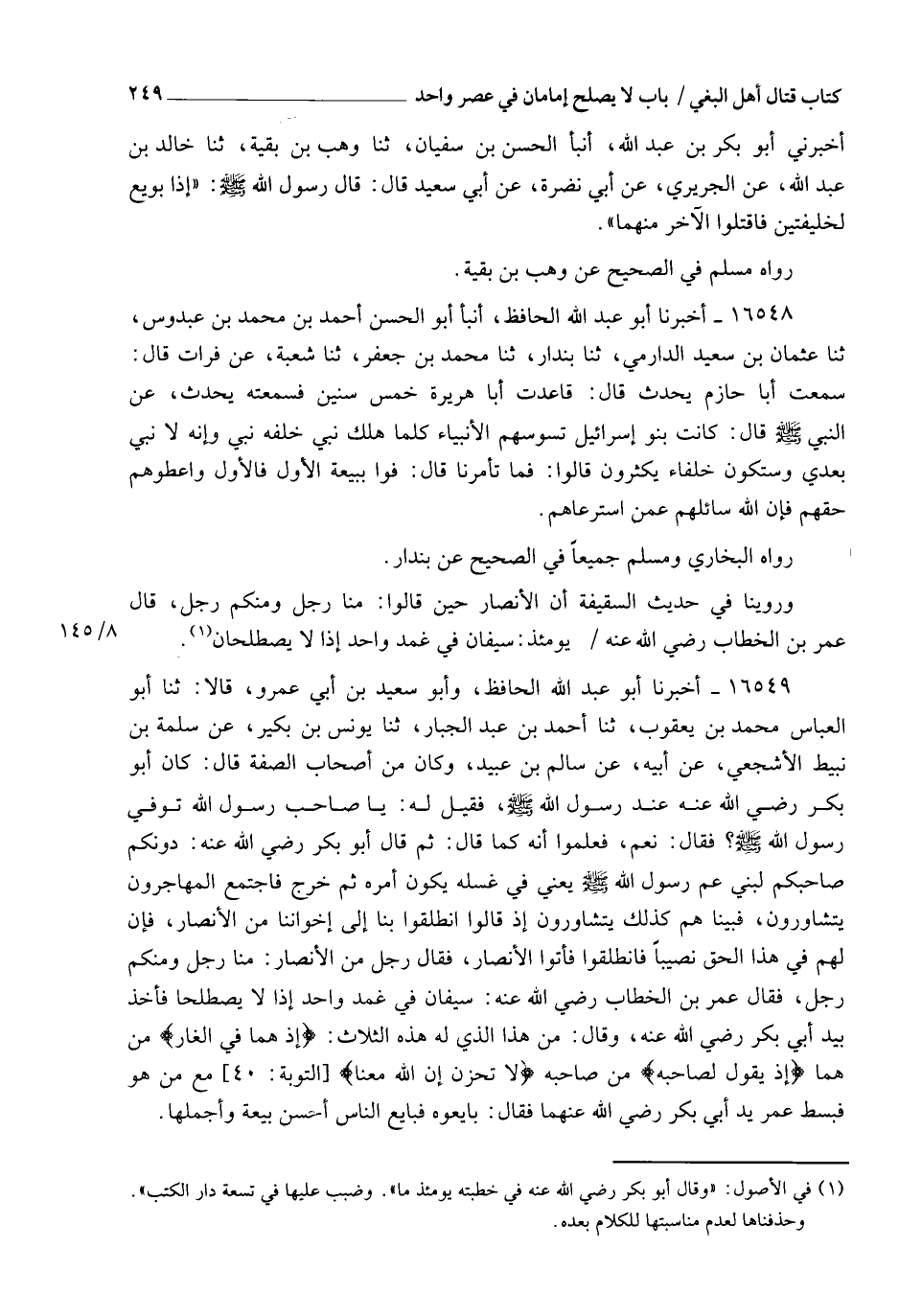 16549 - وَقَالَ أَبُو بَكْرٍ رَضِيَ اللهُ عَنْهُ فِي خُطْبَتِهِ يَوْمَئِذٍ مَا أَخْبَرَنَا أَبُو عَبْدِ اللهِ الْحَافِظُ، وَأَبُو سَعِيدِ بْنُ أَبِي عَمْرٍو، قَالَا: ثَنَا أَبُو الْعَبَّاسِ مُحَمَّدُ بْنُ يَعْقُوبَ، ثَنَا أَحْمَدُ بْنُ عَبْدِ الْجَبَّارِ، ثَنَا يُونُسُ بْنُ بُكَيْرٍ، عَنْ سَلَمَةَ بْنِ نُبَيْطٍ الْأَشْجَعِيِّ، عَنْ أَبِيهِ، عَنْ سَالِمِ بْنِ عُبَيْدٍ، وَكَانَ مِنْ أَصْحَابِ الصُّفَّةِ، قَالَ: كَانَ أَبُو بَكْرٍ رَضِيَ اللهُ عَنْهُ عِنْدَ رَسُولِ اللهِ صَلَّى اللهُ عَلَيْهِ وَسَلَّمَ فَقِيلَ لَهُ: يَا صَاحِبَ رَسُولِ اللهِ تُوُفِّيَ رَسُولُ اللهِ صَلَّى اللهُ عَلَيْهِ وَسَلَّمَ؟ فَقَالَ: نَعَمْ. فَعَلِمُوا أَنَّهُ كَمَا قَالَ , ثُمَّ قَالَ أَبُو بَكْرٍ رَضِيَ اللهُ عَنْهُ: دُونَكُمْ صَاحِبَكُمْ، لِبَنِي عَمِّ رَسُولِ اللهِ صَلَّى اللهُ عَلَيْهِ وَسَلَّمَ , يَعْنِي فِي غُسْلِهِ يَكُونُ أَمْرُهُ , ثُمَّ خَرَجَ فَاجْتَمَعَ الْمُهَاجِرُونَ يَتَشَاوَرُونَ , فَبَيْنَا هُمْ كَذَلِكَ يَتَشَاوَرُونَ إِذْ قَالُوا: انْطَلِقُوا بِنَا إِلَى إِخْوَانِنَا مِنَ الْأَنْصَارِ , فَإِنَّ لَهُمْ فِي هَذَا الْحَقِّ نَصِيبًا , فَانْطَلَقُوا فَأَتَوُا الْأَنْصَارَ , فَقَالَ رَجُلٌ مِنَ الْأَنْصَارِ: مِنَّا رَجُلٌ وَمِنْكُمْ رَجُلٌ، فَقَالَ عُمَرُ بْنُ الْخَطَّابِ رَضِيَ اللهُ عَنْهُ: §" سَيْفَانِ فِي غِمْدٍ وَاحِدٍ إِذًا لَا يَصْطَلِحَا , فَأَخَذَ بِيَدِ أَبِي بَكْرٍ رَضِيَ اللهُ عَنْهُ , وَقَالَ: مَنْ هَذَا الَّذِي لَهُ هَذِهِ الثَّلَاثُ: {إِذْ هُمَا فِي الْغَارِ} [التوبة: 40] مَنْ هُمَا؟ {إِذْ يَقُولُ لِصَاحِبِهِ} [التوبة: 40] مَنْ صَاحِبُهُ؟ {لَا تَحْزَنْ إِنَّ اللهَ مَعَنَا} [التوبة: 40] مَعَ مَنْ هُوَ؟ فَبَسَطَ عُمَرُ يَدَ أَبِي بَكْرٍ رَضِيَ اللهُ عَنْهُمَا، فَقَالَ: بَايَعُوهُ , فَبَايَعَ النَّاسُ أَحْسَنَ بَيْعَةٍ وَأَجْمَلَهَا