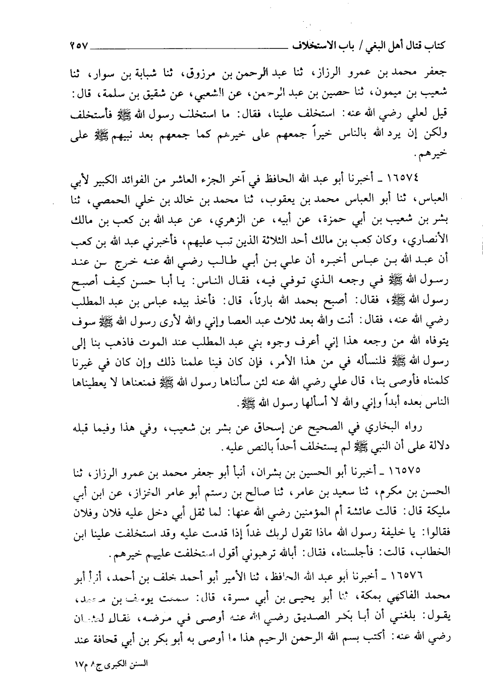 16574 - أَخْبَرَنَا أَبُو عَبْدِ اللهِ الْحَافِظُ , فِي آخِرِ الْجُزْءِ الْعَاشِرِ مِنَ الْفَوَائِدِِ الْكَبِيرِ لِأَبِي الْعَبَّاسِ , ثَنَا أَبُو الْعَبَّاسِ مُحَمَّدُ بْنُ يَعْقُوبَ , ثَنَا مُحَمَّدُ بْنُ خَالِدِ بْنِ خُلِيٍّ الْحِمْصِيُّ , ثَنَا بِشْرُ بْنُ شُعَيْبِ بْنِ أَبِي حَمْزَةَ، عَنْ أَبِيهِ، عَنِ الزُّهْرِيِّ، عَنْ عَبْدِ اللهِ بْنِ كَعْبِ بْنِ مَالِكٍ الْأَنْصَارِيِّ , وَكَانَ كَعْبُ بْنُ مَالِكٍ أَحَدَ الثَّلَاثَةِ الَّذِينَ تِيبَ عَلَيْهِمْ , فَأَخْبَرَنِي عَبْدُ اللهِ بْنُ كَعْبٍ , أَنَّ عَبْدَ اللهِ بْنَ عَبَّاسٍ أَخْبَرَهُ , أَنَّ عَلِيَّ بْنَ أَبِي طَالِبٍ رَضِيَ اللهُ عَنْهُ خَرَجَ مِنْ عِنْدِ رَسُولِ اللهِ صَلَّى اللهُ عَلَيْهِ وَسَلَّمَ فِي وَجَعِهِ الَّذِي تُوُفِّيَ فِيهِ، فَقَالَ النَّاسُ: يَا أَبَا حَسَنٍ كَيْفَ أَصْبَحَ رَسُولُ اللهِ صَلَّى اللهُ عَلَيْهِ وَسَلَّمَ؟ فَقَالَ: أَصْبَحَ بِحَمْدِ اللهِ بَارِئًا، قَالَ: فَأَخَذَ بِيَدِهِ عَبَّاسُ بْنُ عَبْدِ الْمُطَّلِبِ رَضِيَ اللهُ عَنْهُ، فَقَالَ: أَنْتَ وَاللهِ بَعْدَ ثَلَاثٍ عَبْدُ الْعَصَا , وَإِنِّي وَاللهِ لَأَرَى رَسُولَ اللهِ صَلَّى اللهُ عَلَيْهِ وَسَلَّمَ سَوْفَ يَتَوَفَّاهُ اللهُ مِنْ وَجَعِهِ هَذَا , إِنِّي أَعْرِفُ وُجُوهَ بَنِي عَبْدِ الْمُطَّلِبِ عِنْدَ الْمَوْتِ , فَاذْهَبْ بِنَا إِلَى رَسُولِ اللهِ صَلَّى اللهُ عَلَيْهِ وَسَلَّمَ فَلْنَسْأَلْهُ فِي مَنْ هَذَا الْأَمْرُ , فَإِنْ كَانَ فِينَا عَلِمْنَا ذَلِكَ , وَإِنْ كَانَ فِي غَيْرِنَا كَلَّمْنَاهُ فَأَوْصَى بِنَا، قَالَ عَلِيٌّ رَضِيَ اللهُ عَنْهُ: §إِنَّا وَاللهِ لَئِنْ سَأَلْنَاهَا رَسُولَ اللهِ صَلَّى اللهُ عَلَيْهِ وَسَلَّمَ فَمَنَعَنَاهَا , لَا يُعْطِينَاهَا النَّاسُ بَعْدَهُ أَبَدًا , وَإِنِّي وَاللهِ لَا أَسْأَلُهَا رَسُولَ اللهِ صَلَّى اللهُ عَلَيْهِ وَسَلَّمَ. رَوَاهُ الْبُخَارِيُّ فِي الصَّحِيحِ عَنْ إِسْحَاقَ، عَنْ بِشْرِ بْنِ شُعَيْبٍ , وَفِي هَذَا وَفِيمَا قَبْلَهُ دَلَالَةٌ عَلَى أَنَّ النَّبِيَّ صَلَّى اللهُ عَلَيْهِ وَسَلَّمَ لَمْ يَسْتَخْلِفْ أَحَدًا بِالنَّصِّ عَلَيْهِ