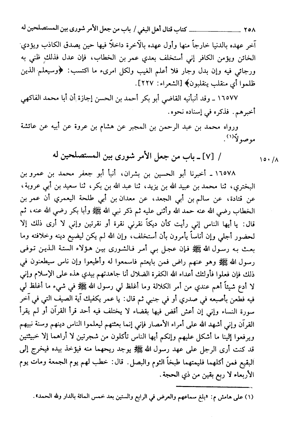 16578 - أَخْبَرَنَا أَبُو الْحُسَيْنِ بْنُ بِشْرَانَ، أَنْبَأَ أَبُو جَعْفَرٍ مُحَمَّدُ بْنُ عَمْرِو بْنِ الْبَخْتَرِيِّ , ثَنَا مُحَمَّدُ بْنُ عُبَيْدِ اللهِ بْنِ يَزِيدَ، ثَنَا عَبْدُ اللهِ بْنُ بَكْرٍ، ثَنَا سَعِيدُ بْنُ أَبِي عَرُوبَةَ، عَنْ قَتَادَةَ، عَنْ سَالِمِ بْنِ أَبِي الْجَعْدِ، عَنْ مَعْدَانَ بْنِ أَبِي طَلْحَةَ الْيَعْمُرِيِّ، أَنّ عُمَرَ بْنَ الْخَطَّابِ، رَضِيَ اللهُ عَنْهُ , حَمِدَ اللهَ وَأَثْنَى عَلَيْهِ ثُمَّ ذَكَرَ نَبِيَّ اللهِ صَلَّى اللهُ عَلَيْهِ وَسَلَّمَ، وَأَبَا بَكْرٍ رَضِيَ اللهُ عَنْهُ , ثُمَّ قَالَ: يَا أَيُّهَا النَّاسُ إِنِّي §رَأَيْتُ كَأَنَّ دِيكًا نَقَرَنِي نَقْرَةً أَوْ نَقْرَتَيْنِ , وَإِنِّي لَا أَرَى ذَلِكَ إِلَّا لِحُضُورِ أَجْلِي , وَإِنَّ أُنَاسًا يَأْمُرُونَ بِأَنْ أَسْتَخْلِفَ , وَإِنَّ اللهَ لَمْ يَكُنْ لِيُضِيعَ دِينَهُ وَخِلَافَتَهُ وَمَا بَعَثَ بِهِ رَسُولَ اللهِ صَلَّى اللهُ عَلَيْهِ وَسَلَّمَ , فَإِنْ عَجِلَ بِي أَمْرٌ فَالشُّورَى بَيْنَ هَؤُلَاءِ السِّتَّةِ الَّذِينَ تُوُفِّيَ رَسُولُ اللهِ صَلَّى اللهُ عَلَيْهِ وَسَلَّمَ وَهُوَ عَنْهُمْ رَاضٍ , فَمَنْ بَايَعْتُمْ فَاسْمَعُوا لَهُ وَأَطِيعُوا , وَإِنَّ نَاسًا سَيَطْعَنُونَ فِي ذَلِكَ , فَإِنْ فَعَلُوا فَأُولَئِكَ أَعْدَاءُ اللهِ الْكَفَرَةُ الضُّلَّالُ , أَنَا جَاهَدْتُهُمْ بِيَدِي هَذِهِ عَلَى الْإِسْلَامِ , وَإِنِّي لَا أَدَعُ شَيْئًا أَهَمَّ عِنْدِي مِنْ أَمْرِ الْكَلَالَةِ , وَمَا أَغْلَظَ لِي رَسُولُ اللهِ صَلَّى اللهُ عَلَيْهِ وَسَلَّمَ فِي شَيْءٍ مَا أَغْلَظَ لِي فِيهِ , فَطَعَنَ بِأُصْبُعِهِ فِي صَدْرِي , أَوْ فِي جَنْبِي , ثُمَّ قَالَ: " يَا عُمَرُ يَكْفِيكَ آيَةُ الصَّيْفِ الَّتِي فِي آخِرِ سُورَةِ النِّسَاءِ , وَإِنِّي إِنْ أَعِشْ أَقْضِ فِيهَا بِقَضَاءٍ لَا يَخْتَلِفُ فِيهِ أَحَدٌ قَرَأَ الْقُرْآنَ , أَوْ لَمْ يَقْرَأِ الْقُرْآنَ " , وَإِنِّي أُشْهِدُ اللهَ عَلَى أُمَرَاءِ الْأَمْصَارِ , فَإِنِّي إِنَّمَا بَعَثْتُهُمْ لِيُعَلِّمُوا النَّاسَ دِينَهُمْ وَسُنَّةَ نَبِيِّهِمْ , وَيَرْفَعُوا إِلَيْنَا مَا أَشْكَلَ عَلَيْهِمْ , وَإِنَّكُمْ أَيُّهَا النَّاسُ تَأْكُلُونَ مِنْ شَجَرَتَيْنِ لَا أُرَاهُمَا إِلَّا خَبِيثَتَيْنِ , قَدْ كُنْتُ أَرَى الرَّجُلَ عَلَى عَهْدِ رَسُولِ اللهِ صَلَّى اللهُ عَلَيْهِ وَسَلَّمَ يُوجَدُ رِيحُهُمَا مِنْهُ فَيُؤْخَذُ بِيَدِهِ فَيَخْرُجُ إِلَى الْبَقِيعِ , فَمَنْ أَكَلَهُمَا فَلْيُمِتْهُمَا طَبْخًا: الثُّومُ وَالْبَصَلُ. قَالَ: خَطَبَ لَهُمْ يَوْمَ الْجُمُعَةِ , وَمَاتَ يَوْمَ الْأَرْبِعَاءِ لِأَرْبَعٍ بَقِينَ مِنْ ذِي الْحِجَّةِ -[259]- أَخْرَجَهُ مُسْلِمٌ فِي الصَّحِيحِ مِنْ حَدِيثِ ابْنِ أَبِي عَرُوبَةَ وَغَيْرِهِ