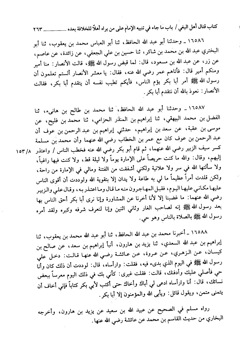 16586 - وَحَدَّثَنَا أَبُو عَبْدِ اللهِ الْحَافِظُ، ثَنَا أَبُو الْعَبَّاسِ مُحَمَّدُ بْنُ يَعْقُوبَ، ثَنَا أَبُو الْبَخْتَرِيِّ عَبْدُ اللهِ بْنُ مُحَمَّدِ بْنِ شَاكِرٍ، ثَنَا حُسَيْنُ بْنُ عَلِيٍّ الْجُعْفِيُّ، عَنْ زَائِدَةَ، عَنْ عَاصِمٍ، عَنْ زِرٍّ، عَنْ عَبْدِ اللهِ بْنِ مَسْعُودٍ، قَالَ: لَمَّا قُبِضَ رَسُولُ اللهِ صَلَّى اللهُ عَلَيْهِ وَسَلَّمَ قَالَتِ الْأَنْصَارُ: " §مِنَّا أَمِيرٌ وَمِنْكُمْ أَمِيرٌ، قَالَ: فَأَتَاهُمْ عُمَرُ رَضِيَ اللهُ عَنْهُ فَقَالَ: يَا مَعْشَرَ الْأَنْصَارِ أَلَسْتُمْ تَعْلَمُونَ أَنَّ رَسُولَ اللهِ صَلَّى اللهُ عَلَيْهِ وَسَلَّمَ أَمَرَ أَبَا بَكْرٍ يَؤُمَّ النَّاسَ , فَأَيُّكُمْ تَطِيبُ نَفْسُهُ أَنْ يَتَقَدَّْمَ أَبَا بَكْرٍ؟ فَقَالَتِ الْأَنْصَارُ: نَعُوذُ بِاللهِ أَنْ نَتَقَدَّْمَ أَبَا بَكْرٍ "