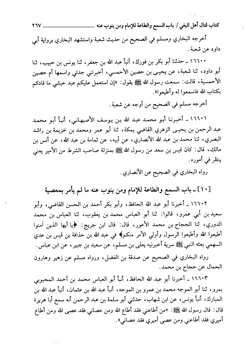 16603 - أَخْبَرَنَا أَبُو عَبْدِ اللهِ الْحَافِظُ، أَنْبَأَ أَبُو الْعَبَّاسِ مُحَمَّدُ بْنُ أَحْمَدَ الْمَحْبُوبِيُّ بِمَرْوٍ , ثَنَا أَبُو الْمُوَجِّهِ مُحَمَّدُ بْنُ عَمْرِو بْنِ الْمُوَجِّهِ , أَنْبَأَ عَبْدُ اللهِ بْنُ عُثْمَانَ، أَنْبَأَ عَبْدُ اللهِ بْنُ الْمُبَارَكِ، أَنْبَأَ يُونُسُ، عَنِ ابْنِ شِهَابٍ، حَدَّثَنِي أَبُو سَلَمَةَ بْنُ عَبْدِ الرَّحْمَنِ، أَنَّهُ سَمِعَ أَبَا هُرَيْرَةَ، قَالَ: قَالَ رَسُولُ اللهِ صَلَّى اللهُ عَلَيْهِ وَسَلَّمَ: §" مَنْ أَطَاعَنِي فَقَدْ أَطَاعَ اللهَ , وَمَنْ عَصَانِي فَقَدْ عَصَى اللهَ , وَمَن أَطَاعَ أَمِيرِي فَقَدْ أَطَاعَنِي , وَمَن عَصَى أَمِيرِي فَقَدْ عَصَانِي " -[268]- رَوَاهُ الْبُخَارِيُّ فِي الصَّحِيحِ عَنْ عَبْدَانَ , وَأَخْرَجَهُ مُسْلِمٌ مِنْ وَجْهٍ آخَرَ عَنْ يُونُسَ