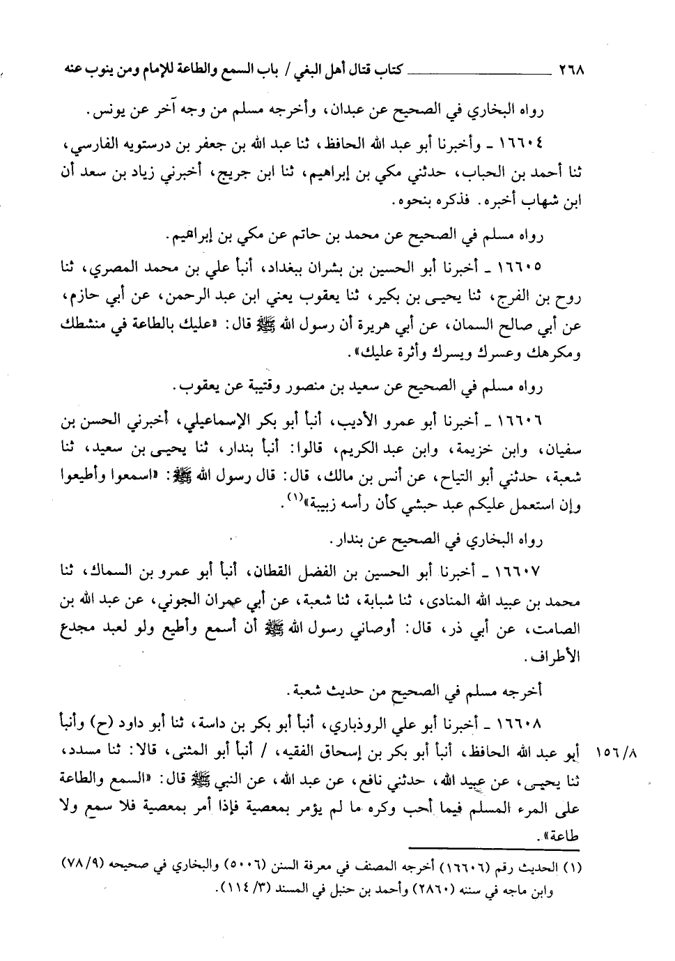 16608 - أَخْبَرَنَا أَبُو عَلِيٍّ الرُّوذْبَارِيُّ، أَنْبَأَ أَبُو بَكْرِ بْنُ دَاسَةَ، ثَنَا أَبُو دَاوُدَ، ح وَأَنْبَأَ أَبُو عَبْدِ اللهِ الْحَافِظُ، أَنْبَأَ أَبُو بَكْرِ بْنُ إِسْحَاقَ الْفَقِيهُ، أَنْبَأَ أَبُو الْمُثَنَّى، قَالَا: ثَنَا مُسَدَّدٌ، ثَنَا يَحْيَى، عَنْ عُبَيْدِ اللهِ، حَدَّثَنِي نَافِعٌ، عَنْ عَبْدِ اللهِ، عَنِ النَّبِيِّ صَلَّى اللهُ عَلَيْهِ وَسَلَّمَ قَالَ: §" السَّمْعُ وَالطَّاعَةُ عَلَى الْمَرْءِ الْمُسْلِمِ فِيمَا أَحَبَّ وَكَرِهَ , مَا لَمْ يُؤْمَرْ بِمَعْصِيَةٍ , فَإِذَا أُمِرَ بِمَعْصِيَةٍ فَلَا سَمْعَ وَلَا طَاعَةَ " -[269]- رَوَاهُ الْبُخَارِيُّ فِي الصَّحِيحِ عَنْ مُسَدَّدٍ , وَأَخْرَجَهُ مُسْلِمٌ عَنْ زُهَيْرِ بْنِ حَرْبٍ وَغَيْرِهِ، عَنْ يَحْيَى بْنِ سَعِيدٍ