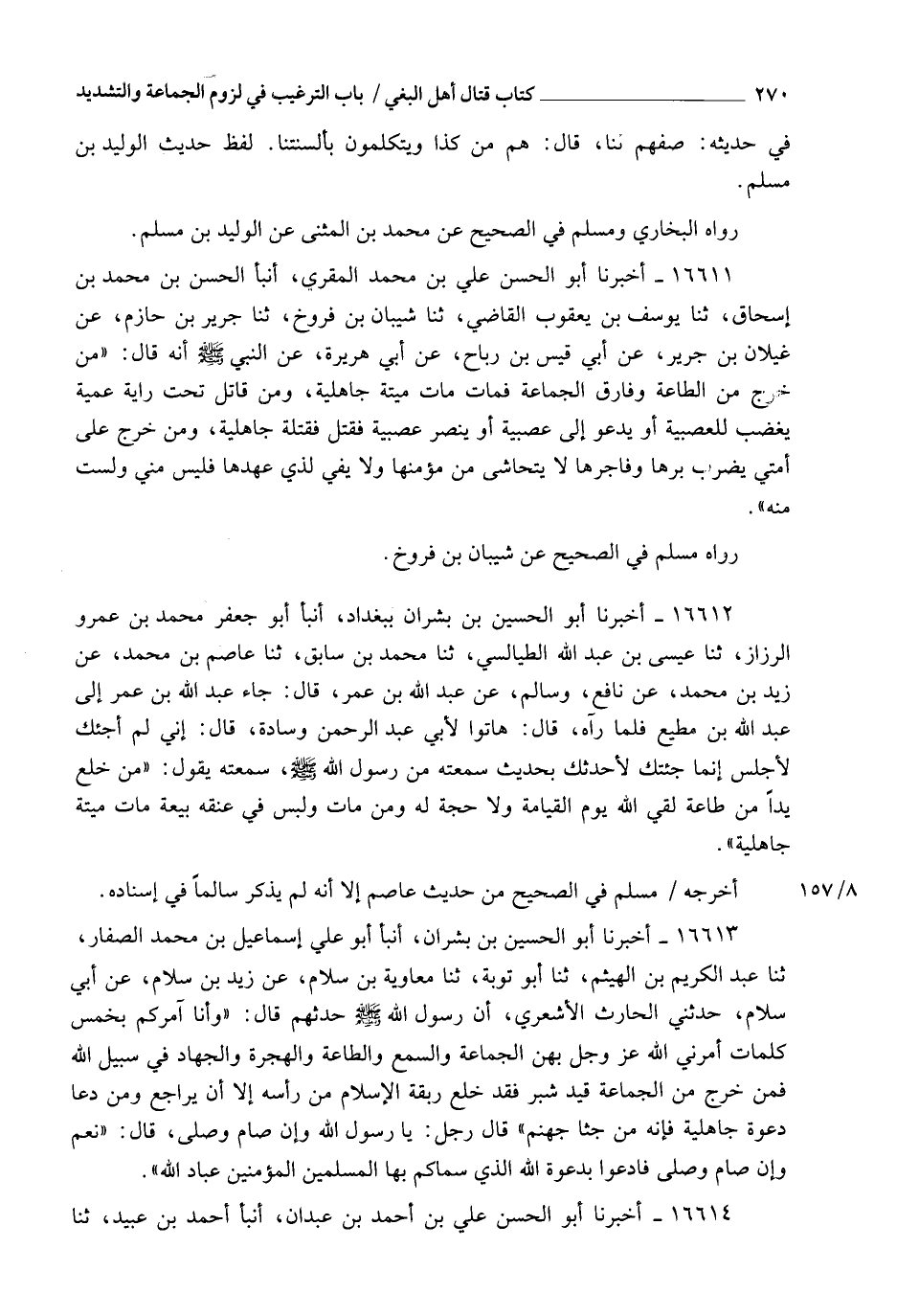 16612 - أَخْبَرَنَا أَبُو الْحُسَيْنِ بْنُ بِشْرَانَ، بِبَغْدَادَ , أَنْبَأَ أَبُو جَعْفَرٍ مُحَمَّدُ بْنُ عَمْرٍو الرُّزَازُ , ثَنَا عِيسَى بْنُ عَبْدِ اللهِ الطَّيَالِسِيُّ، ثَنَا مُحَمَّدُ بْنُ سَابِقٍ، ثَنَا عَاصِمُ بْنُ مُحَمَّدٍ، عَنْ زَيْدِ بْنِ مُحَمَّدٍ، عَنْ نَافِعٍ، وَسَالِمٍ، عَنْ عَبْدِ اللهِ بْنِ عُمَرَ، قَالَ: جَاءَ عَبْدُ اللهِ بْنُ عُمَرَ إِلَى عَبْدِ اللهِ بْنِ مُطِيعٍ , فَلَمَّا رَآهُ قَالَ: هَاتُوا لِأَبِي عَبْدِ الرَّحْمَنِ وِسَادَةً، قَالَ: إِنِّي لَمْ أَجِئْكَ لِأَجْلِسَ , إِنَّمَا جِئْتُكَ لِأُحَدِّثَكَ بِحَدِيثٍ سَمِعْتُهُ مِنْ رَسُولِ اللهِ صَلَّى اللهُ عَلَيْهِ وَسَلَّمَ , سَمِعْتُهُ يَقُولُ: §" مَنْ خَلَعَ يَدًا مِنْ طَاعَةٍ لَقِيَ اللهَ يَوْمَ الْقِيَامَةِ وَلَا حُجَّةَ لَهُ , وَمَنْ مَاتَ وَلَيْسَ فِي عُنُقِهِ بَيْعَةٌ مَاتَ مِيتَةً جَاهِلِيَّةً " أَخْرَجَهُ مُسْلِمٌ فِي الصَّحِيحِ مِنْ حَدِيثِ عَاصِمٍ , إِلَّا أَنَّهُ لَمْ يَذْكُرْ سَالِمًا فِي إِسْنَادِهِ