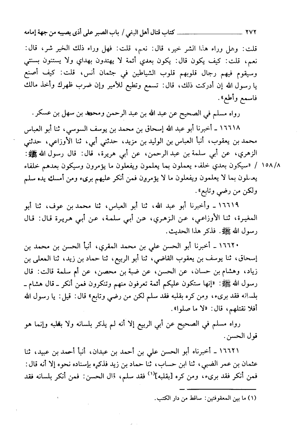 16620 - أَخْبَرَنَا أَبُو الْحَسَنِ عَلِيُّ بْنُ مُحَمَّدٍ الْمُقْرِيُّ , أَنْبَأَ الْحَسَنُ بْنُ مُحَمَّدِ بْنِ إِسْحَاقَ، ثَنَا يُوسُفُ بْنُ يَعْقُوبَ الْقَاضِي، ثَنَا أَبُو الرَّبِيعِ، ثَنَا حَمَّادُ بْنُ زَيْدٍ، ثَنَا الْمُعَلَّى بْنُ زِيَادٍ، وَهِشَامُ بْنُ حَسَّانَ، عَنِ الْحَسَنِ، عَنْ ضَبَّةَ بْنِ مِحْصَنٍ، عَنْ أُمِّ سَلَمَةَ، قَالَتْ: قَالَ رَسُولُ اللهِ صَلَّى اللهُ عَلَيْهِ وَسَلَّمَ: إِنَّهَا §" سَتَكُونُ عَلَيْكُمْ أَئِمَّةٌ تَعْرِفُونَ مِنْهُمْ وَتُنْكِرُونَ , فَمَنْ أَنْكَرَ قَالَ هِشَامٌ: بِلِسَانِهِ فَقَدْ بَرِئَ , وَمَنْ كَرِهَ بِقَلْبِهِ فَقَدْ سَلِمَ , لَكِنْ مَنْ رَضِيَ وَتَابَعَ "، قَالَ: قِيلَ: يَا رَسُولَ اللهِ أَفَلَا نَقْتُلُهُمْ؟ قَالَ: " لَا , مَا صَلُّوا " رَوَاهُ مُسْلِمٌ فِي الصَّحِيحِ عَنْ أَبِي الرَّبِيعِ إِلَّا أَنَّهُ لَمْ يَذْكُرْ بِلِسَانِهِ , وَلَا بِقَلْبِهِ , وَإِنَّمَا هُوَ قَوْلُ الْحَسَنِ.