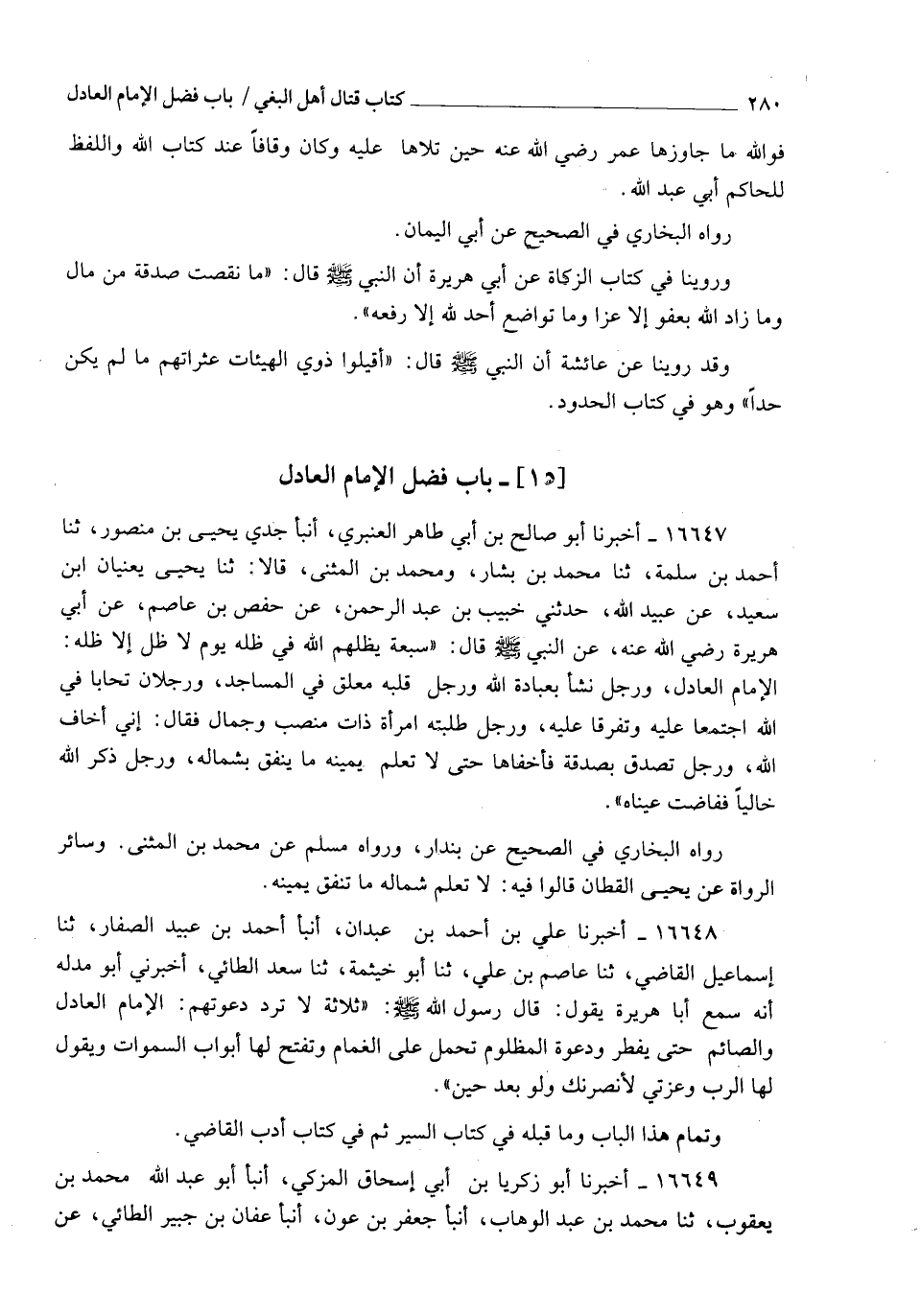 16647 - أَخْبَرَنَا أَبُو صَالِحِ بْنُ أَبِي طَاهِرٍ الْعَنْبَرِيُّ، أَنْبَأَ جَدِّي يَحْيَى بْنُ مَنْصُورٍ , ثَنَا أَحْمَدُ بْنُ سَلَمَةَ، ثَنَا مُحَمَّدُ بْنُ بَشَّارٍ، وَمُحَمَّدُ بْنُ الْمُثَنَّى، قَالَا: ثَنَا يَحْيَى يَعْنِيَانِ ابْنَ سَعِيدٍ، عَنْ عُبَيْدِ اللهِ، حَدَّثَنِي خُبَيْبُ بْنُ عَبْدِ الرَّحْمَنِ، عَنْ حَفْصِ بْنِ عَاصِمٍ، عَنْ أَبِي هُرَيْرَةَ، رَضِيَ اللهُ عَنْهُ، عَنِ النَّبِيِّ صَلَّى اللهُ عَلَيْهِ وَسَلَّمَ قَالَ: §" سَبْعَةٌ يُظِلُّهُمُ اللهُ فِي ظِلِّهِ يَوْمَ لَا ظِلَّ إِلَّا ظِلُّهُ: الْإِمَامُ الْعَادِلُ , وَرَجُلٌ نَشَأَ بِعِبَادَةِ اللهِ , وَرَجُلٌ قَلْبُهُ مُعَلَّقٌ فِي الْمَسَاجِدِ , وَرَجُلَانِ تَحَابَّا فِي اللهِ اجْتَمَعَا عَلَيْهِ وَتَفَرَّقَا عَلَيْهِ , وَرَجُلٌ طَلَبَتْهُ امْرَأَةٌ ذَاتُ مَنْصِبٍ وَجَمَالٍ فَقَالَ: إِنِّي أَخَافُ اللهَ , وَرَجُلٌ تَصَدَّقَ بِصَدَقَةٍ فَأَخْفَاهَا حَتَّى لَا تَعْلَمَ يَمِينُهُ مَا يُنْفِقُ بِشِمَالِهِ , وَرَجُلٌ ذَكَرَ اللهَ خَالِيًا فَفَاضَتْ عَيْنَاهُ " رَوَاهُ الْبُخَارِيُّ فِي الصَّحِيحِ عَنْ بُنْدَارٍ , وَرَوَاهُ مُسْلِمٌ عَنْ مُحَمَّدِ بْنِ الْمُثَنَّى. وَسَائِرُ الرُّوَاةِ عَنْ يَحْيَى الْقَطَّانِ، قَالُوا فِيهِ: " لَا تَعْلَمُ شِمَالُهُ مَا تُنْفِقُ يَمِينُهُ "