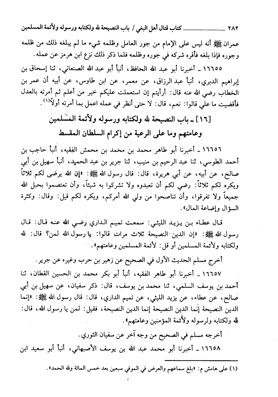 16656 - أَخْبَرَنَا أَبُو طَاهِرٍ مُحَمَّدُ بْنُ مُحَمَّدِ بْنِ مِحْمَشٍ الْفَقِيهُ، , أَنْبَأَ حَاجِبُ بْنُ أَحْمَدَ الطُّوسِيُّ، ثَنَا عَبْدُ الرَّحِيمِ بْنُ مُنِيبٍ، ثَنَا جَرِيرُ بْنُ مُنِيبٍ، ثَنَا جَرِيرُ بْنُ عَبْدِ الْحَمِيدِ، أَنْبَأَ سُهَيْلُ بْنُ أَبِي صَالِحٍ، عَنْ أَبِيهِ، عَنْ أَبِي هُرَيْرَةَ، قَالَ: قَالَ رَسُولُ اللهِ صَلَّى اللهُ عَلَيْهِ وَسَلَّمَ: إِنَّ " §اللهَ يَرْضَى لَكُمْ ثَلَاثًا , وَيَكْرَهُ لَكُمْ ثَلَاثًا: رَضِيَ لَكُمْ أَنْ تَعْبُدُوهُ وَلَا تُشْرِكُوا بِه شَيْئًا , وَأَنْ تَعْتَصِمُوا بِحَبْلِ اللهِ جَمِيعًا وَلَا تَفَرَّقُوا , وَأَنْ تُنَاصِحُوا مَنْ وَلَّى اللهُ أَمَرَكُمْ , وَيَكْرَهُ لَكُمْ قِيلَ وَقَالَ , وَكَثْرَةَ السُّؤَالِ , وَإِضَاعَةَ الْمَالِ " قَالَ عَطَاءُ بْنُ يَزِيدَ اللَّيْثِيُّ: سَمِعْتُ تَمِيمًا الدَّارِيَّ رَضِيَ اللهُ عَنْهُ قَالَ: قَالَ رَسُولُ اللهِ صَلَّى اللهُ عَلَيْهِ وَسَلَّمَ: " إِنَّ الدِّينَ النَّصِيحَةُ " ثَلَاثَ مَرَّاتٍ، قَالُوا: يَا رَسُولَ اللهِ لِمَنْ؟ قَالَ: لِلَّهِ وَلِكِتَابِهِ وَلِأَئِمَّةِ الْمُسْلِمِينَ " , أَوْ قَالَ: " لِأَئِمَّةِ الْمُسْلِمِينَ وَعَامَّتِهِمْ " أَخْرَجَ مُسْلِمٌ الْحَدِيثَ الْأَوَّلَ فِي الصَّحِيحِ عَنْ زُهَيْرِ بْنِ حَرْبٍ وَغَيْرِهِ، عَنْ جَرِيرٍ