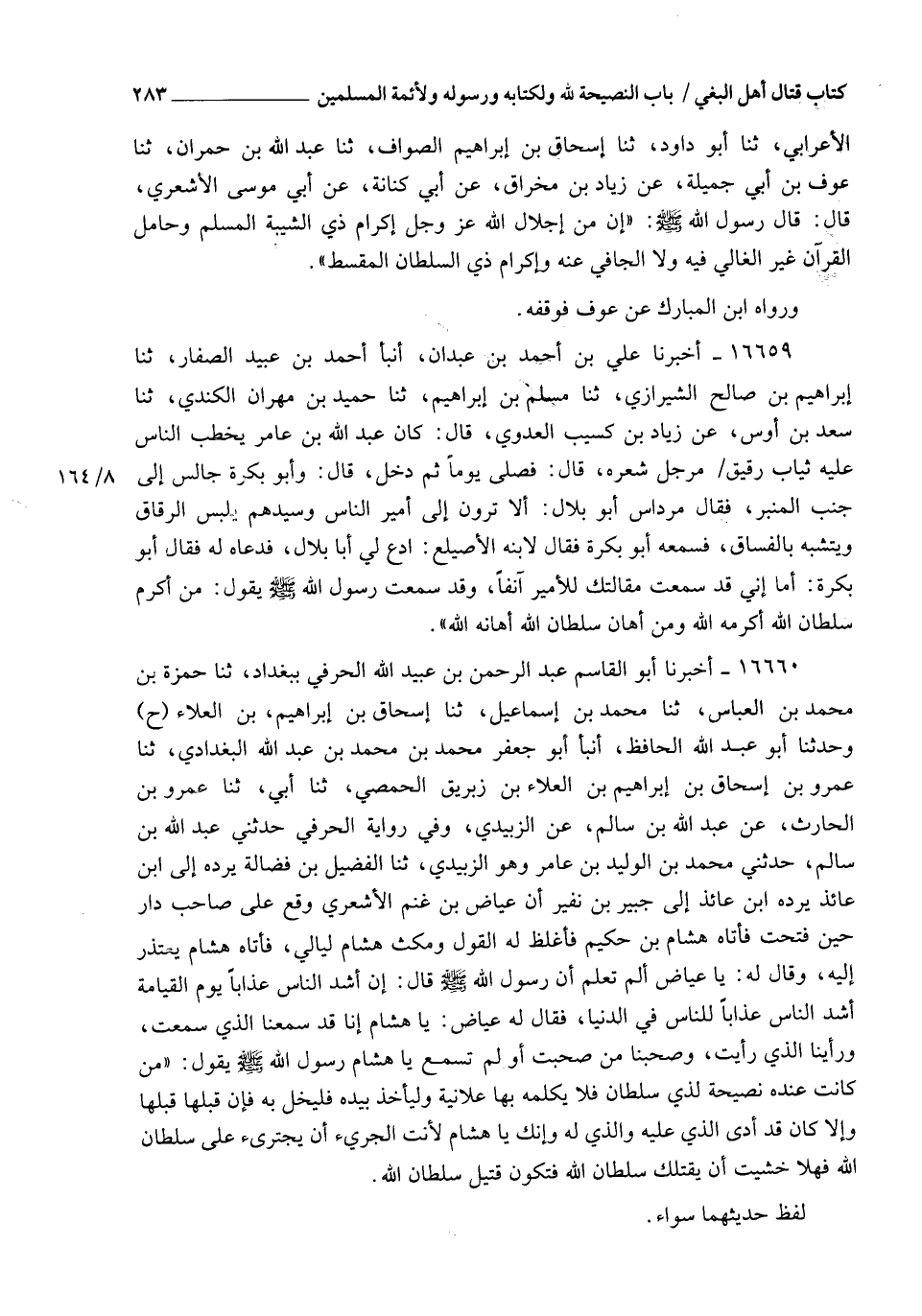 16660 - أَخْبَرَنَا أَبُو الْقَاسِمِ عَبْدُ الرَّحْمَنِ بْنُ عُبَيْدِ اللهِ الْحُرْفِيُّ، بِبَغْدَادَ , ثَنَا حَمْزَةُ بْنُ مُحَمَّدِ بْنِ الْعَبَّاسِ، ثَنَا مُحَمَّدُ بْنُ إِسْمَاعِيلَ، ثَنَا إِسْحَاقُ بْنُ إِبْرَاهِيمَ بْنِ الْعَلَاءِ، ح وَحَدَّثَنَا أَبُو عَبْدِ اللهِ الْحَافِظُ، أَنْبَأَ أَبُو جَعْفَرٍ مُحَمَّدُ بْنُ مُحَمَّدِ بْنِ عَبْدِ اللهِ الْبَغْدَادِيُّ، ثَنَا عَمْرُو بْنُ إِسْحَاقَ بْنِ إِبْرَاهِيمَ بْنِ الْعَلَاءِ بْنِ زِبْرِيقٍ الْحِمْصِيُّ، ثَنَا أَبِي، ثَنَا عَمْرُو بْنُ الْحَارِثِ، عَنْ عَبْدِ اللهِ بْنِ سَالِمٍ، عَنِ الزُّبَيْدِيِّ. وَفِي رِوَايَة ِ الْحُرْفِيِّ: حَدَّثَنِي عَبْدُ اللهِ بْنُ سَالِمٍ، حَدَّثَنِي مُحَمَّدُ بْنُ الْوَلِيدِ بْنِ عَامِرٍ وَهُوَ الزُّبَيْدِيُّ , ثَنَا الْفُضَيْلُ بْنُ فَضَالَةَ، يَرُدُّهُ إِلَى ابْنِ عَائِذٍ , يَرُدُّهُ ابْنُ عَائِذٍ إِلَى جُبَيْرِ بْنِ نُفَيْرٍ , أَنَّ عِيَاضَ بْنَ غَنْمٍ الْأَشْعَرِيَّ، وَقَعَ عَلَى صَاحِبِ دَارٍ حِينَ فُتِحَتْ , فَأَتَاهُ هِشَامُ بْنُ حَكِيمٍ فَأَغْلَظَ لَهُ الْقَوْلَ , وَمَكَثَ هِشَامٌ لَيَالِيَ , فَأَتَاهُ هِشَامٌ يَعْتَذِرُ إِلَيْهِ وَقَالَ لَهُ: يَا عِيَاضُ أَلَمْ تَعْلَمْ أَنَّ رَسُولَ اللهِ صَلَّى اللهُ عَلَيْهِ وَسَلَّمَ قَالَ: " إِنَّ §" أَشَدَّ النَّاسِ عَذَابًا يَوْمَ الْقِيَامَةِ أَشَدُّ النَّاسِ عَذَابًا لِلنَّاسِ فِي الدُّنْيَا "، فَقَالَ لَهُ عِيَاضٌ: يَا هِشَامُ إِنَّا قَدْ سَمِعْنَا الَّذِي سَمِعْتَ , وَرَأَيْنَا الَّذِي رَأَيْتَ , وَصَحِبْنَا مَنْ صَحِبْتَ , أَوَ لَمْ تَسْمَعْ يَا هِشَامُ رَسُولَ اللهِ صَلَّى اللهُ عَلَيْهِ وَسَلَّمَ يَقُولُ: " مَنْ كَانَتْ عِنْدَهُ نَصِيحَةٌ لِذِي سُلْطَانٍ فَلَا يُكَلِّمْهُ بِهَا عَلَانِيَةً , وَلْيَأْخُذْ بِيَدِهِ فَلْيَخْلُ بِهِ , فَإِنْ قَبِلَهَا قَبِلَهَا , وَإِلَّا كَانَ قَدْ أَدَّى الَّذِي عَلَيْهِ وَالَّذِي لَهُ " وَإِنَّكَ يَا هِشَامُ لَأَنْتَ الْجَرِيءُ أَنْ يَجْتَرِئَ عَلَى سُلْطَانِ اللهِ , فَهَلَّا خَشِيتَ أَنْ يَقْتُلَكَ سُلْطَانُ اللهِ؛ فَتَكُونَ قَتِيلَ سُلْطَانِ اللهِ " لَفْظُ حَدِيثِهِمَا سَوَاءٌ