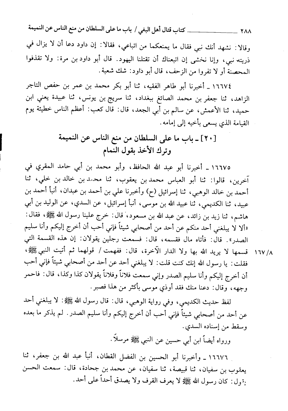 16675 - أَخْبَرَنَا أَبُو عَبْدِ اللهِ الْحَافِظُ، وَأَبُو مُحَمَّدِ بْنُ أَبِي حَامِدٍ الْمُقْرِيُّ، فِي آخَرِينَ، قَالُوا: ثَنَا أَبُو الْعَبَّاسِ مُحَمَّدُ بْنُ يَعْقُوبَ، ثَنَا مُحَمَّدُ بْنُ خَالِدِ بْنِ خُلَيٍّ، ثَنَا أَحْمَدُ بْنُ خَالِدٍ الْوَهْبِيُّ، ثَنَا إِسْرَائِيلُ، ح وَأَخْبَرَنَا عَلِيُّ بْنُ أَحْمَدَ بْنِ عَبْدَانَ، أَنْبَأَ أَحْمَدُ بْنُ عُبَيْدٍ، ثَنَا الْكُدَيْمِيُّ، ثَنَا عُبَيْدُ اللهِ بْنُ مُوسَى، أَنْبَأَ إِسْرَائِيلُ، عَنِ السُّدِّيِّ، عَنِ الْوَلِيدِ بْنِ أَبِي هَاشِمٍ، ثَنَا زَيْدُ بْنُ زَائِدٍ، عَنْ عَبْدِ اللهِ بْنِ مَسْعُودٍ، قَالَ: خَرَجَ عَلَيْنَا رَسُولُ اللهِ صَلَّى اللهُ عَلَيْهِ وَسَلَّمَ فَقَالَ: " أَلَا §لَا يُبَلِّغُنِي أَحَدٌ مِنْكُمْ عَنْ أَحَدٍ مِنْ أَصْحَابِي شَيْئًا , فَإِنِّي أُحِبُّ أَنْ أَخْرُجَ إِلَيْكُمْ وَأَنَا سَلِيمُ الصَّدْرِ "، قَالَ: فَأَتَاهُ مَالٌ فَقَسَمَهُ، قَالَ: فَسَمِعْتُ رَجُلَيْنِ يَقُولَانِ: إِنَّ هَذِهِ الْقِسْمَةَ الَّتِي قَسَمَهَا لَا يُرِيدُ اللهَ بِهَا وَلَا الدَّارَ الْآخِرَةَ، قَالَ: فَفَهِمْتُ قَوْلَهُمَا ثُمَّ أَتَيْتُ النَّبِيَّ صَلَّى اللهُ عَلَيْهِ وَسَلَّمَ فَقُلْتُ: يَا رَسُولَ اللهِ إِنَّكَ كُنْتَ قُلْتَ: " لَا يُبَلِّغُنِي أَحَدٌ عَنْ أَحَدٍ مِنْ أَصْحَابِي شَيْئًا , فَإِنِّي أُحِبُّ أَنْ أَخْرُجَ إِلَيْكُمْ وَأَنَا سَلِيمُ الصَّدْرِ " , وَإِنِّي سَمِعْتُ فُلَانًا وَفُلَانًا يَقُولَانِ كَذَا وَكَذَا، قَالَ: فَاحْمَرَّ وَجْهُهُ وَقَالَ: " دَعْنَا مِنْكَ , فَقَدْ أُوذِيَ مُوسَى بِأَكْثَرَ مِنْ هَذَا فَصَبَرَ ". لَفْظُ حَدِيثِ الْكُدَيْمِيِّ , وَفِي رِوَايَةِ الْوَهْبِيِّ، قَالَ: قَالَ رَسُولُ اللهِ صَلَّى اللهُ عَلَيْهِ وَسَلَّمَ: " لَا يُبَلِّغُنِي أَحَدٌ عَنْ أَحَدٍ مِنْ أَصْحَابِي شَيْئًا , فَإِنِّي أُحِبُّ أَنْ أَخْرُجَ إِلَيْكُمْ وَأَنَا سَلِيمُ الصَّدْرِ " لَمْ يَذْكُرْ مَا بَعْدَهُ , وَسَقَطَ مِنْ إِسْنَادِهِ السُّدِّيُّ وَرَوَاهُ أَيْضًا ابْنُ أَبِي حُسَيْنٍ عَنِ النَّبِيِّ صَلَّى اللهُ عَلَيْهِ وَسَلَّمَ مُرْسَلًا