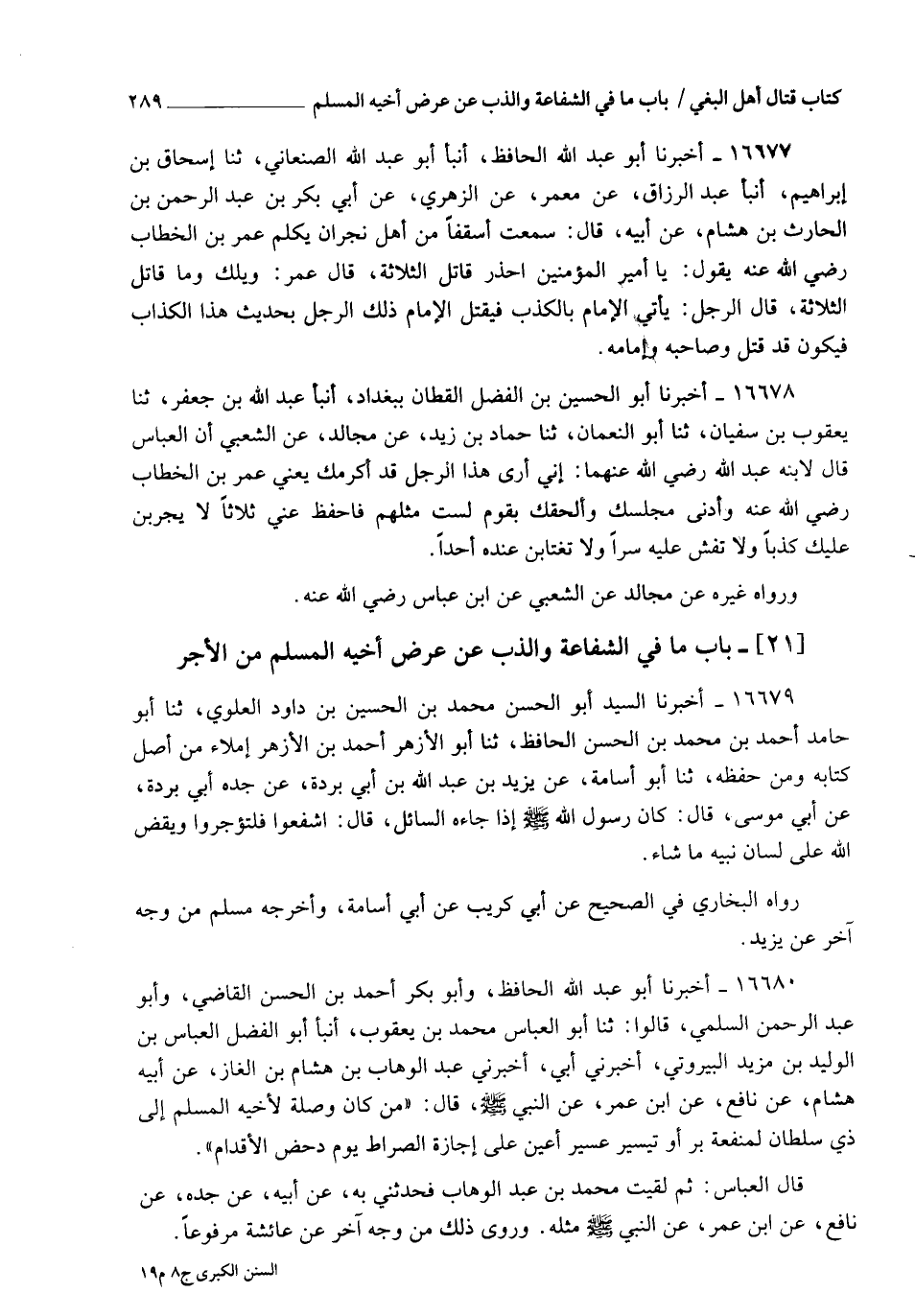16680 - أَخْبَرَنَا أَبُو عَبْدِ اللهِ الْحَافِظُ، وَأَبُو بَكْرٍ أَحْمَدُ بْنُ الْحَسَنِ الْقَاضِي , وَأَبُو عَبْدِ الرَّحْمَنِ السُّلَمِيُّ، قَالُوا: ثَنَا أَبُو الْعَبَّاسِ مُحَمَّدُ بْنُ يَعْقُوبَ , أَنْبَأَ أَبُو الْفَضْلِ الْعَبَّاسُ بْنُ الْوَلِيدِ بْنِ مَزِيدٍ الْبَيْرُوتِيُّ، أَخْبَرَنِي أَبِي، أَخْبَرَنِي عَبْدُ الْوَهَّابِ بْنُ هِشَامِ بْنِ الْغَازِ، عَنْ أَبِيهِ هِشَامٍ، عَنْ نَافِعٍ، عَنِ ابْنِ عُمَرَ، عَنِ النَّبِيِّ صَلَّى اللهُ عَلَيْهِ وَسَلَّمَ قَالَ: §" مَنْ كَانَ وَصِلَةً لِأَخِيهِ الْمُسْلِمِ إِلَى ذِي سُلْطَانٍ لِمَنْفَعَةِ بِرٍّ , أَوْ تَيْسِيرِ عَسِيرٍ , أُعِينَ عَلَى إِجَازَةِ الصِّرَاطِ يَوْمَ دَحْضِ الْأَقْدَامِ " , قَالَ الْعَبَّاسُ: ثُمَّ لَقِيتُ مُحَمَّدَ بْنَ عَبْدِ الْوَهَّابِ فَحَدَّثَنِي بِهِ، عَنْ أَبِيهِ، عَنْ جَدِّهِ، عَنْ نَافِعٍ، عَنِ ابْنِ عُمَرَ، عَنِ النَّبِيِّ صَلَّى اللهُ عَلَيْهِ وَسَلَّمَ , مِثْلَهُ. وَرَوَى ذَلِكَ مِنْ وَجْهٍ آخَرَ عَنْ عَائِشَةَ مَرْفُوعًا