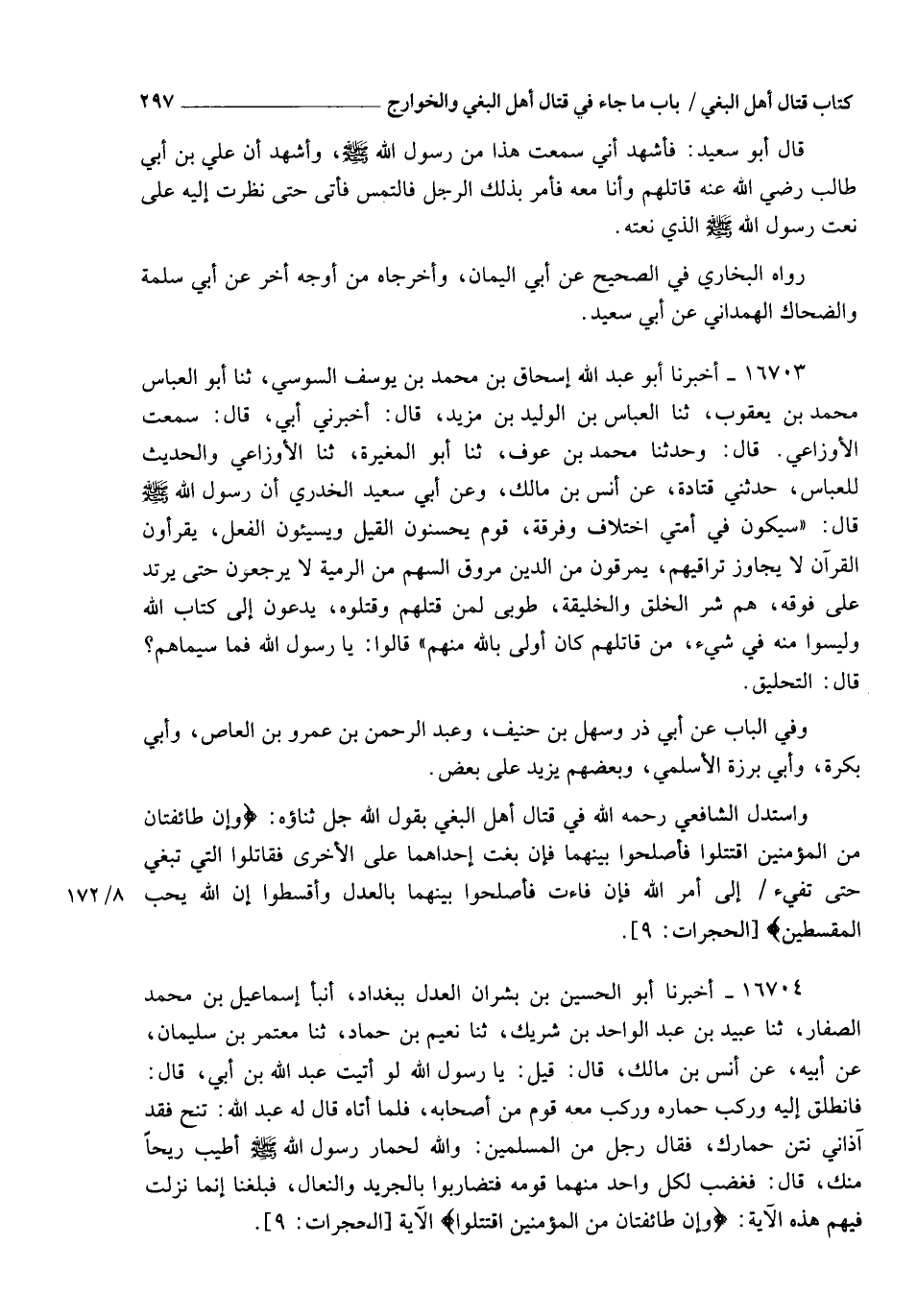 16703 - أَخْبَرَنَا أَبُو عَبْدِ اللهِ إِسْحَاقُ بْنُ مُحَمَّدِ بْنِ يُوسُفَ السُّوسِيُّ , ثَنَا أَبُو الْعَبَّاسِ مُحَمَّدُ بْنُ يَعْقُوبَ , ثَنَا الْعَبَّاسُ بْنُ الْوَلِيدِ بْنِ مَزِيدٍ، قَالَ: أَخْبَرَنِي أَبِي قَالَ،: سَمِعْتُ الْأَوْزَاعِيَّ، قَالَ: وَحَدَّثَنَا مُحَمَّدُ بْنُ عَوْفٍ، ثَنَا أَبُو الْمُغِيرَةِ، ثَنَا الْأَوْزَاعِيُّ، وَالْحَدِيثُ لِلْعَبَّاسِ، حَدَّثَنِي قَتَادَةُ، عَنْ أَنَسِ بْنِ مَالِكٍ، وَعَنْ أَبِي سَعِيدٍ الْخُدْرِيِّ، أَنَّ رَسُولَ اللهِ صَلَّى اللهُ عَلَيْهِ وَسَلَّمَ قَالَ: §" سَيَكُونُ فِي أُمَّتِي اخْتِلَافٌ وَفُرْقَةٌ , قَوْمٌ يُحْسِنُونَ الْقِيلَ , وَيُسِيئُونَ الْفِعْلَ , يَقْرَءُونَ الْقُرْآنَ لَا يُجَاوِزُ تَرَاقِيَهُمْ , يَمْرُقُونَ مِنَ الدِّينِ مُرُوقَ السَّهْمِ مِنَ الرَّمِيَّةِ , لَا يَرْجِعُونَ حَتَّى يَرْتَدَّ عَلَى فَوْقِهِ , هُمْ شَرُّ الْخَلْقِ وَالْخَلِيقَةِ , طُوبَى لِمَنْ قَتَلَهُمْ وَقَتَلُوهُ , يَدْعُونَ إِلَى كِتَابِ اللهِ وَلَيْسُوا مِنْهُ فِي شَيْءٍ , مَنْ قَاتَلَهُمْ كَانَ أَوْلَى بِاللهِ مِنْهُمْ "، قَالُوا: يَا رَسُولَ اللهِ فَمَا سِيمَاهُمْ؟ قَالَ: " التَّحْلِيقُ ". وَفِي الْبَابِ عَنْ أَبِي ذَرٍّ , وَسَهْلِ بْنِ حُنَيْفٍ , وَعَبْدِ الله بْنِ عَمْرِو بْنِ الْعَاصِ , وَأَبِي بَكْرَةٍ , وَأَبِي بَرْزَةَ الْأَسْلَمِيِّ , وَبَعْضُهُمْ يَزِيدُ عَلَى بَعْضٍ وَاسْتَدَلَّ الشَّافِعِيُّ رَحِمَهُ اللهُ فِي قِتَالِ أَهْلِ الْبَغِيِّ بِقَوْلِ اللهِ جَلَّ ثَنَاؤُهُ: {وَإِنْ طَائِفَتَانِ مِنَ الْمُؤْمِنِينَ اقْتَتَلُوا فَأَصْلِحُوا بَيْنَهُمَا , فَإِنْ بَغَتْ إِحْدَاهُمَا عَلَى الْأُخْرَى فَقَاتِلُوا الَّتِي تَبْغِي حَتَّى تَفِيءَ إِلَى أَمْرِ اللهِ , فَإِنْ فَاءَتْ فَأَصْلِحُوا بَيْنَهُمَا بِالْعَدْلِ , وَأَقْسِطُوا , إِنَّ اللهَ يُحِبُّ الْمُقْسِطِينَ} [الحجرات: 9]