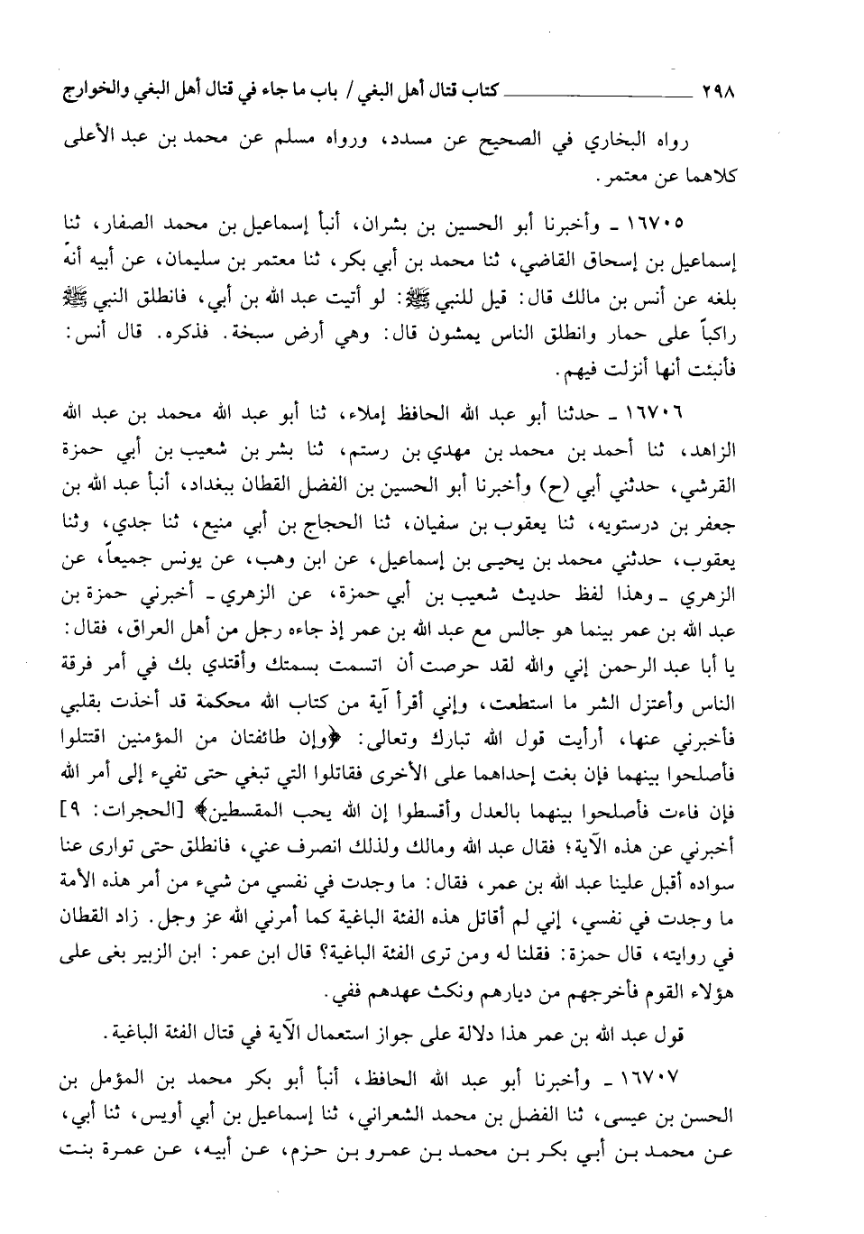 16706 - حَدَّثَنَا أَبُو عَبْدِ اللهِ الْحَافِظُ، إِمْلَاءً , ثَنَا أَبُو عَبْدِ اللهِ مُحَمَّدُ بْنُ عَبْدِ اللهِ الزَّاهِدُ , ثَنَا أَحْمَدُ بْنُ مُحَمَّدِ بْنِ مَهْدِيِّ بْنِ رُسْتُمَ، ثَنَا بِشْرُ بْنُ شُعَيْبِ بْنِ أَبِي حَمْزَةَ الْقُرَشِيُّ، حَدَّثَنِي أَبِي ح، وَأَخْبَرَنَا أَبُو الْحُسَيْنِ بْنُ الْفَضْلِ الْقَطَّانُ، بِبَغْدَادَ , أَنْبَأَ عَبْدُ اللهِ بْنُ جَعْفَرِ بْنِ دَرَسْتَوَيْهِ، ثَنَا يَعْقُوبُ بْنُ سُفْيَانَ، ثَنَا الْحَجَّاجُ بْنُ أَبِي مَنِيعٍ، ثَنَا جَدِّي، وَثَنَا يَعْقُوبُ، حَدَّثَنِي مُحَمَّدُ بْنُ يَحْيَى بْنِ إِسْمَاعِيلَ، عَنِ ابْنِ وَهْبٍ، عَنْ يُونُسَ، , جَمِيعًا عَنِ الزُّهْرِيِّ، وَهَذَا لَفْظُ حَدِيثِ شُعَيْبِ بْنِ أَبِي حَمْزَةَ , عَنِ الزُّهْرِيِّ، أَخْبَرَنِي حَمْزَةُ بْنُ عَبْدِ اللهِ بْنِ عُمَرَ،: أَنَّهُ بَيْنَمَا هُوَ جَالِسٌ مَعَ عَبْدِ اللهِ بْنِ عُمَرَ إِذْ جَاءَهُ رَجُلٌ مِنْ أَهْلِ الْعِرَاقِ، فَقَالَ: يَا أَبَا عَبْدِ الرَّحْمَنِ إِنِّي وَاللهِ لَقَدْ حَرَصْتُ أَنِ اتَّسَمْتُ بِسَمْتِكَ , وَأَقْتَدِي بِكَ فِي أَمْرِ فُرْقَةِ النَّاسِ , وَأَعْتَزِلَ الشَّرَّ مَا اسْتَطَعْتُ , وَإِنِّي أَقْرَأُ آيَةً مِنْ كِتَابِ اللهِ مُحْكَمَةً قَدْ أَخَذَتْ بِقَلْبِي , فَأَخْبِرْنِي عَنْهَا , أَرَأَيْتَ قَوْلَ اللهِ تَبَارَكَ وَتَعَالَى: " {§وَإِنْ طَائِفَتَانِ مِنَ الْمُؤْمِنِينَ اقْتَتَلُوا فَأَصْلِحُوا بَيْنَهُمَا , فَإِنْ بَغَتْ إِحْدَاهُمَا عَلَى الْأُخْرَى فَقَاتِلُوا الَّتِي تَبْغِي حَتَّى تَفِيءَ إِلَى أَمْرِ اللهِ , فَإِنْ فَاءَتْ فَأَصْلِحُوا بَيْنَهُمَا بِالْعَدْلِ , وَأَقْسِطُوا إِنَّ اللهَ يُحِبُّ الْمُقْسِطِينَ} [الحجرات: 9] أَخْبِرْنِي عَنْ هَذِهِ الْآيَةِ، فَقَالَ عَبْدُ اللهِ: وَمَالَكَ وَلِذَلِكَ , انْصَرِفْ عَنِّي , فَانْطَلَقَ حَتَّى تَوَارَى عَنَّا سَوَادُهُ , أَقْبَلَ عَلَيْنَا عَبْدُ اللهِ بْنُ عُمَرَ فَقَالَ: مَا وَجِدْتُ فِي نَفْسِي مِنْ شَيْءٍ مِنْ أَمْرِ هَذِهِ الْأُمَّةِ مَا وَجِدْتُ فِي نَفْسِي أَنِّي لَمْ أُقَاتِلْ هَذِهِ الْفِئَةَ الْبَاغِيَةَ كَمَا أَمَرَنِي اللهُ عَزَّ وَجَلَّ. زَادَ الْقَطَّانُ فِي رِوَايَتِهِ: قَالَ حَمْزَةُ: فَقُلْنَا لَهُ: وَمَنْ تَرَى الْفِئَةَ الْبَاغِيَةَ؟ قَالَ ابْنُ عُمَرَ: ابْنُ الزُّبَيْرِ بَغَى عَلَى هَؤُلَاءِ الْقَوْمِ , فَأَخْرَجَهُمْ مِنْ دِيَارِهِمْ , وَنَكَثَ عَهْدَهُمْ. فَفِي قَوْلِ عَبْدِ اللهِ بْنِ عُمَرَ هَذَا دَلَالَةٌ عَلَى جَوَازِ اسْتِعْمَالِ الْآيَةِ فِي قِتَالِ الْفِئَةِ الْبَاغِيَةِ