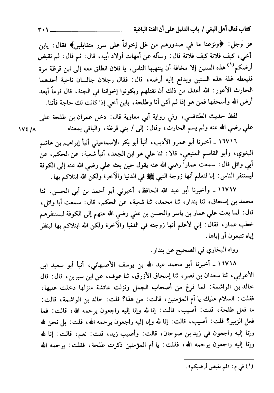 16718 - أَخْبَرَنَا أَبُو مُحَمَّدٍ عَبْدُ اللهِ بْنُ يُوسُفَ الْأَصْبَهَانِيُّ، أَنْبَأَ أَبُو سَعِيدِ بْنُ الْأَعْرَابِيُّ، ثَنَا سَعْدَانُ بْنُ نَصْرٍ، ثَنَا إِسْحَاقُ الْأَزْرَقُ، ثَنَا عَوْفٌ، عَنِ ابْنِ سِيرِينَ، قَالَ: قَالَ خَالِدُ بْنُ الْوَاشِمَةِ: لَمَّا فَرَغَ مِنْ أَصْحَابِ الْجَمَلِ وَنَزَلَتْ عَائِشَةُ مَنْزِلَهَا , دَخَلْتُ عَلَيْهَا فَقُلْتُ: السَّلَامُ عَلَيْكِ يَا أُمَّ الْمُؤْمِنِينَ، قَالَتْ: مَنْ هَذَا؟ قُلْتُ: خَالِدُ بْنُ الْوَاشِمَةِ، قَالَتْ: مَا فَعَلَ طَلْحَةُ؟ قُلْتُ: أُصِيبَ، قَالَتْ: إِنَّا لِلَّهِ وَإِنَّا إِلَيْهِ رَاجِعُونَ , يَرْحَمُهُ اللهُ , قَالَتْ: فَمَا فَعَلَ الزُّبَيْرُ؟ قُلْتُ: أُصِيبَ، قَالَتْ: إِنَّا لِلَّهِ وَإِنَّا إِلَيْهِ رَاجِعُونَ , يَرْحَمُهُ اللهُ , قُلْتُ: بَلْ نَحْنُ لِلَّهِ وَإِنَّا إِلَيْهِ رَاجِعُونَ فِي زَيْدِ بْنِ صُوحَانَ، قَالَتْ: وَأُصِيبَ زَيْدٌ؟ قُلْتُ: نَعَمْ، قَالَتْ: إِنَّا لِلَّهِ وَإِنَّا إِلَيْهِ رَاجِعُونَ , يَرْحَمُهُ اللهُ , فَقُلْتُ: يَا أُمَّ الْمُؤْمِنِينَ ذَكَرْتُ طَلْحَةَ فَقُلْتِ: يَرْحَمُهُ اللهُ , -[302]- وَذَكَرْتُ الزُّبَيْرَ فَقُلْتِ: يَرْحَمُهُ اللهُ , وَذَكَرْتُ زَيْدًا فَقُلْتِ: يَرْحَمُهُ اللهُ , وَقَدْ §قَتَلَ بَعْضُهُمْ بَعْضًا , وَاللهِ لَا يَجْمَعُهُمُ اللهُ فِي جَنَّةٍ أَبَدًا، قَالَتْ: أَوَ لَا تَدْرِي أَنَّ رَحْمَةَ اللهِ وَاسِعَةٌ , وَهُوَ عَلَى كُلِّ شَيْءٍ قَدِْيرٌ، قَالَ: فَكَانَتْ أَفْضَلَ مِنِّي،
