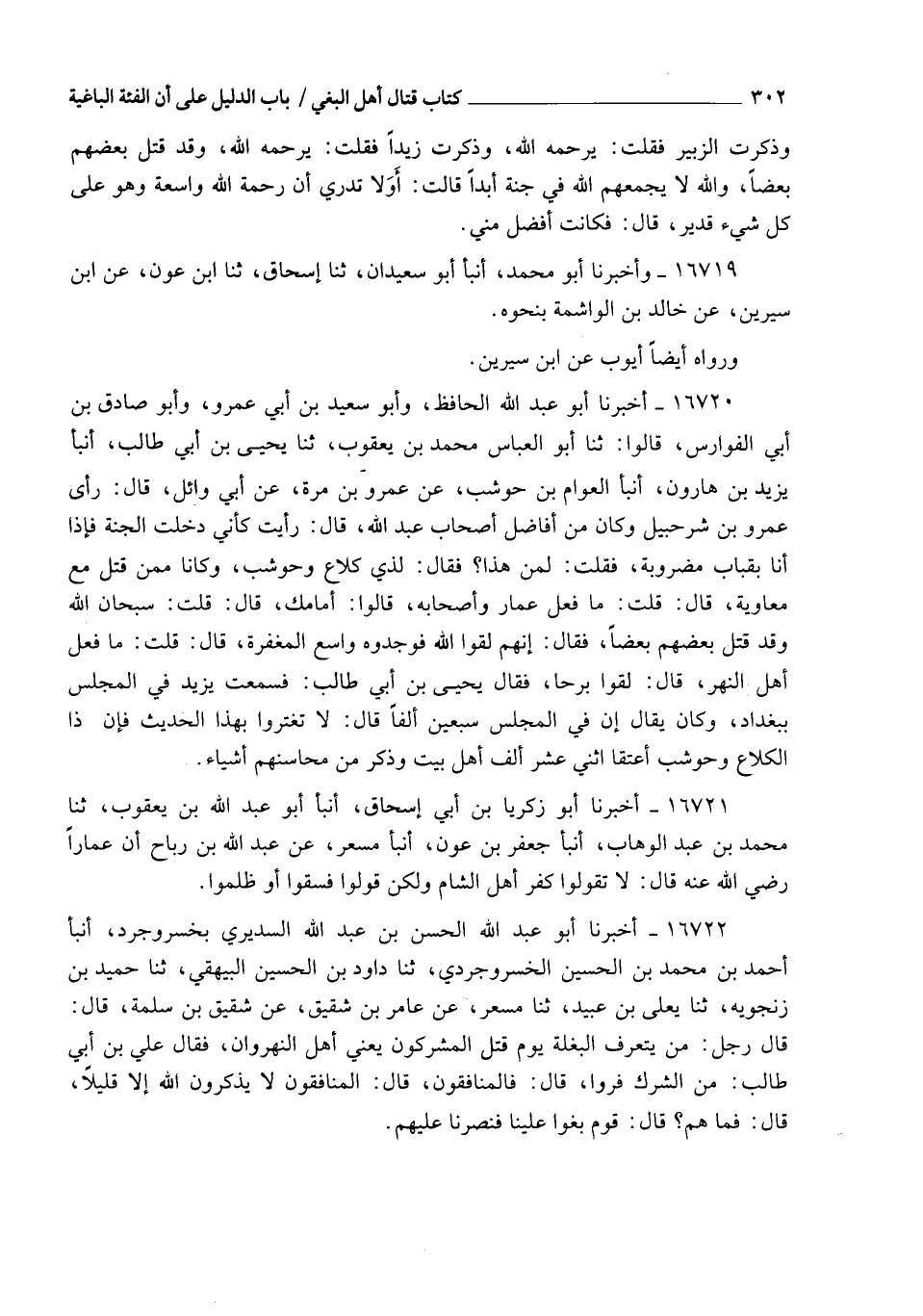 16722 - أَخْبَرَنَا أَبُو عَبْدِ اللهِ الْحَسَنُ بْنُ عَبْدِ اللهِ السَّدِيرِيُّ، بخُسْرَوْجِرْدَ , أَنْبَأَ أَحْمَدُ بْنُ مُحَمَّدِ بْنِ الْحُسَيْنِ الْخُسْرَوْجِرْدِيُّ، ثَنَا دَاوُدُ بْنُ الْحُسَيْنِ الْبَيْهَقِيُّ، ثَنَا حُمَيْدُ بْنُ زَنْجُوَيْهِ، ثَنَا يَعْلَى بْنُ عُبَيْدٍ، ثَنَا مِسْعَرٌ، عَنْ عَامِرِ بْنِ شَقِيقٍ، عَنْ شَقِيقِ بْنِ سَلَمَةَ، قَالَ: قَالَ رَجُلٌ: مَنْ يَتَعَرَّفُ الْبُغَاةَ يَوْمَ قُتِلَ الْمُشْرِكُونَ؟ يَعْنِي أَهْلَ النَّهْرَوَانِ، فَقَالَ عَلِيُّ بْنُ أَبِي طَالِبٍ: " §مِنَ الشِّرْكِ فَرُّوا، قَالَ: فَالْمُنَافِقُونَ؟ قَالَ: الْمُنَافِقُونَ لَا يَذْكُرُونَ اللهَ إِلَّا قَلِيلًا، قَالَ: فَمَا هُمْ؟ قَالَ: قَوْمٌ بَغَوْا عَلَيْنَا فَنُصِرْنَا عَلَيْهِمْ