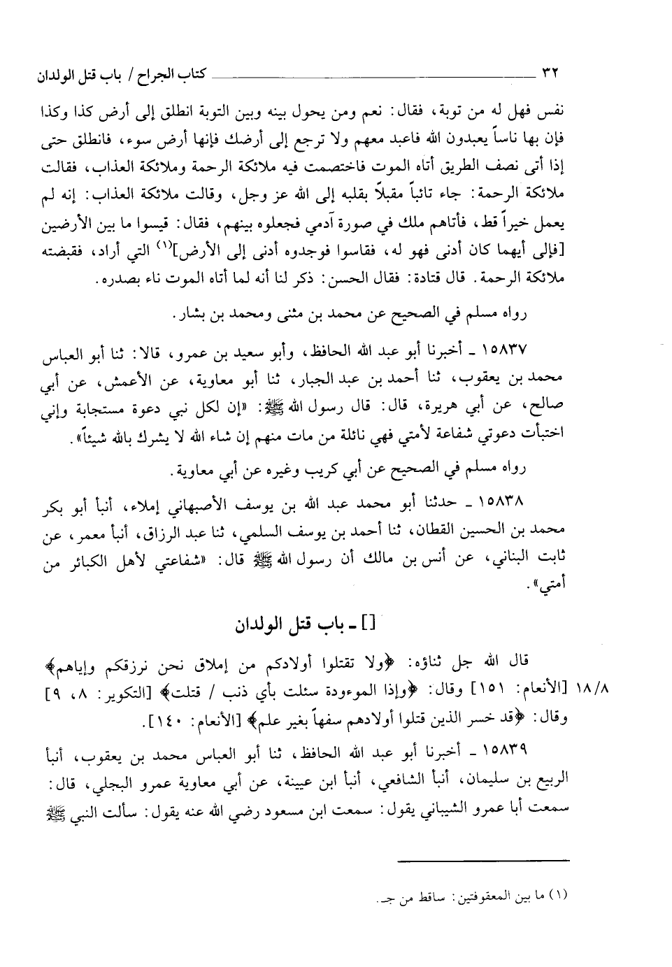 15839 - أَخْبَرَنَا أَبُو عَبْدِ اللهِ الْحَافِظُ، ثنا أَبُو الْعَبَّاسِ مُحَمَّدُ بْنُ يَعْقُوبَ، أنبأ الرَّبِيعُ بْنُ سُلَيْمَانَ، أنبأ الشَّافِعِيُّ، أنبأ ابْنُ عُيَيْنَةَ، عَنْ أَبِي مُعَاوِيَةَ عَمْرٍو الْبَجَلِيِّ، قَالَ: سَمِعْتُ أَبَا عَمْرٍو الشَّيْبَانِيَّ، يَقُولُ: سَمِعْتُ ابْنَ مَسْعُودٍ، رَضِيَ اللهُ عَنْهُ يَقُولُ: سَأَلْتُ النَّبِيَّ صَلَّى اللهُ عَلَيْهِ وَسَلَّمَ -[33]- قُلْتُ: أِيُّ الْكَبَائِرِ أَكْبَرُ؟ قَالَ: " §أَنْ تَجْعَلَ لِلَّهِ نِدًّا وَهُوَ خَلَقَكَ ". قُلْتُ: ثُمَّ أَيٌّ؟ قَالَ: " أَنْ تُقْتَلَ وَلَدِكَ مِنْ أَجْلِ أَنْ يَأْكُلَ مَعَكَ "