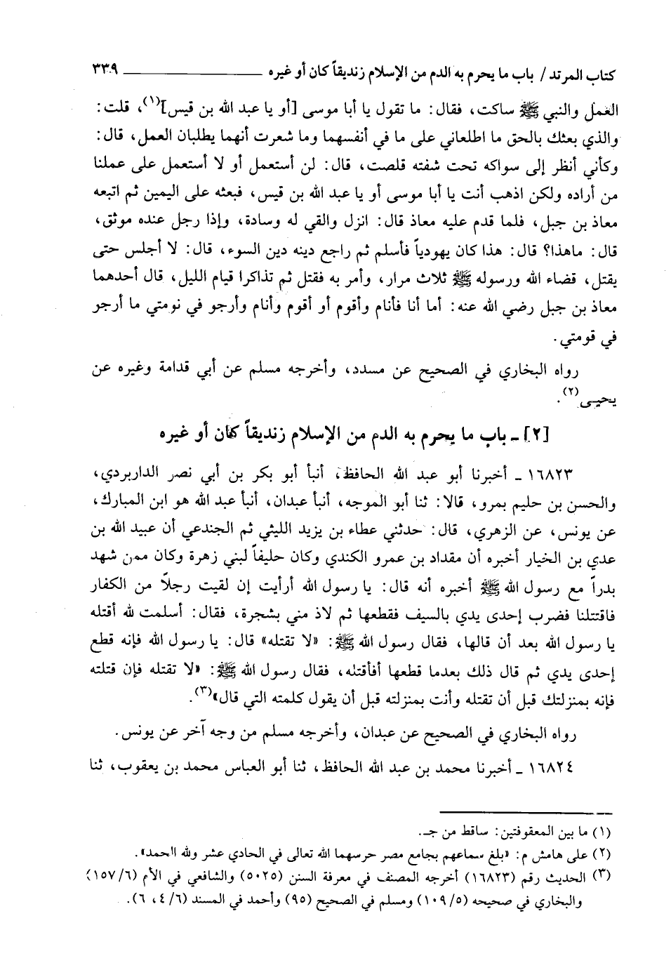 16823 - أَخْبَرَنَا أَبُو عَبْدِ اللهِ الْحَافِظُ، أنبأ أَبُو بَكْرِ بْنُ أَبِي نَصْرٍ الدَّارَبَرْدِيُّ، وَالْحَسَنُ بْنُ حَلِيمٍ بِمَرْوَ، قَالَا: ثنا أَبُو الْمُوَجِّهِ، أنبأ عَبْدَانُ، أنبأ عَبْدُ اللهِ هُوَ ابْنُ الْمُبَارَكِ، عَنْ يُونُسَ، عَنِ الزُّهْرِيِّ، قَالَ: حَدَّثَنِي عَطَاءُ بْنُ يَزِيدَ اللَّيْثِيُّ، ثُمَّ الْجُنْدَعِيُّ، أَنَّ عُبَيْدَ اللهِ بْنَ عَدِيِّ بْنِ الْخِيَارِ أَخْبَرَهُ، أَنَّ مِقْدَادَ بْنَ عَمْرٍو الْكِنْدِيَّ، وَكَانَ حَلِيفًا لِبَنِي زُهْرَةَ وَكَانَ مِمَّنْ شَهِدَ بَدْرًا مَعَ رَسُولِ اللهِ صَلَّى اللهُ عَلَيْهِ وَسَلَّمَ، أَخْبَرَهُ أَنَّهُ قَالَ: يَا رَسُولَ اللهِ أَرَأَيْتَ إِنْ لَقِيتُ رَجُلًا مِنَ الْكُفَّارِ فَاقْتَتَلْنَا فَضَرَبَ إِحْدَى يَدِيَّ بِالسَّيْفِ فَقَطَعَهَا ثُمَّ لَاذَ مِنِّي بِشَجَرَةٍ فَقَالَ: أَسْلَمْتُ لِلَّهِ، أَقْتُلُهُ يَا رَسُولَ اللهِ بَعْدَ أَنْ قَالَهَا؟ فَقَالَ رَسُولُ اللهِ صَلَّى اللهُ عَلَيْهِ وَسَلَّمَ: " لَا تَقْتُلْهُ " قَالَ: يَا رَسُولَ اللهِ فَإِنَّهُ قَطَعَ إِحْدَى يَدِيَّ ثُمَّ قَالَ ذَلِكَ بَعْدَمَا قَطَعَهَا أَفَأَقْتُلُهُ؟ فَقَالَ رَسُولُ اللهِ صَلَّى اللهُ عَلَيْهِ وَسَلَّمَ: " §لَا تَقْتُلْهُ فَإِنْ قَتَلْتَهُ فَإِنَّهُ بِمَنْزِلَتِكَ قَبْلَ أَنْ تَقْتُلَهُ، وَأَنْتَ بِمَنْزِلَتِهِ قَبْلَ أَنْ يَقُولَ كَلِمَتَهُ الَّتِي قَالَ " رَوَاهُ الْبُخَارِيُّ فِي الصَّحِيحِ عَنْ عَبْدَانَ، وَأَخْرَجَهُ مُسْلِمٌ مِنْ وَجْهٍ آخَرَ عَنْ يُونُسَ