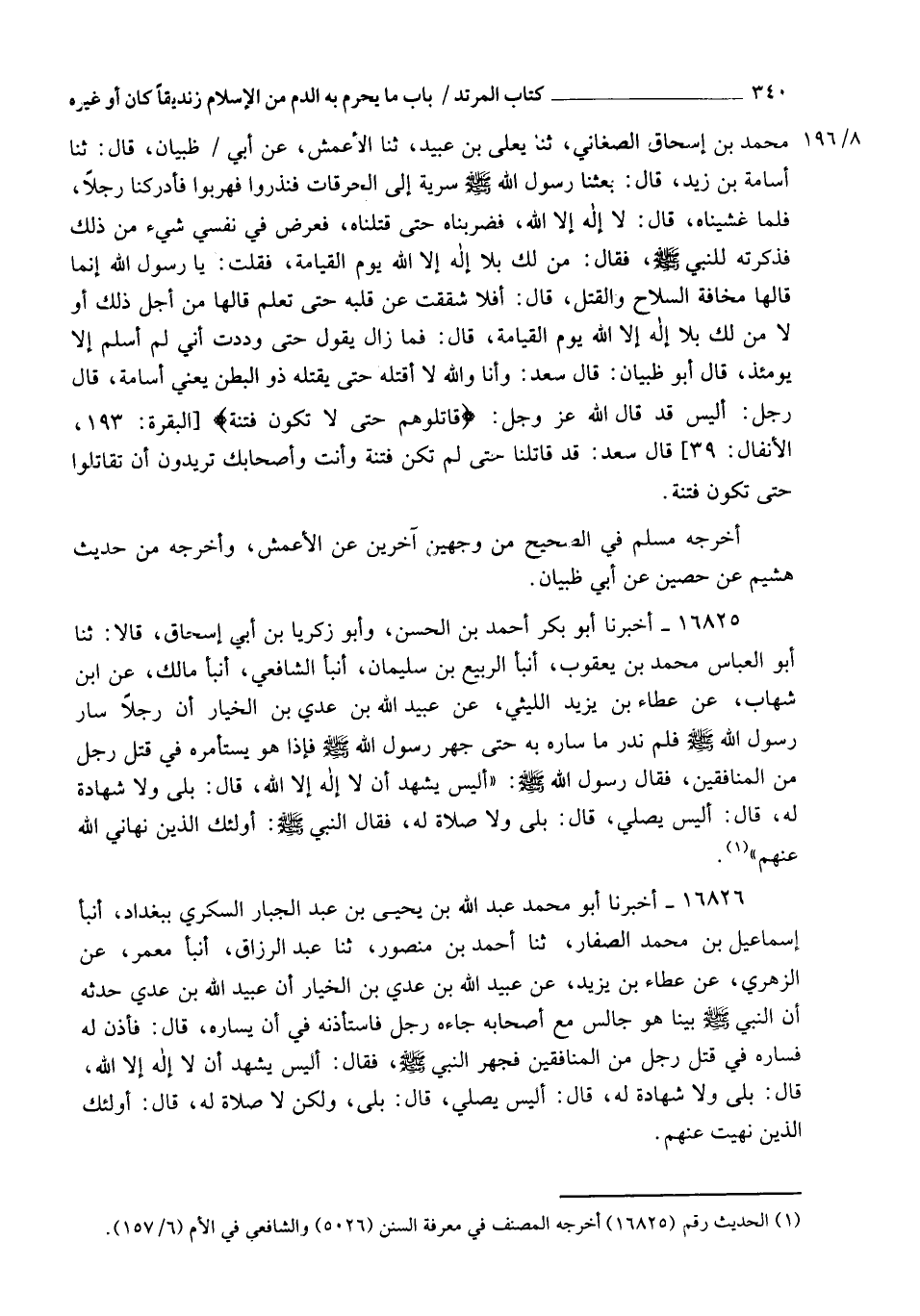 16826 - أَخْبَرَنَا أَبُو مُحَمَّدٍ عَبْدُ اللهِ بْنُ يَحْيَى بْنِ عَبْدِ الْجَبَّارِ السُّكَّرِيُّ، بِبَغْدَادَ، أنبأ إِسْمَاعِيلُ بْنُ مُحَمَّدٍ الصَّفَّارُ، ثنا أَحْمَدُ بْنُ مَنْصُورٍ، " ثنا عَبْدُ الرَّزَّاقِ، أنبأ مَعْمَرٌ، عَنِ الزُّهْرِيِّ، عَنْ عَطَاءِ بْنِ يَزِيدَ، عَنْ عُبَيْدِ اللهِ بْنِ عَدِيِّ بْنِ الْخِيَارِ، أَنَّ عُبَيْدَ اللهِ بْنَ عَدِيٍّ، حَدَّثَهُ، أَنَّ النَّبِيَّ صَلَّى اللهُ عَلَيْهِ وَسَلَّمَ بَيْنَا هُوَ جَالِسٌ مَعَ أَصْحَابُهُ، جَاءَهُ رَجُلٌ فَاسْتَأْذَنَهُ فِي أَنْ يُسَارَّهُ، قَالَ: فَأَذِنَ لَهُ فَسَارَّهُ فِي قَتْلِ رَجُلٍ مِنَ الْمُنَافِقِينَ، فَجَهَرَ النَّبِيُّ صَلَّى اللهُ عَلَيْهِ وَسَلَّمَ فَقَالَ: §" أَلَيْسَ يَشْهَدُ أَنْ لَا إِلَهَ إِلَّا اللهُ؟ " قَالَ: بَلَى، وَلَا شَهَادَةَ لَهُ قَالَ: " أَلَيْسَ يُصَلِّي؟ " قَالَ: بَلَى، وَلَكِنْ لَا صَلَاةَ لَهُ، قَالَ: " أُولَئِكَ الَّذِينَ نُهِيتُ عَنْهُمْ " -[341]- قَالَ الشَّافِعِيُّ: فَأَخْبَرَ رَسُولُ اللهِ صَلَّى اللهُ عَلَيْهِ وَسَلَّمَ الْمُسْتَأْذِنَ فِي قَتْلِ الْمُنَافِقِ إِذْ أَظْهَرَ الْإِسْلَامَ أَنَّ اللهَ نَهَاهُ عَنْ قَتْلِهِ قَالَ الشَّيْخُ رَحِمَهُ اللهُ: وَرُوِّينَا فِي الْحَدِيثِ الثَّابِتِ عَنْ أَبِي سَعِيدٍ الْخُدْرِيِّ فِي قِصَّةِ الرَّجُلِ الَّذِي قَالَ لِرَسُولِ اللهِ صَلَّى اللهُ عَلَيْهِ وَسَلَّمَ: اتَّقِ اللهَ فِي الْقِسْمَةِ الَّتِي قَسَمَهَا، وَاسْتِئْذَانِ خَالِدِ بْنِ الْوَلِيدِ فِي قَتْلِهِ، وَقَوْلِ النَّبِيِّ صَلَّى اللهُ عَلَيْهِ وَسَلَّمَ: لَا، لَعَلَّهُ يَكُونُ يُصَلِّي "، قَالَ خَالِدٌ: وَكَمْ مِنْ مُصَلٍّ يَقُولُ بِلِسَانِهِ مَا لَيْسَ فِي قَلْبِهِ، فَقَالَ رَسُولُ اللهِ صَلَّى اللهُ عَلَيْهِ وَسَلَّمَ: إِنِّي لَمْ أُؤْمَرْ أَنْ أُنَقِّبَ عَنْ قُلُوبِ النَّاسِ، وَلَا أَشُقَّ بُطُونَهُمْ