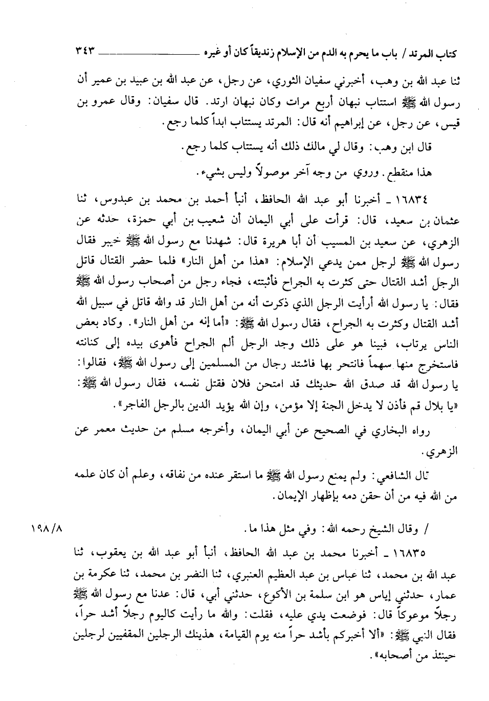 16834 - أَخْبَرَنَا أَبُو عَبْدِ اللهِ الْحَافِظُ، أنبأ أَحْمَدُ بْنُ مُحَمَّدِ بْنِ عُبْدُوسٍ، ثنا عُثْمَانُ بْنُ سَعِيدٍ، قَالَ: قَرَأْتُ عَلَى أَبِي الْيَمَانِ أَنَّ شُعَيْبَ بْنَ أَبِي حَمْزَةَ، حَدَّثَهُ، عَنِ الزُّهْرِيِّ، عَنْ سَعِيدِ بْنِ الْمُسَيِّبِ، أَنَّ أَبَا هُرَيْرَةَ، قَالَ: شَهِدْنَا مَعَ رَسُولِ اللهِ صَلَّى اللهُ عَلَيْهِ وَسَلَّمَ خَيْبَرَ، فَقَالَ رَسُولُ اللهِ صَلَّى اللهُ عَلَيْهِ وَسَلَّمَ لِرَجُلٍ مِمَّنْ يَدَّعِي الْإِسْلَامَ: §" هَذَا مِنْ أَهْلِ النَّارِ " فَلَمَّا حَضَرَ الْقِتَالُ قَاتَلَ الرَّجُلُ أَشَدَّ الْقِتَالِ، حَتَّى كَثُرَتْ بِهِ الْجِرَاحُ فَأَثْبَتَتْهُ، فَجَاءَ رَجُلٌ مِنْ أَصْحَابِ رَسُولِ اللهِ صَلَّى اللهُ عَلَيْهِ وَسَلَّمَ فَقَالَ: يَا رَسُولَ اللهِ أَرَأَيْتَ الرَّجُلَ الَّذِي ذَكَرْتَ أَنَّهُ مِنْ أَهْلِ النَّارِ، قَدْ وَاللهِ قَاتَلَ فِي سَبِيلِ اللهِ أَشَدَّ الْقِتَالِ، وَكَثُرَتْ بِهِ الْجِرَاحُ؟ فَقَالَ رَسُولُ اللهِ صَلَّى اللهُ عَلَيْهِ وَسَلَّمَ: " أَمَا إِنَّهُ مِنْ أَهْلِ النَّارِ " وَكَادَ بَعْضُ النَّاسِ يَرْتَابُ، فَبَيْنَا هُوَ عَلَى ذَلِكَ وَجَدَ الرَّجُلُ أَلَمَ الْجِرَاحِ فَأَهْوَى بِيَدِهِ إِلَى كِنَانَتِهِ، فَاسْتَخْرَجَ مِنْهَا سَهْمًا فَانْتَحَرَ بِهَا، فَاشْتَدَّ رِجَالٌ مِنَ الْمُسْلِمِينَ إِلَى رَسُولِ اللهِ صَلَّى اللهُ عَلَيْهِ وَسَلَّمَ فَقَالُوا: يَا رَسُولَ اللهِ قَدْ صَدَّقَ اللهُ حَدِيثَكَ، قَدِ امْتُحِنَ فُلَانٌ فَقَتَلَ نَفْسَهُ، فَقَالَ رَسُولُ اللهِ صَلَّى اللهُ عَلَيْهِ وَسَلَّمَ: " يَا بِلَالُ قُمْ فَأَذِّنْ: لَا يَدْخُلُ الْجَنَّةَ إِلَّا مُؤْمِنٌ، وَإِنَّ اللهَ يُؤَيِّدُ الدِّينَ بِالرَّجُلِ الْفَاجِرِ " رَوَاهُ الْبُخَارِيُّ فِي الصَّحِيحِ عَنْ أَبِي الْيَمَانِ، وَأَخْرَجَهُ مُسْلِمٌ مِنْ حَدِيثِ مَعْمَرٍ، عَنِ الزُّهْرِيِّ قَالَ الشَّافِعِيُّ: وَلَمْ يَمْنَعْ رَسُولُ اللهِ صَلَّى اللهُ عَلَيْهِ وَسَلَّمَ مَا اسْتَقَرَّ عِنْدَهُ مِنْ نِفَاقٍهِ، وَعَلِمَ أَنْ كَانَ عِلْمُهُ مِنَ اللهِ فِيهِ مِنْ أَنَّ حَقْنَ دَمِهِ بِإِظْهَارِ الْإِيمَانِ وَقَالَ الشَّيْخُ رَحِمَهُ اللهُ: وَفِي مِثْلِ هَذَا مَا